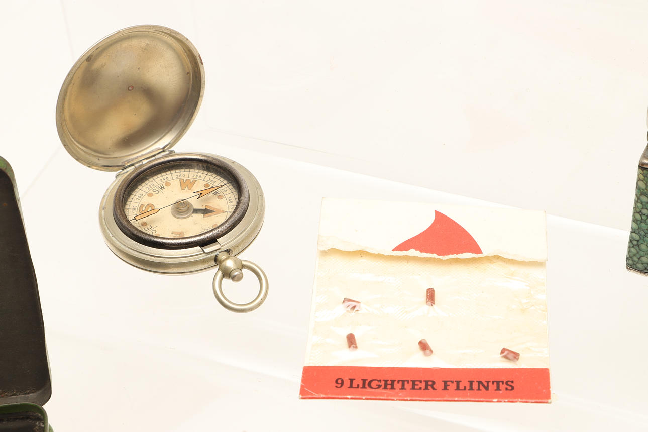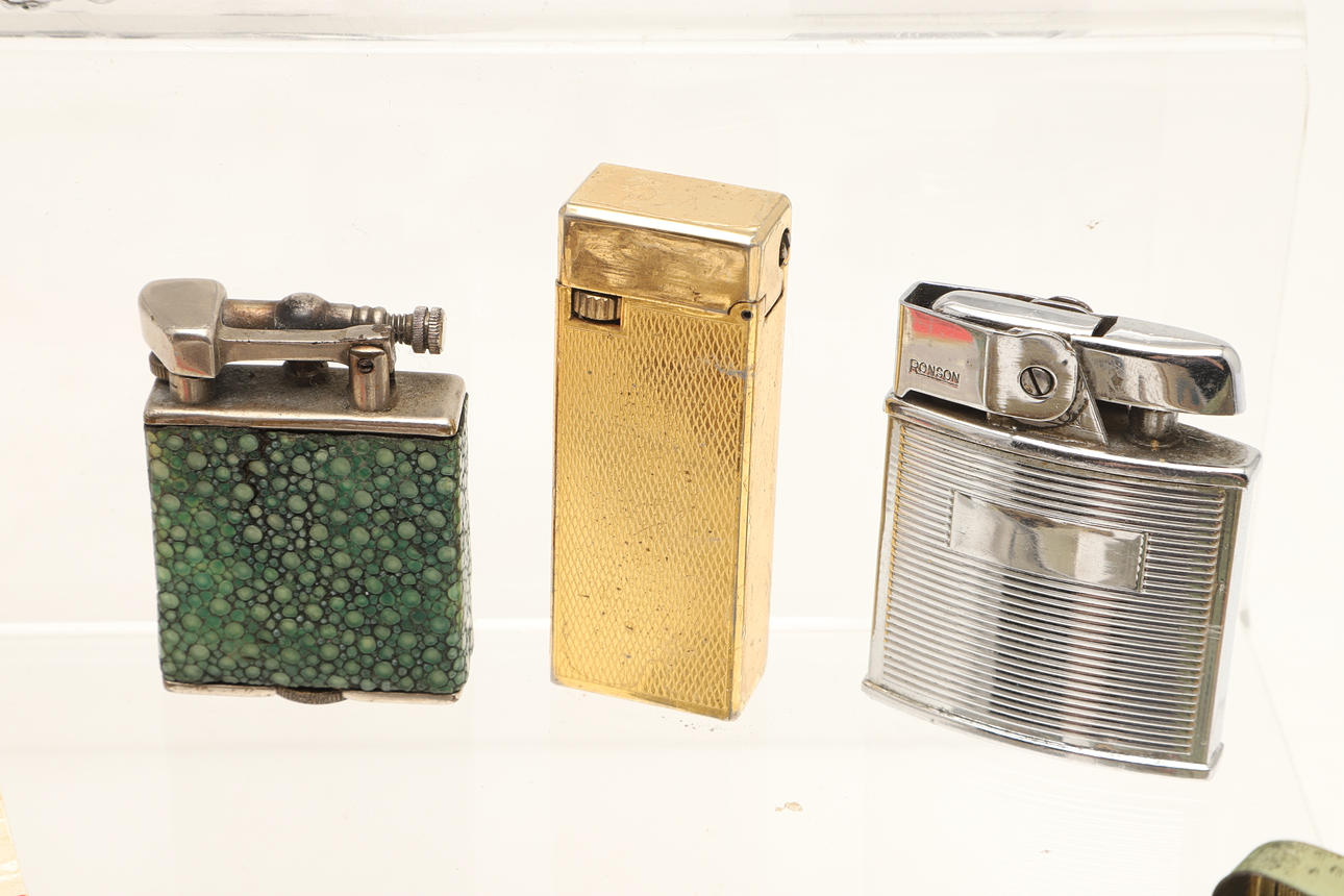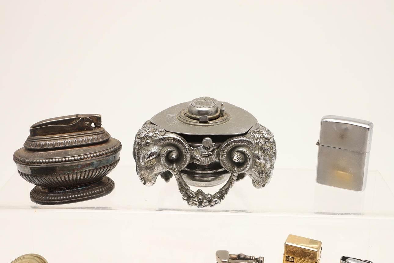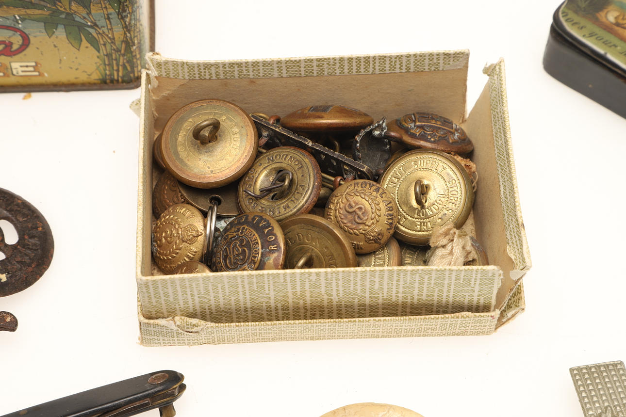 A mixed lot including a variety of Military buttons and badges, a small lacquered snuff box (6.5cms long), various lighters, a metal inkwell with rams head design (7cms high).