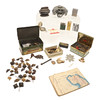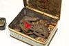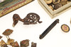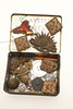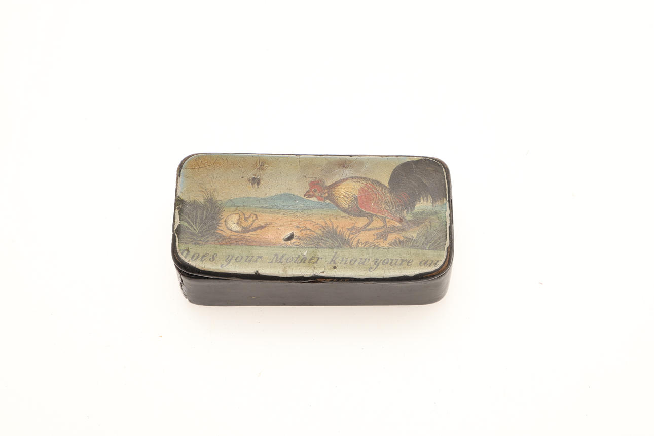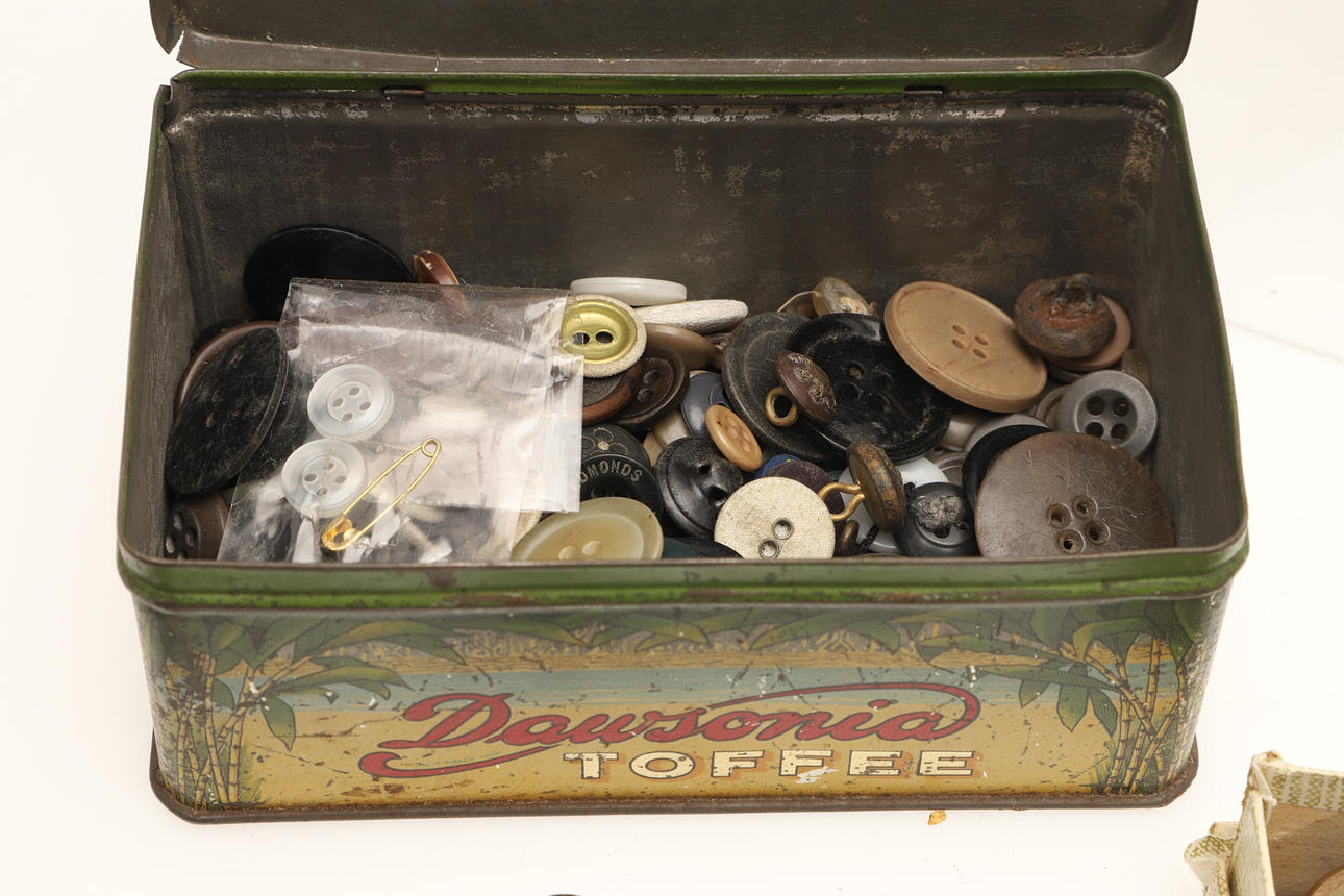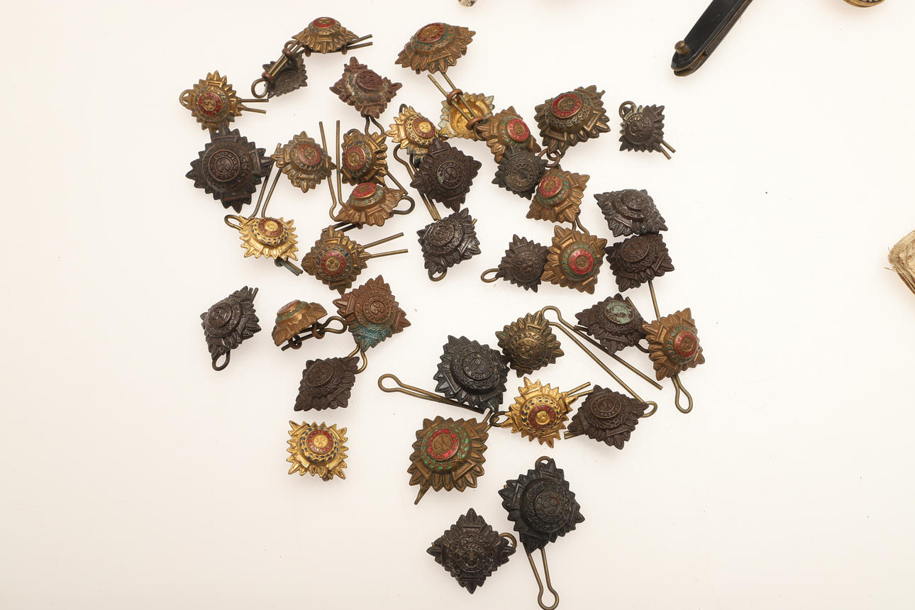 A mixed lot including a variety of Military buttons and badges, a small lacquered snuff box (6.5cms long), various lighters, a metal inkwell with rams head design (7cms high).