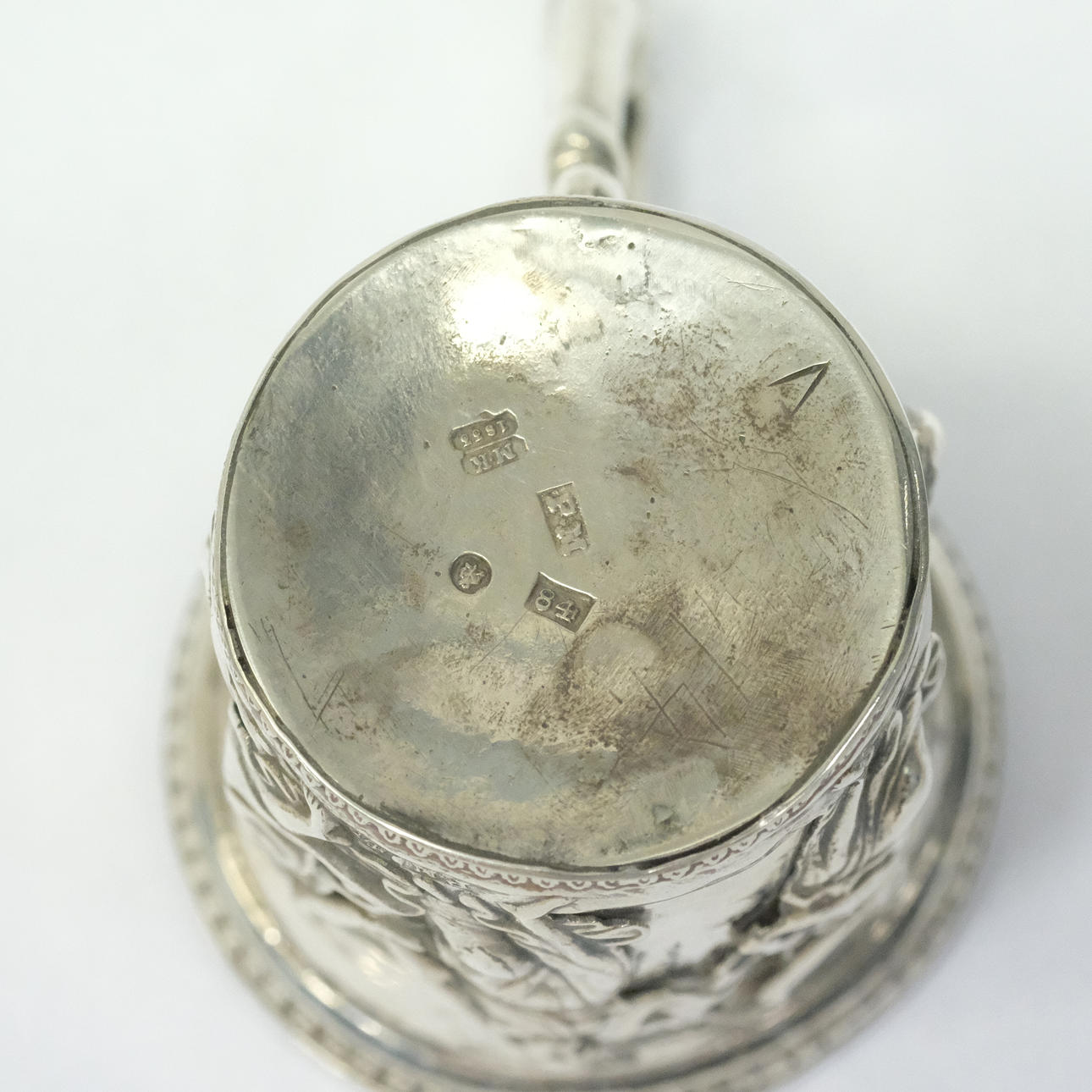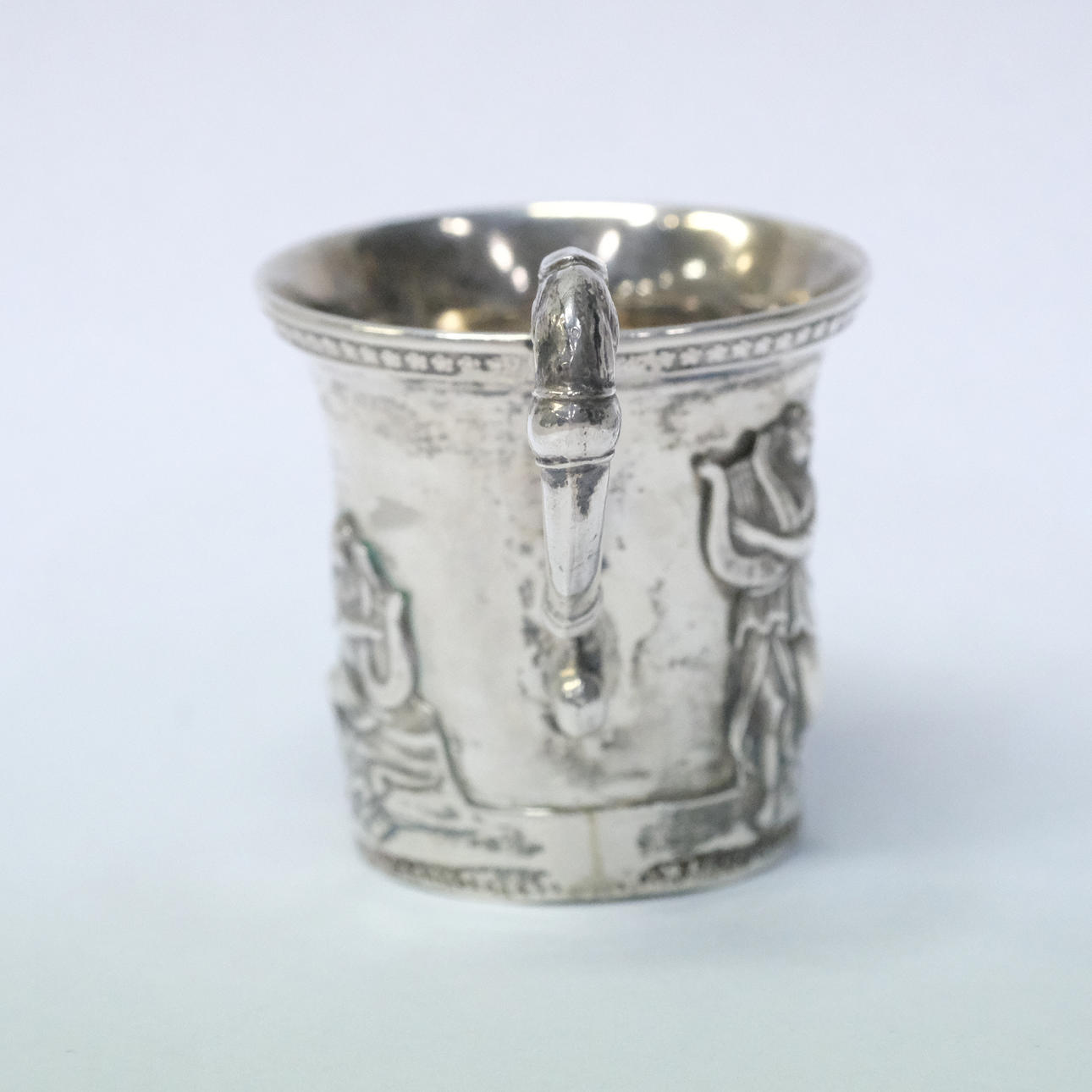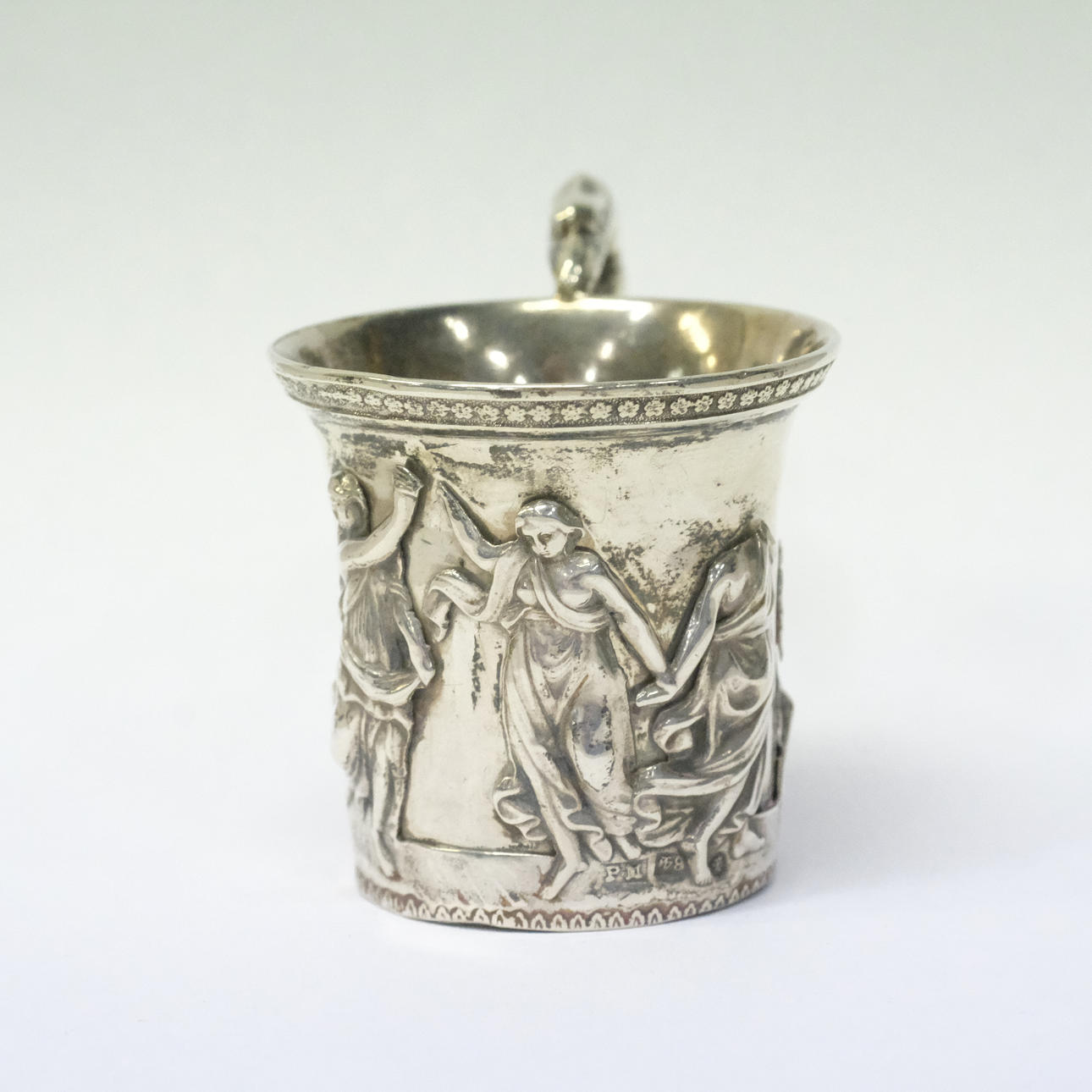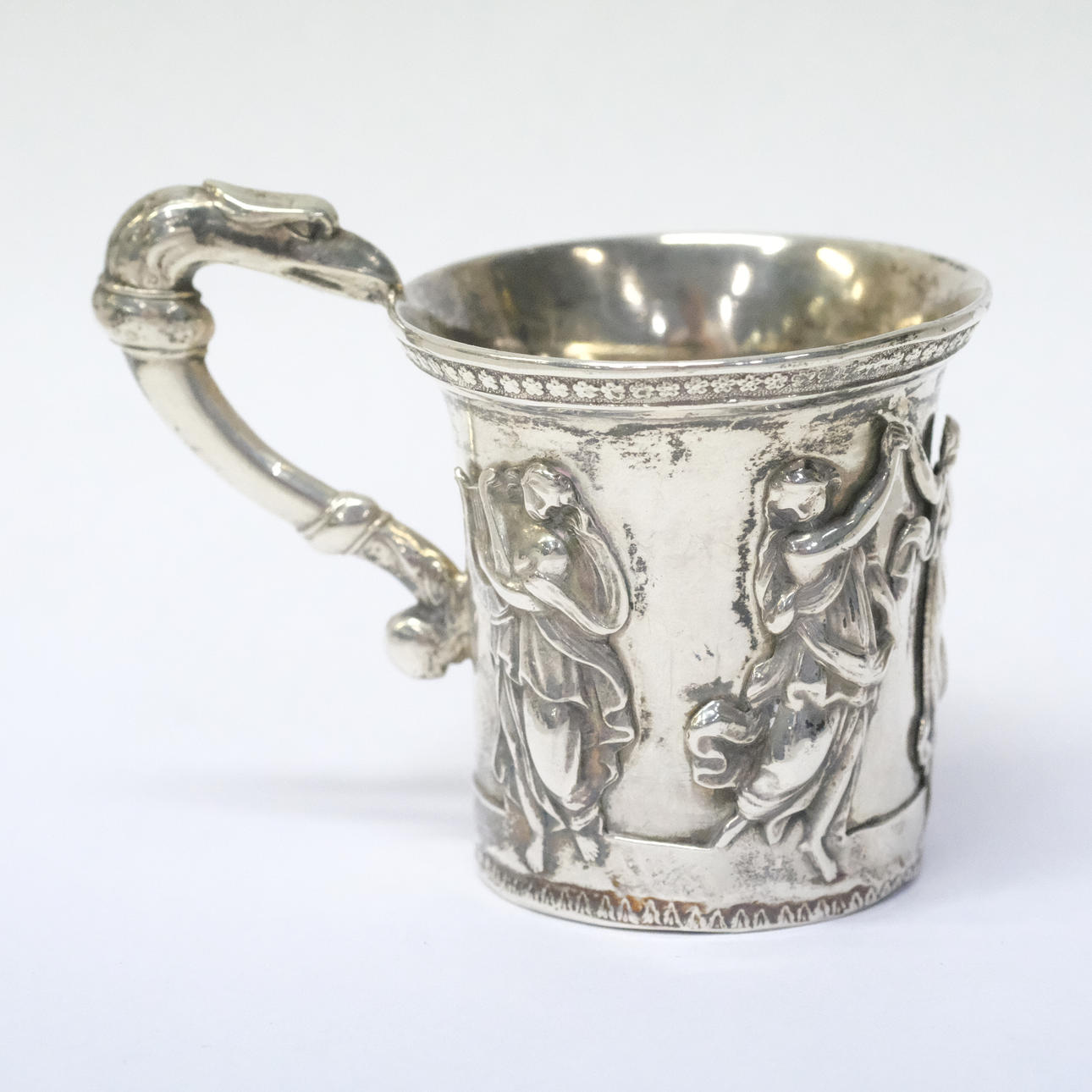 Silver, late empire, with flared mouth, life with soldered classicising female figures, pendant with bird's head, stamped St. Petersburg 1833, probe master Mikhail Mikhailovich Karpinsky, height ca 5,5 cm, weight 44,4 grams.