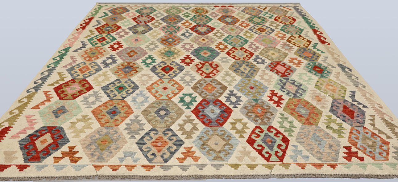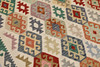 Hand-woven Kelim in classic design with bright bottom color and geometric pattern in polychrome color scale.