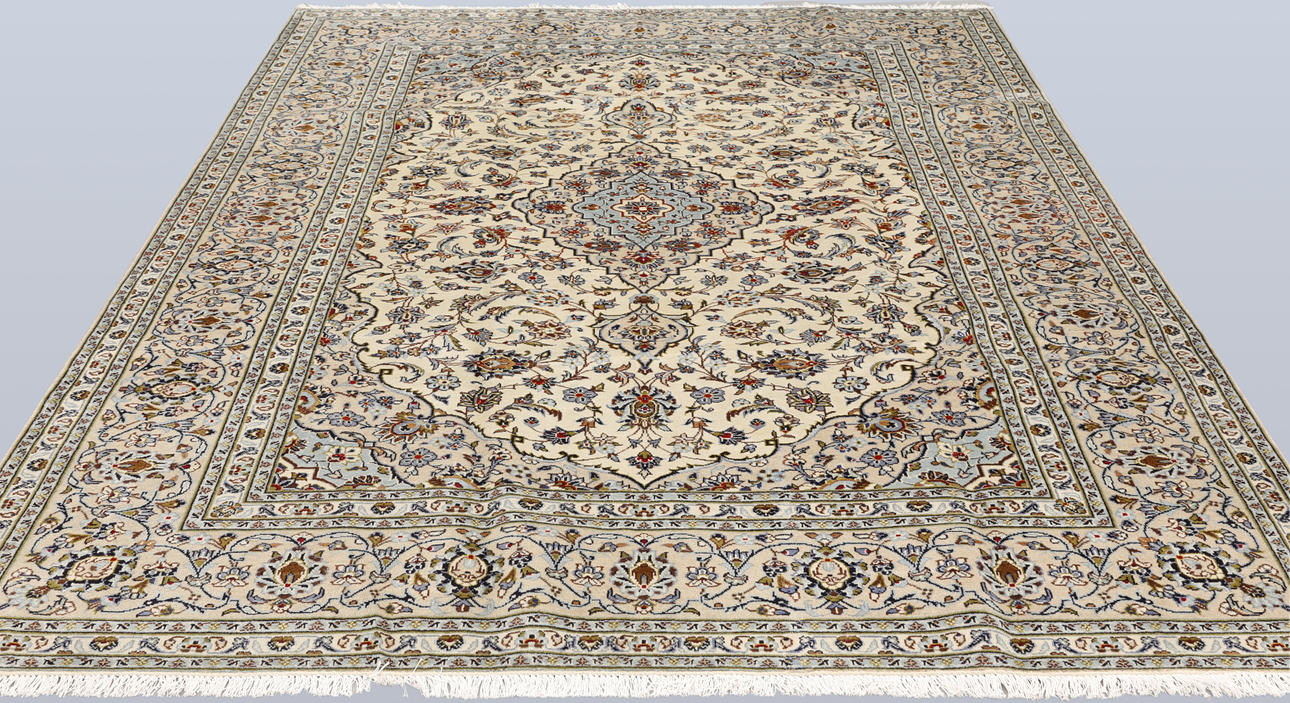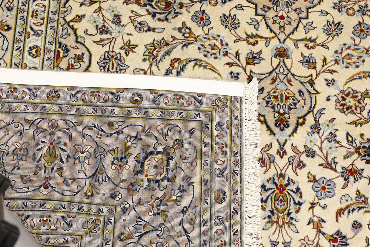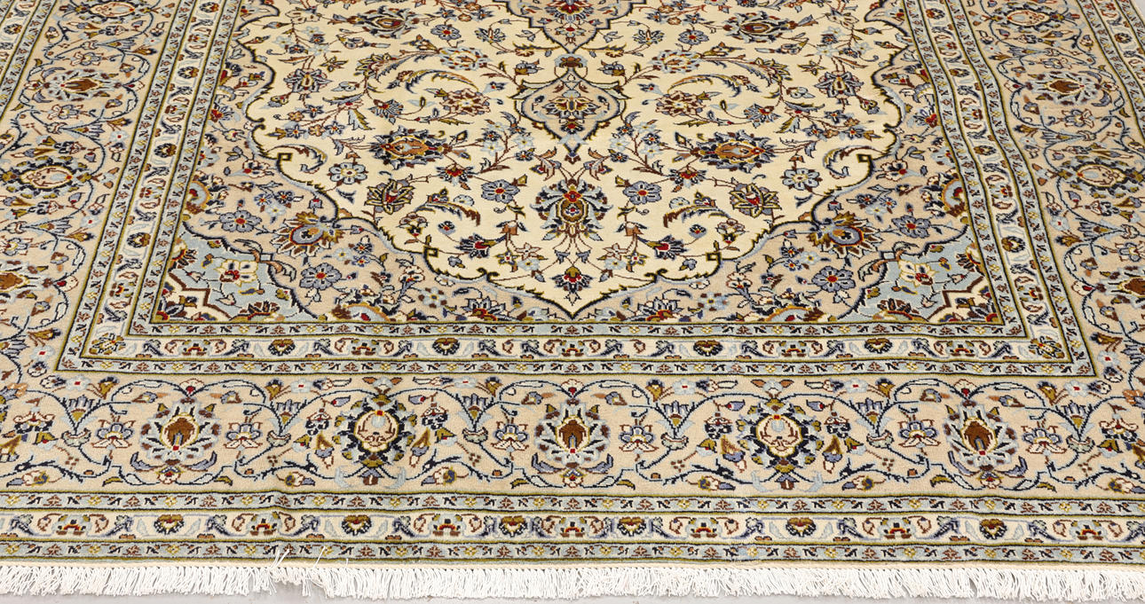Keshan with bright bottom color and a centrally placed medallion with details in blue, beige and red. The center field is covered in floral ornamentation in similar shades, and the corner portions follow the same pattern structure. The border has a beige base and consists of repeated floral motifs. The forelock is made of wool and the warp is of cotton.
