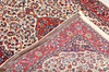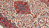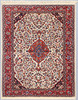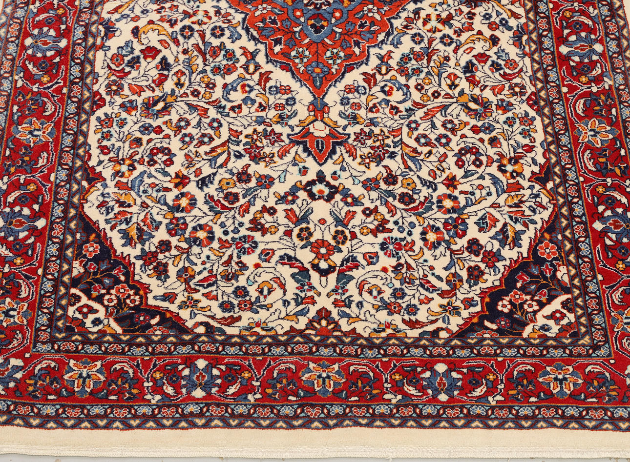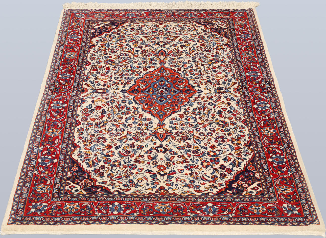 Saruk with bright bottom color and a central medallion in red and blue. The center field is decorated with stylized plant decor, framed by a red border with repeated floral motifs. The forelock is made of wool and the warp is of cotton.