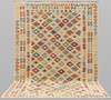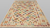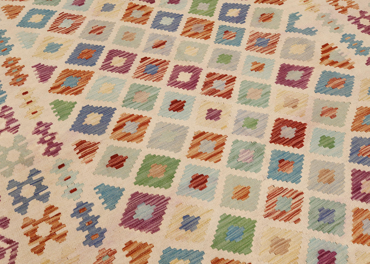 Hand-woven Kelim in classic design with bright bottom color and geometric pattern in polychrome color scale.