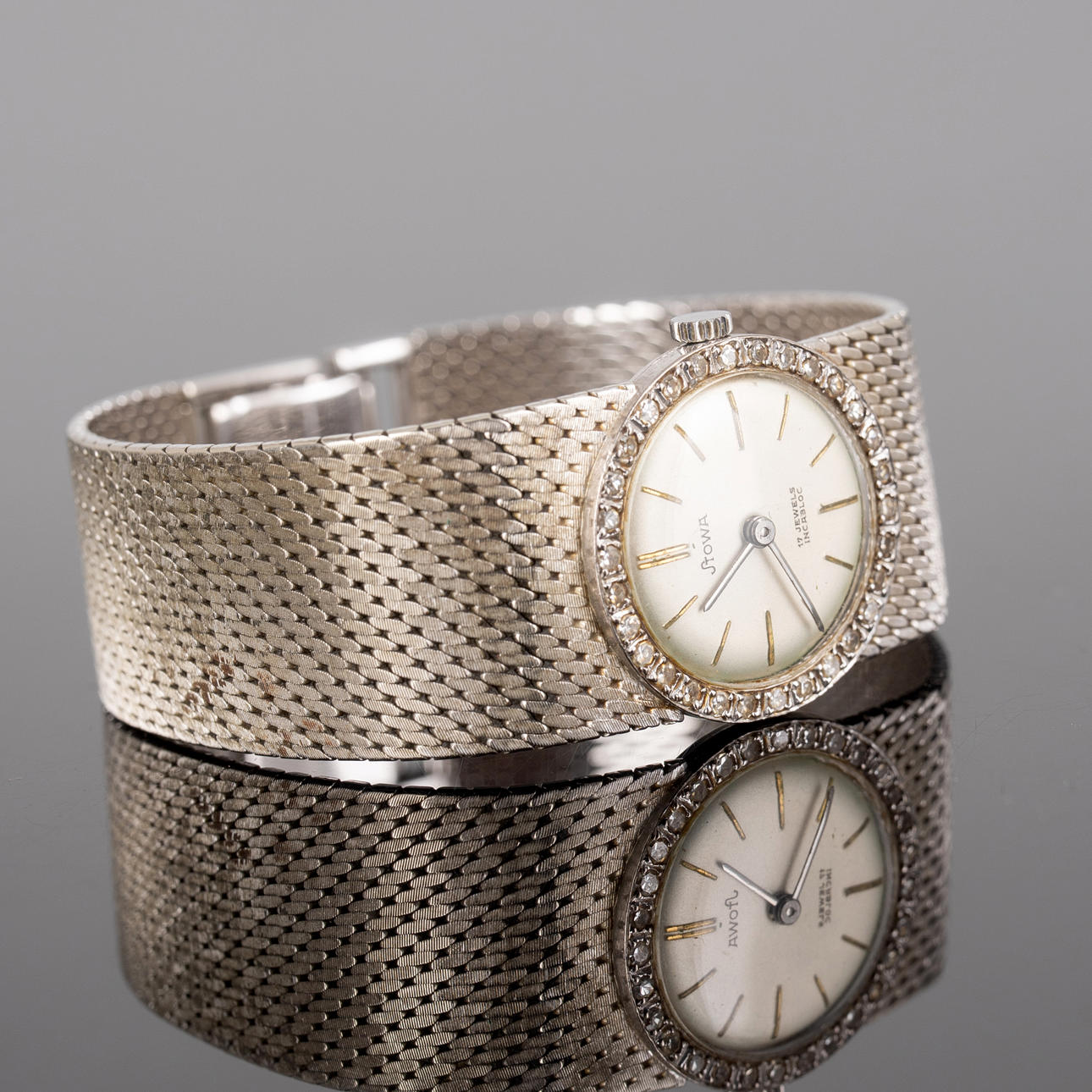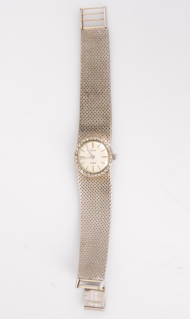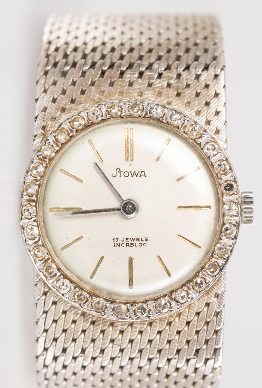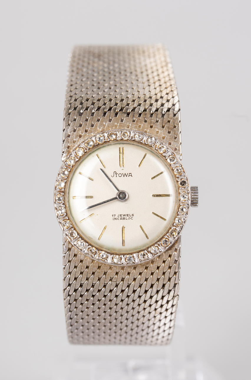 Stowa wristwatch, hand wound, made of 585 white gold, case set with diamonds, dial with minute and hour hands, dimensions approx. Case diameter 23 mm, length 17 cm. Weight ca. 48.5 grams The clock was running at the time of the review, Stockholm's auction shop does not guarantee functionality.