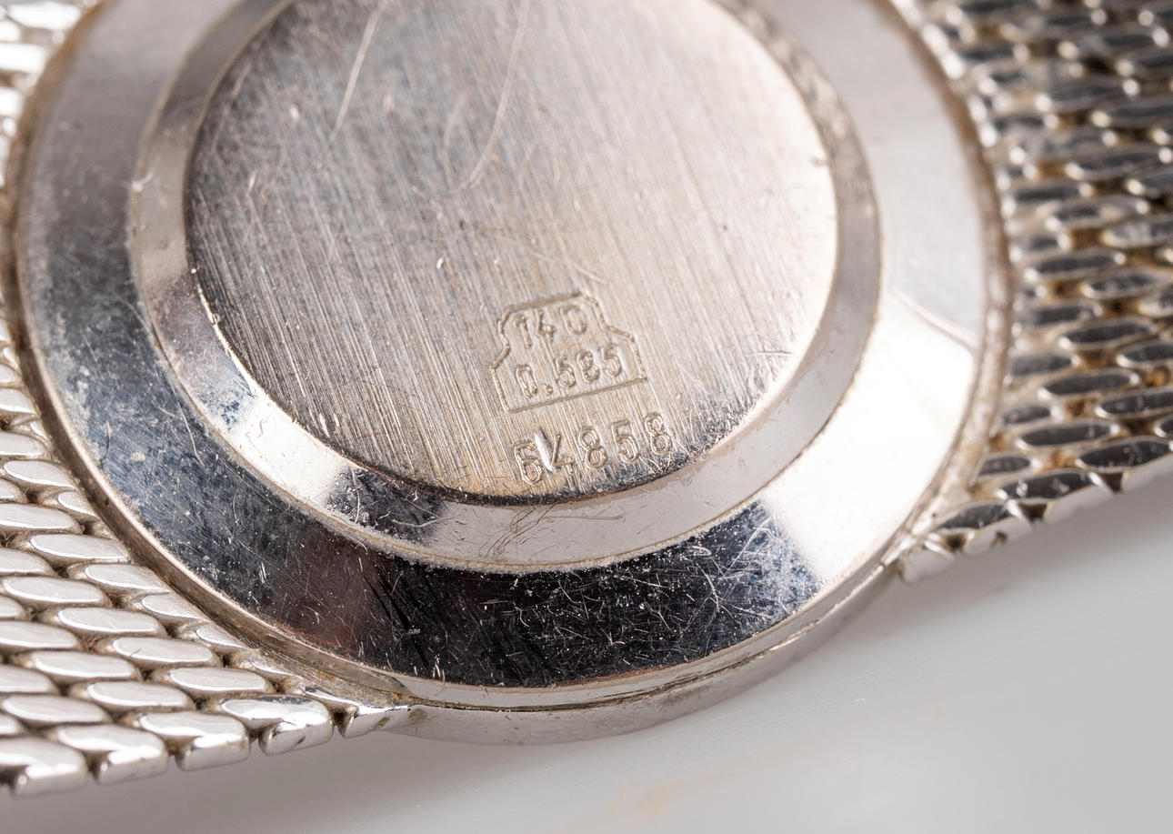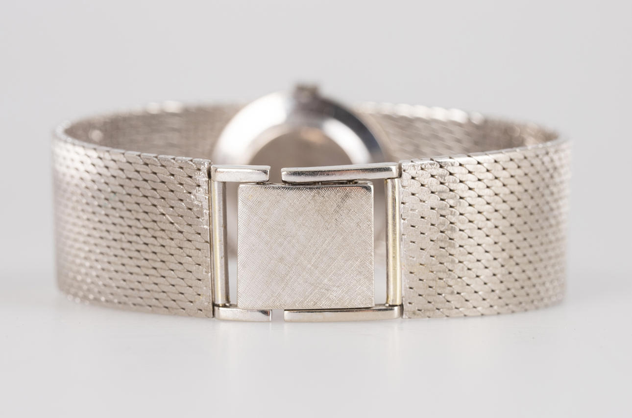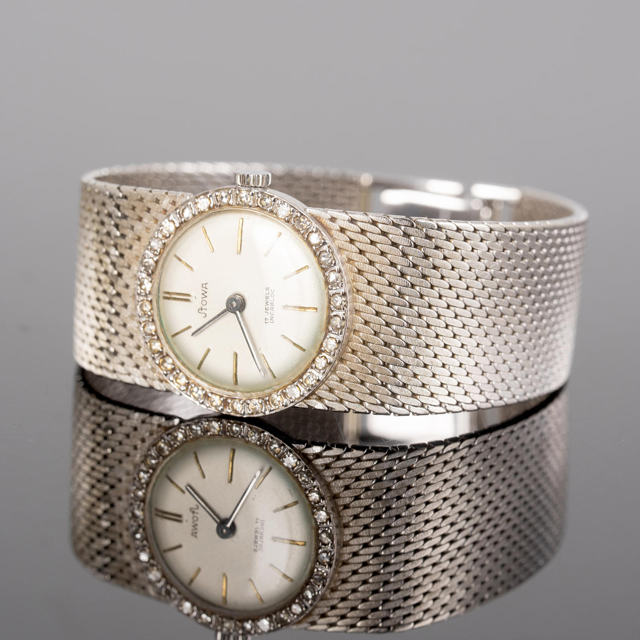 Stowa wristwatch, hand wound, made of 585 white gold, case set with diamonds, dial with minute and hour hands, dimensions approx. Case diameter 23 mm, length 17 cm. Weight ca. 48.5 grams The clock was running at the time of the review, Stockholm's auction shop does not guarantee functionality.