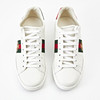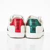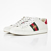 Sneakers in white leather, heel with green and red snakeskin-colored leather, detail in the side of green red ribbon with embroidered bee, shoelaces in white textile, included shoebox, shoe bags, new shoelaces and fabric straps, size unisex size 39 1/2, shoe length approx. 28.5 cm.