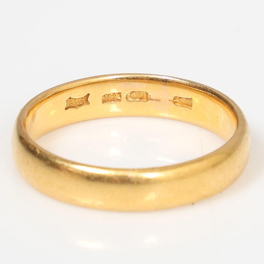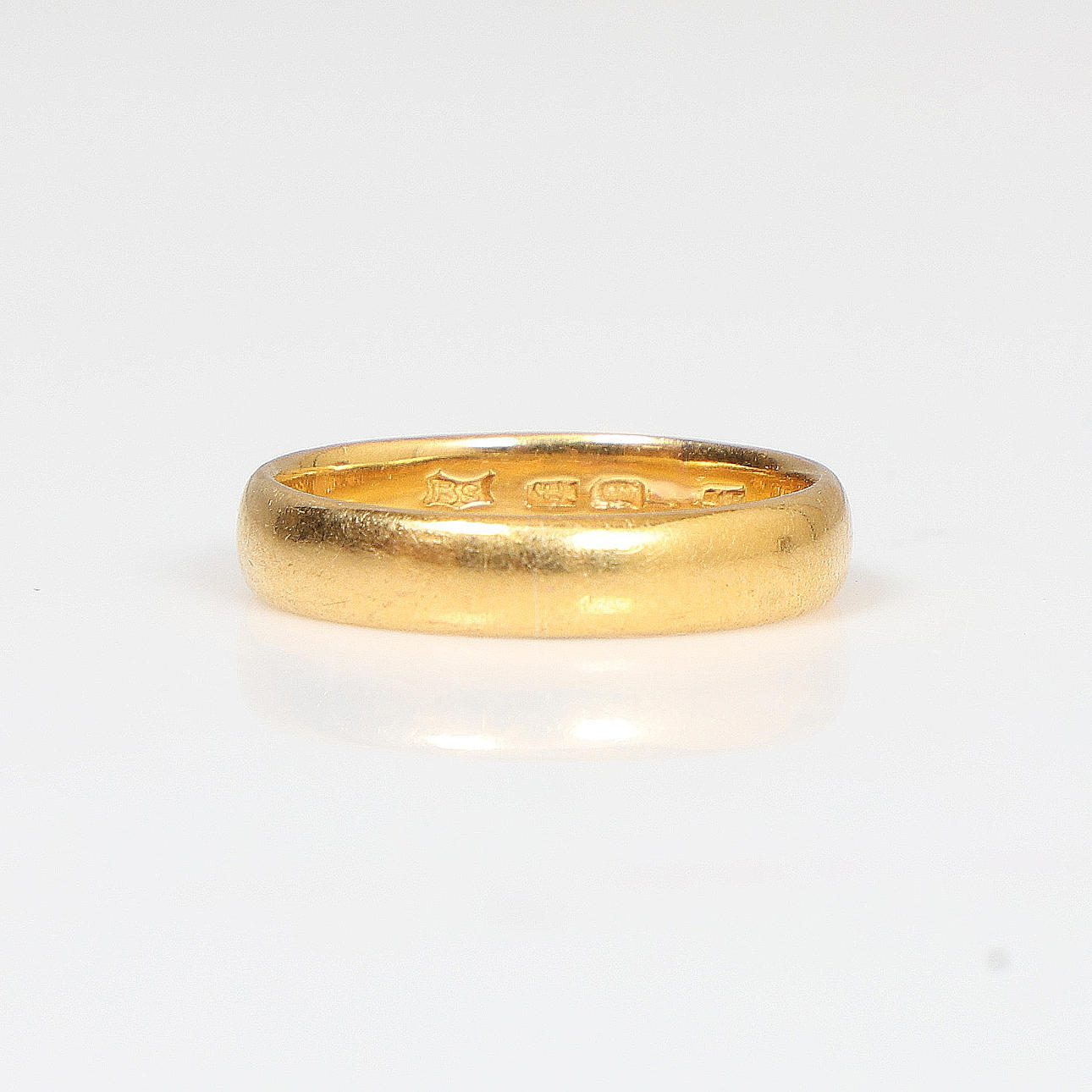 The interior of the band with hallmarks, purity mark rubbed, ring size L 1/2, 4.2g.