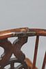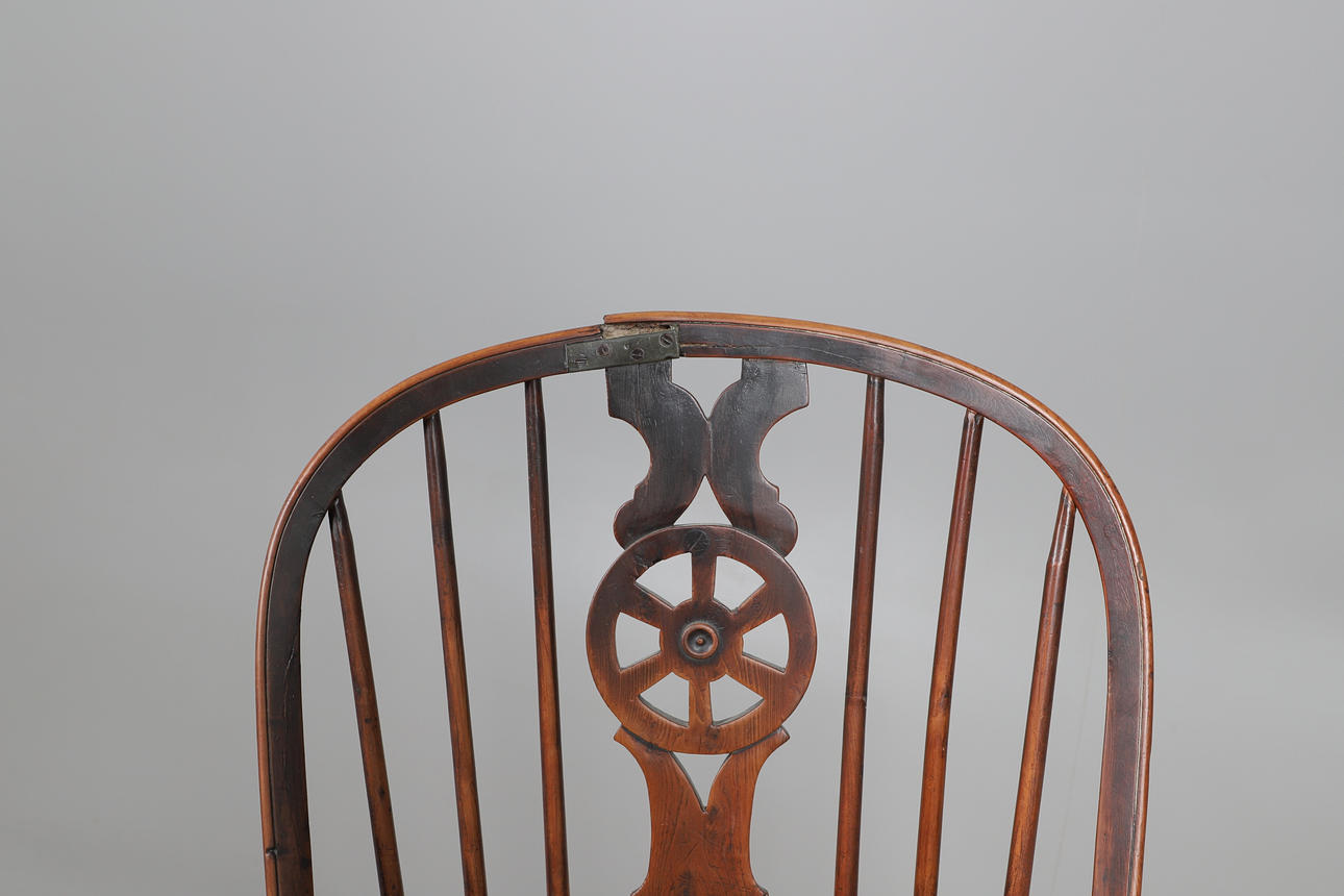 A yew wood and elm windsor chair, with a saddle shaped seat and wheel shaped splat. 102cms high.
