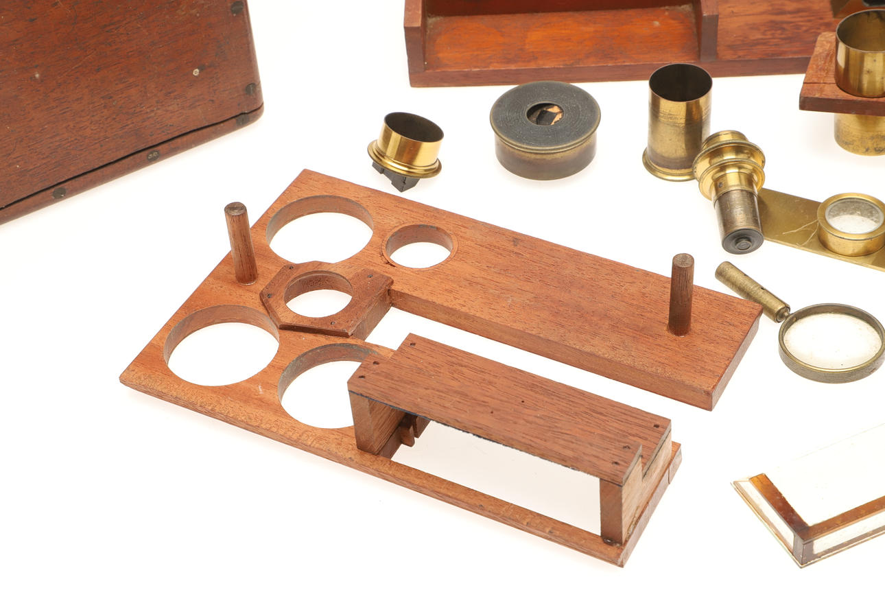 A Smith & Beck monocular microscope, attached to a wooden base which folds down inside it's case. With a variety of lenses and accessories and in a fitted mahogany case. Case 30.5cms by 13.5cms.