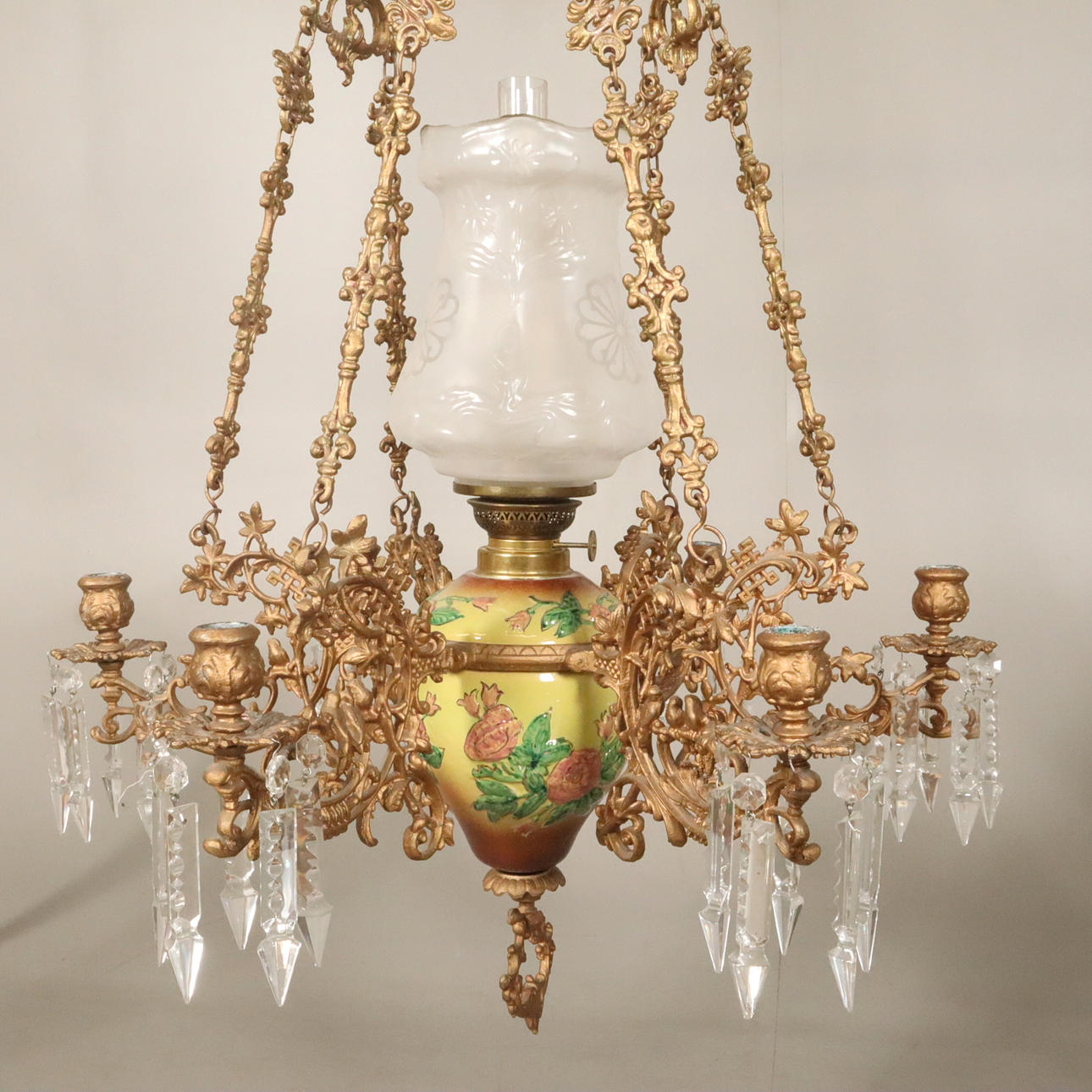 HANGING KEROSENE LAMP, majolica style.