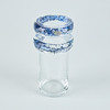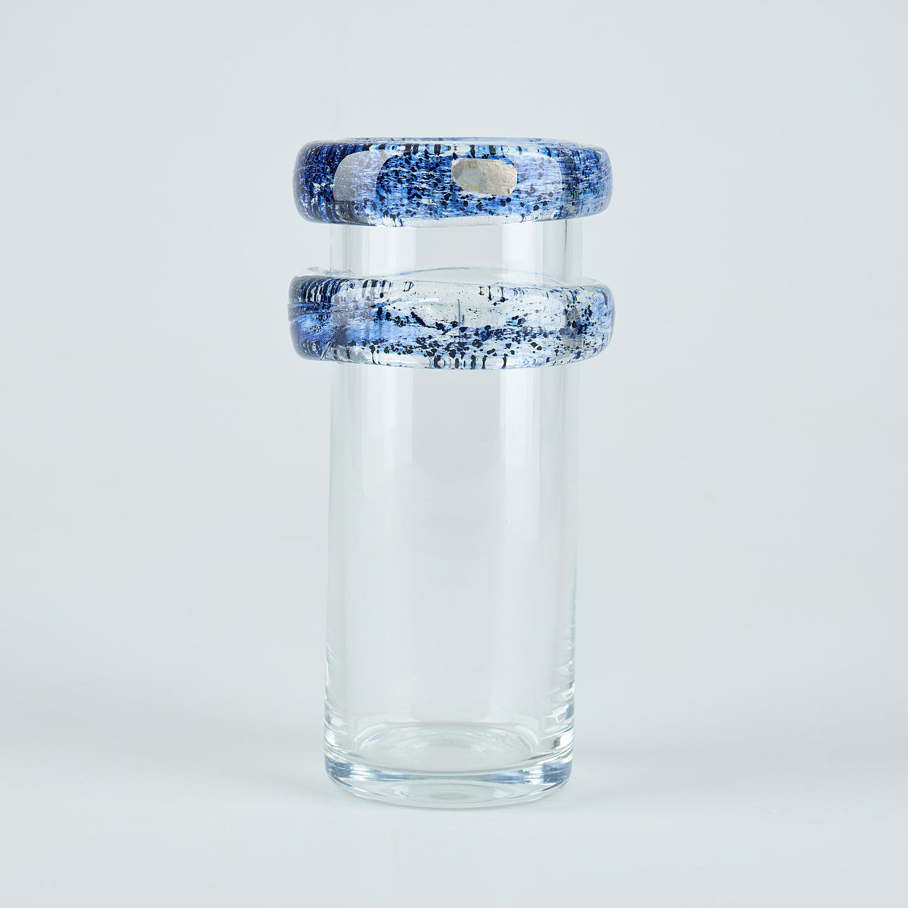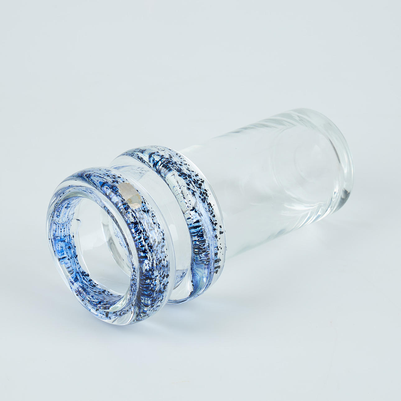 Clear and blue glass. Height 20 cm, diameter 9.5 cm.