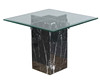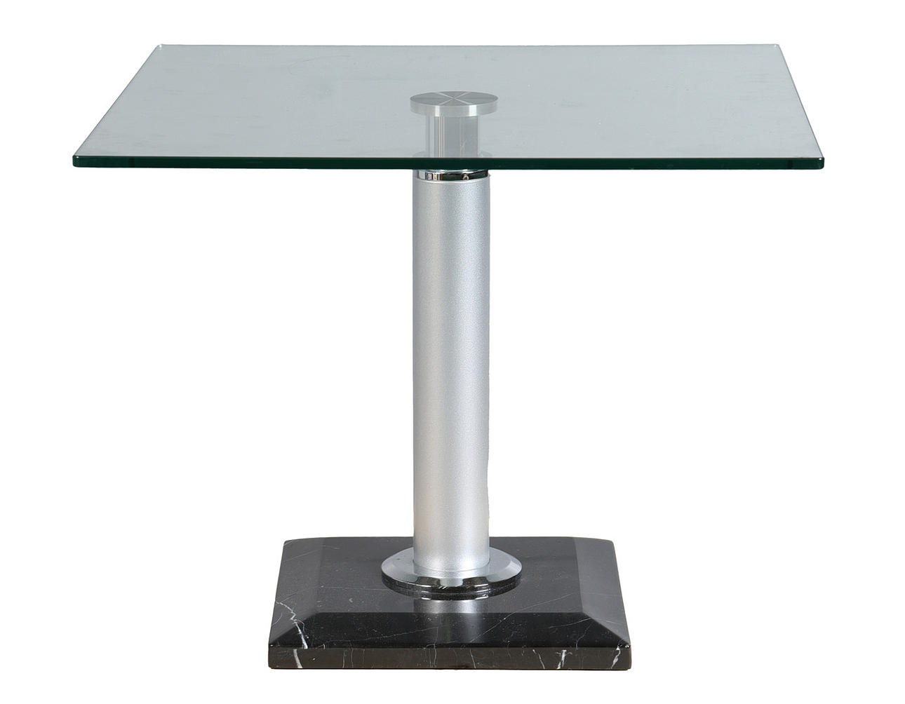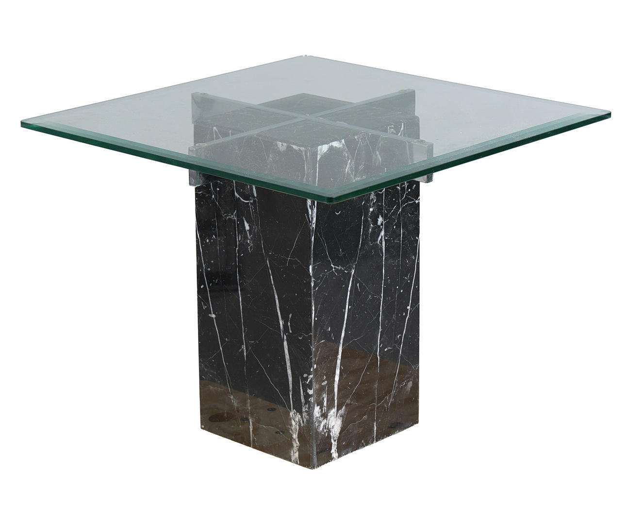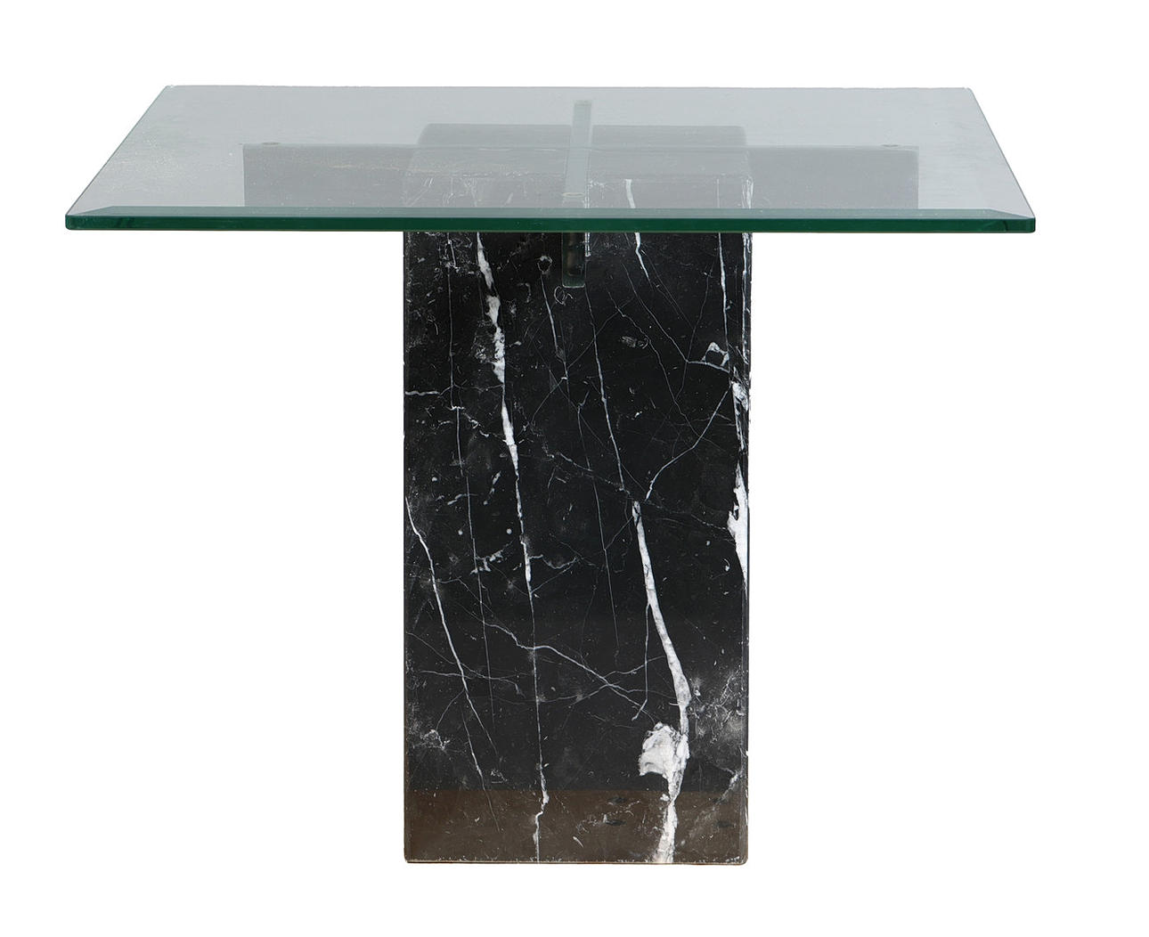 The circa 1970's/ 80's coffee table by Artedi, the bevelled glass top above a black marble base with chromed supports, 51cm height, top measures 65cm x 65cm, together with a side table by Artedi, the glass top above a black marble and chromed cylindrical base, 48cm height, top measures 60.5cm x 60.5cm. (2).