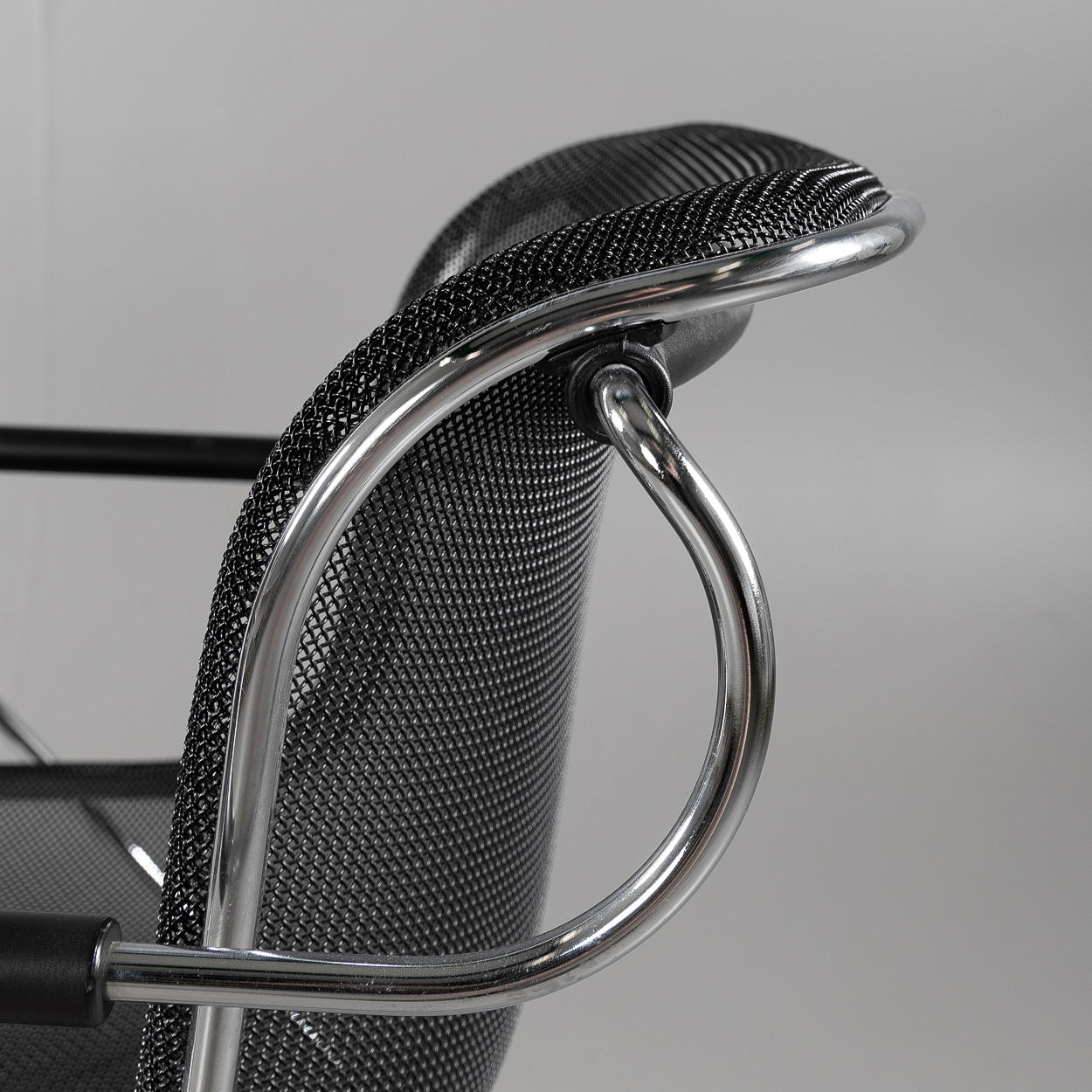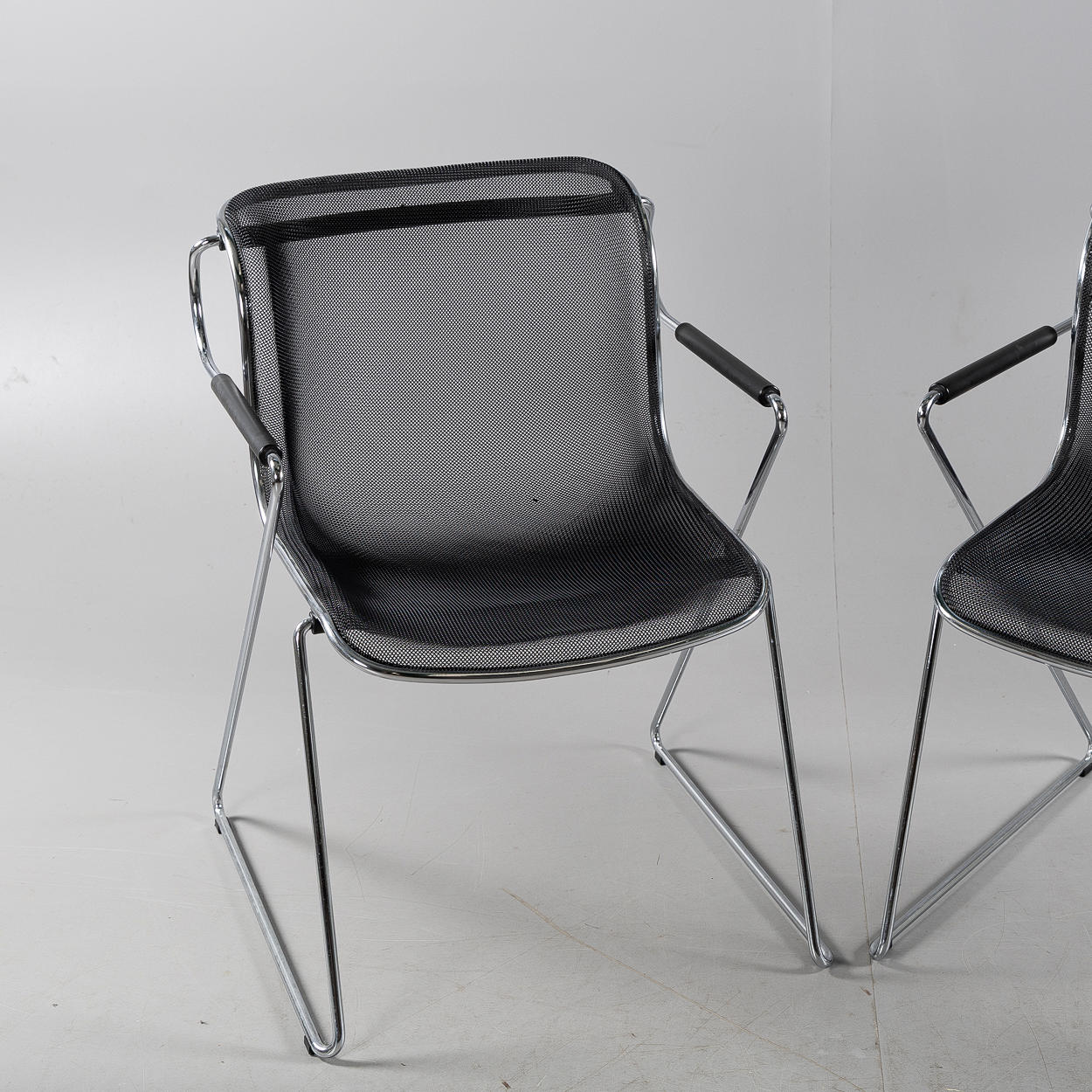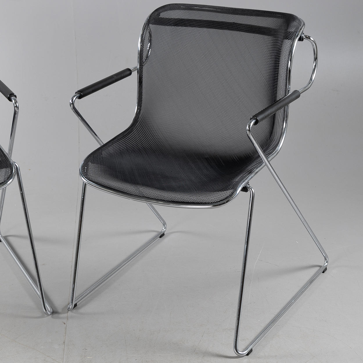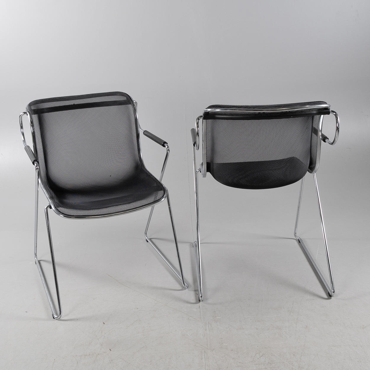 Chromed metal construction, seat and back in wire mesh. Height 81 cm, width 57 cm, depth 62 cm.