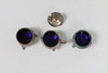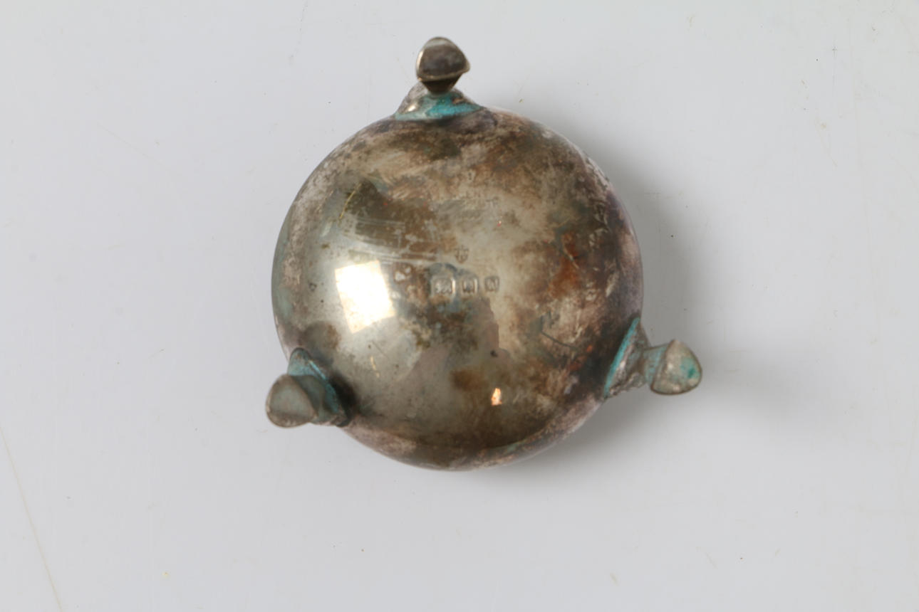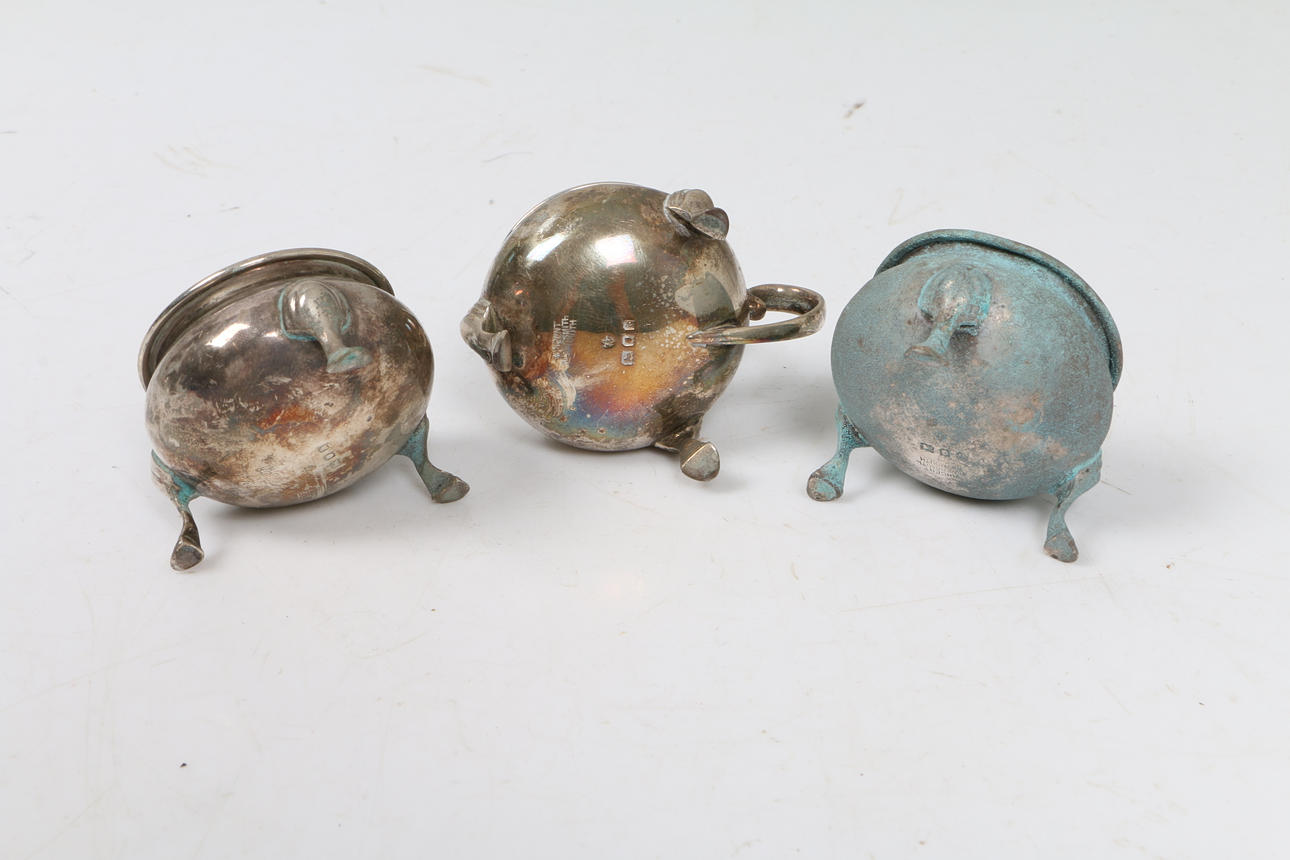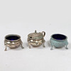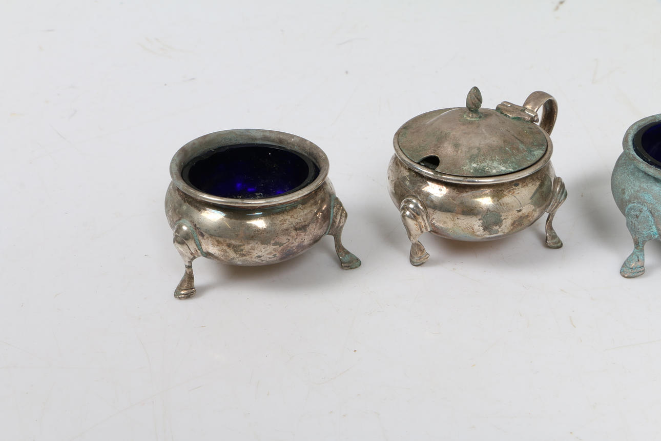 by Edward Barnard & Sons Ltd, London 1923, comprising of two salt pots and mustard pot, with blue glass liners, horse hoof feet designs, 3.5cm high and 4.5cm wide, silver weight 3.59oz (3).