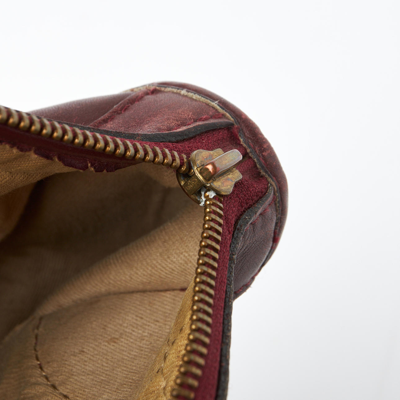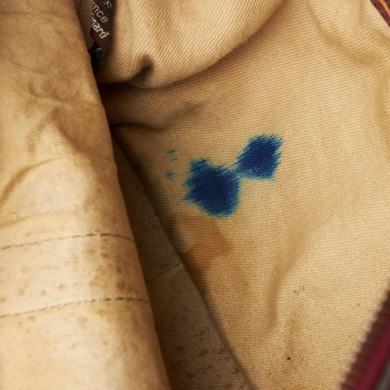 Outside wear leather edges, inside with stains larger stain of ink, zipper missing part, use wear.
