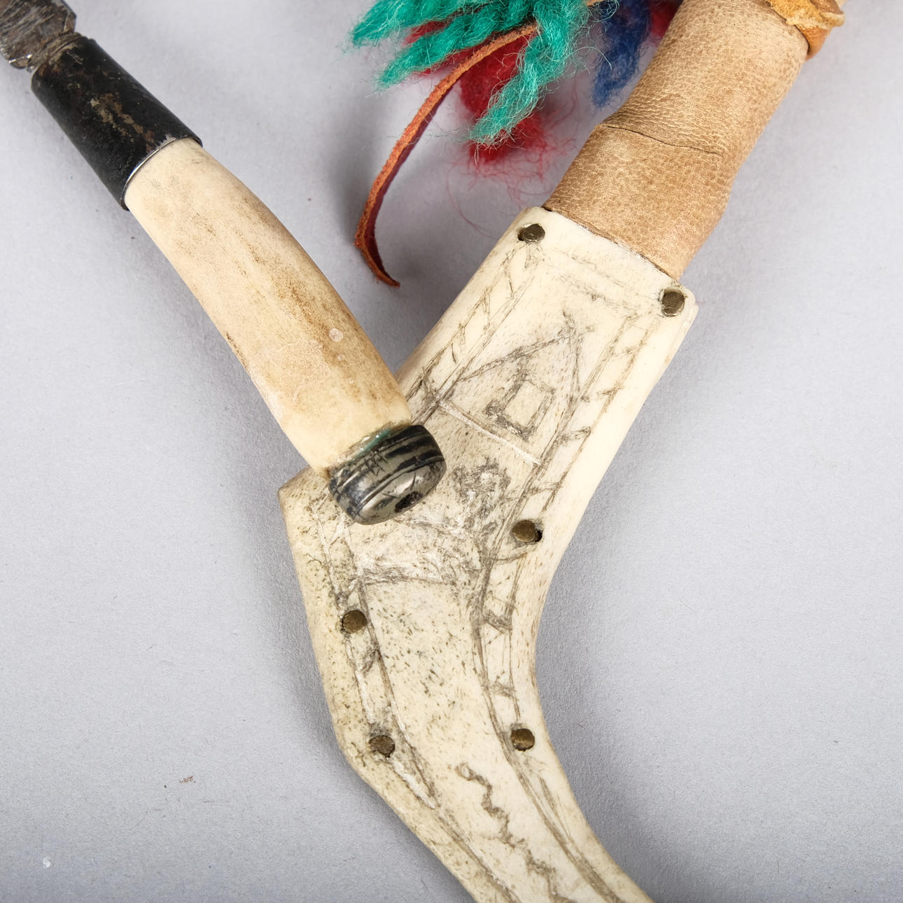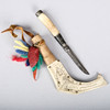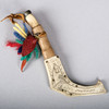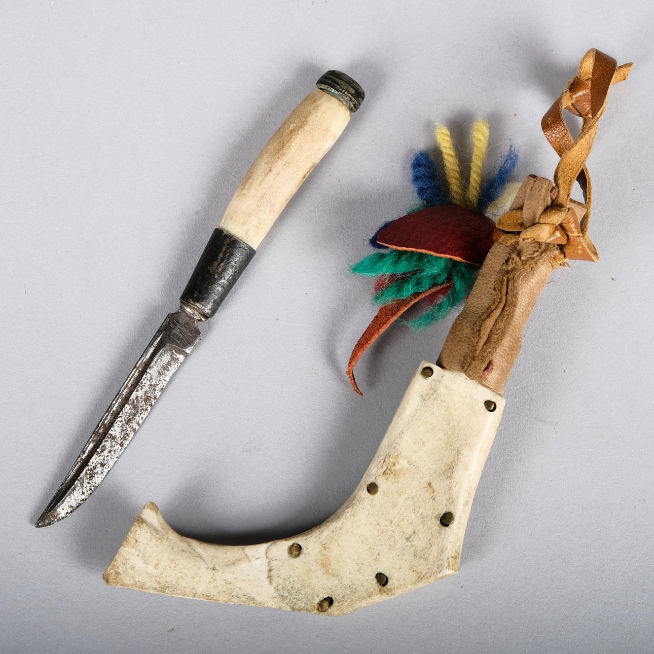 Made of leather and reindeer horns, It's unsigned. Knife length: 12,5 cm Length including sheath: 16 cm.