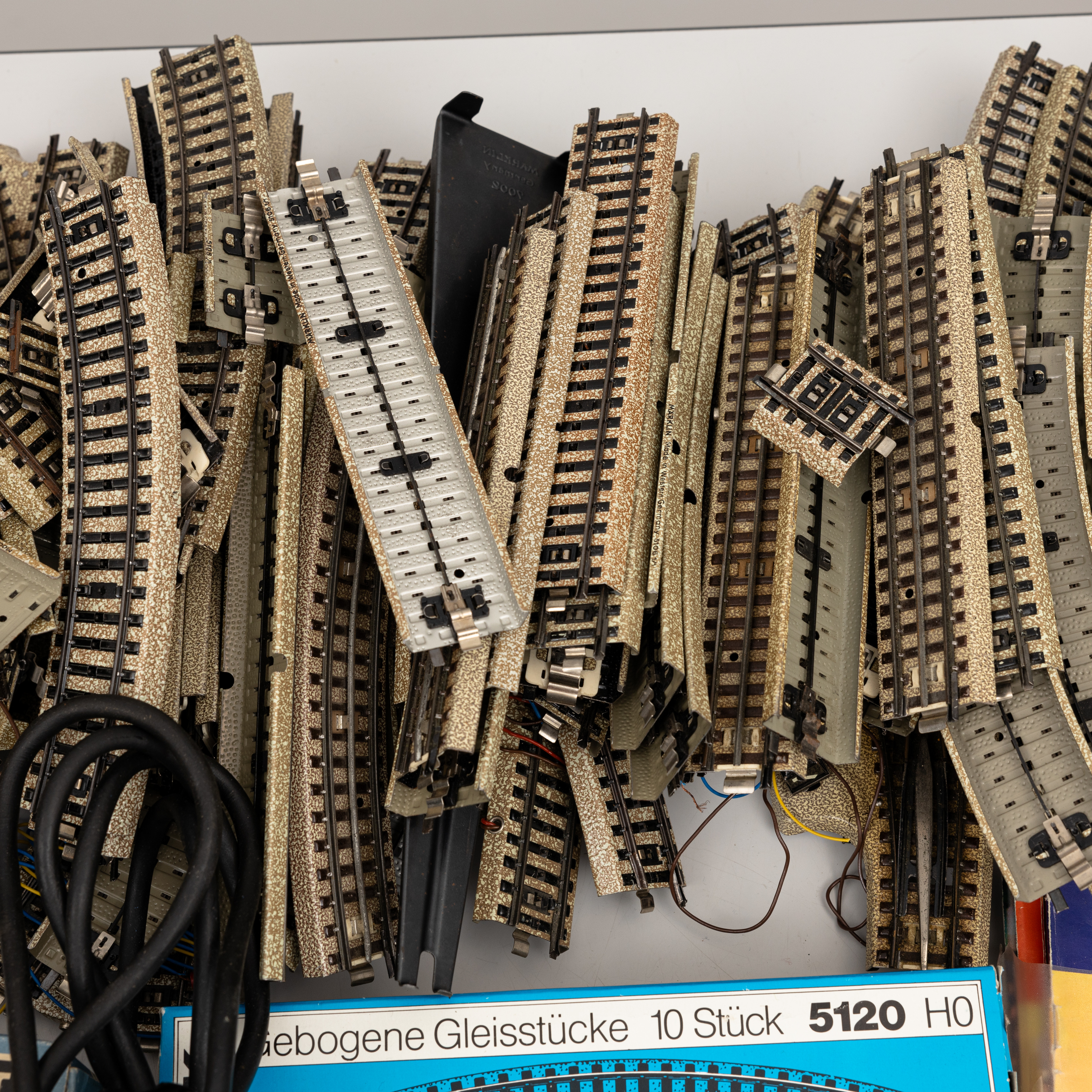 4489529. MÄRKLIN M-rail, electro double cross and 8 gears, 4 manual gears, crossing, stop bends, straight, curved, pass bits, catalogs and transformer.
