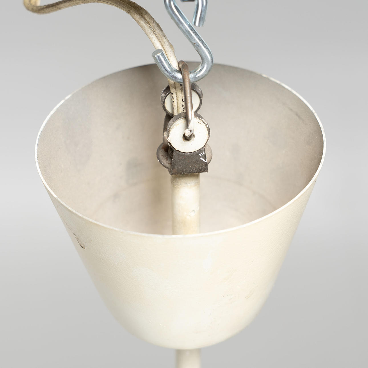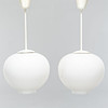 A pair of ceiling lights with opal glass.