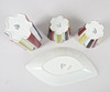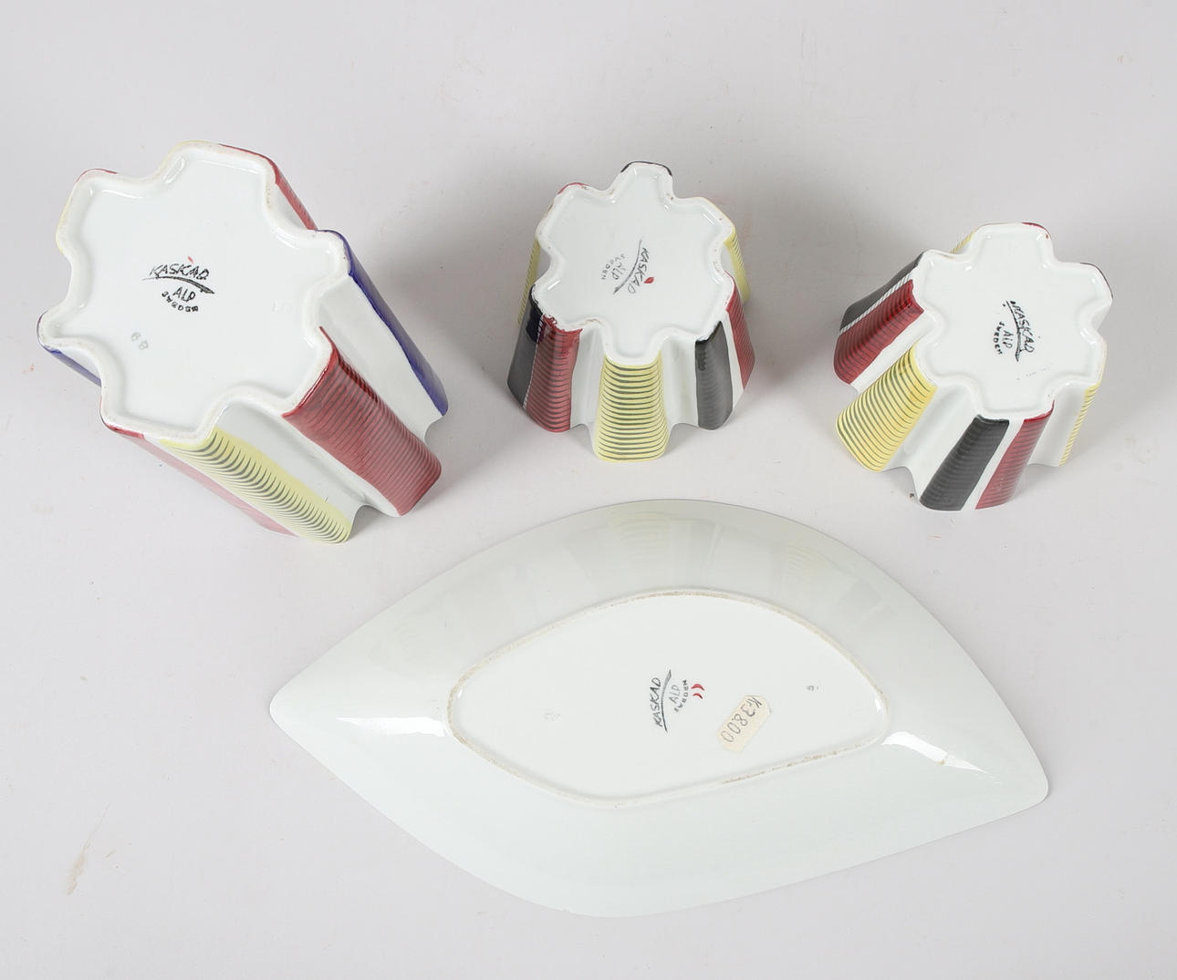 Condition of use. Surface dirt. Two edge chips on the dish. Glaze defect on the vase and one bowl.