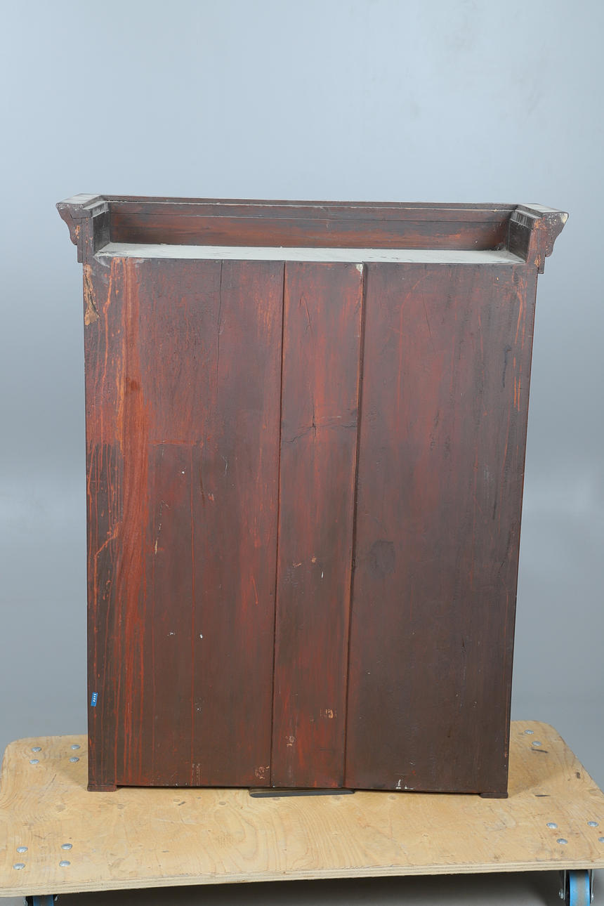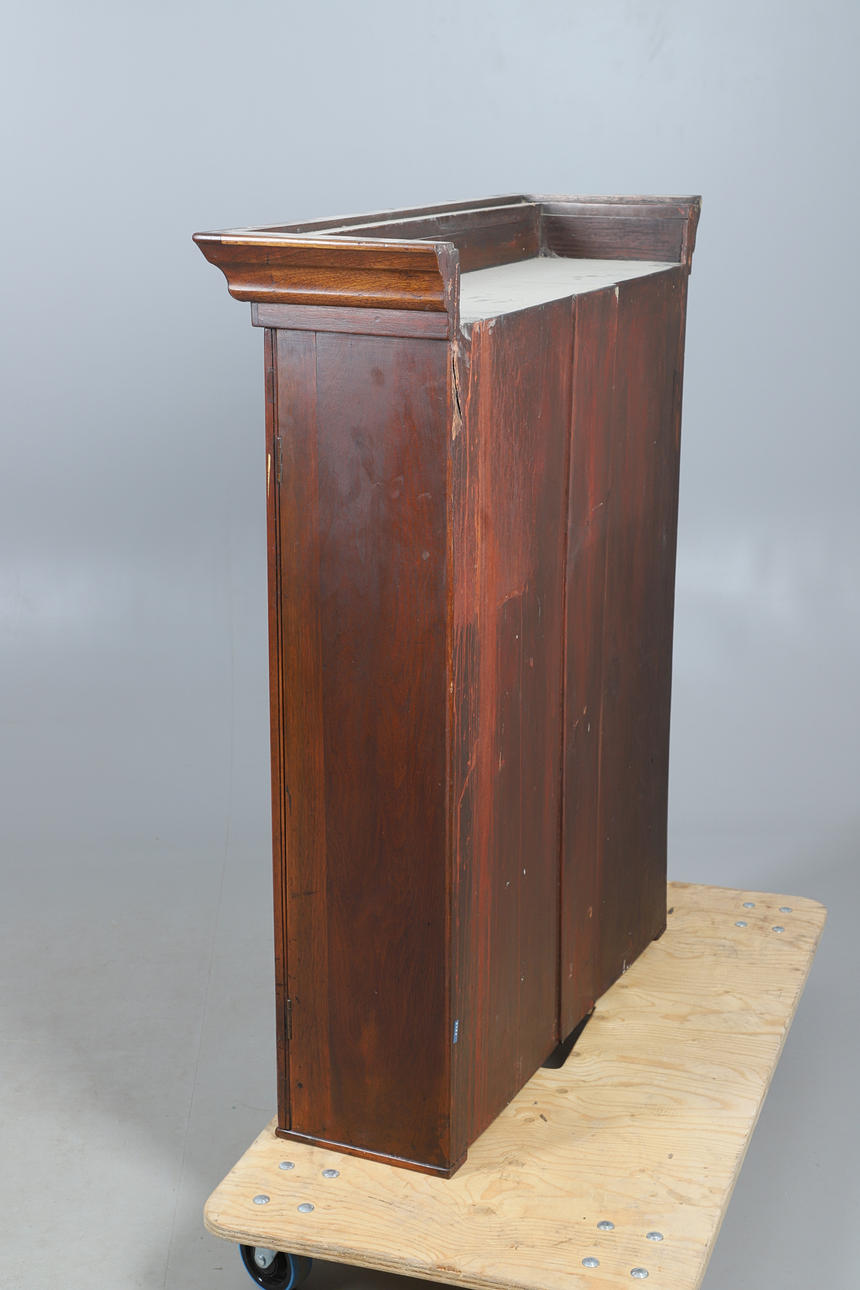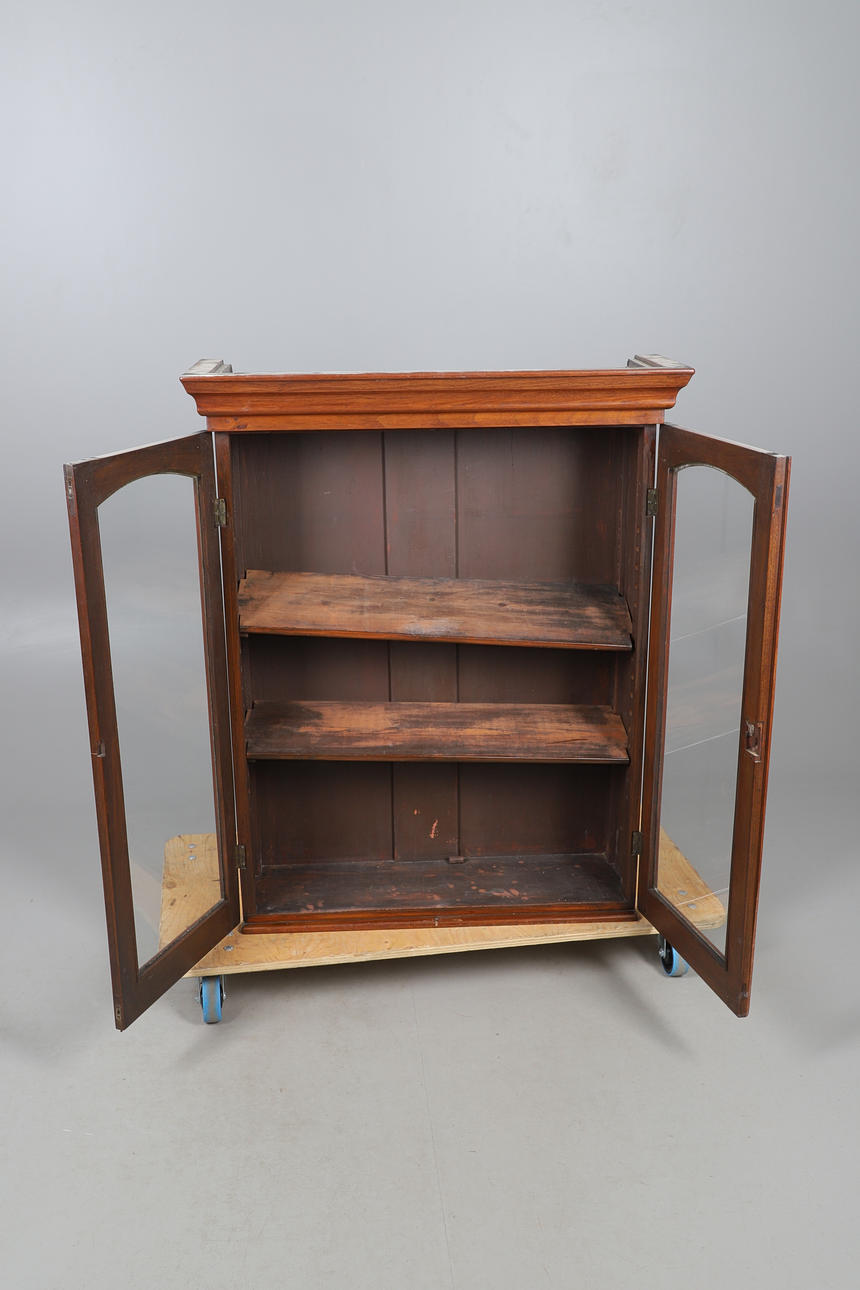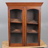 The two glazed doors opening to reveal 2 adjustable interior shelves. Height 115cm, width 92cm, depth 30cm.