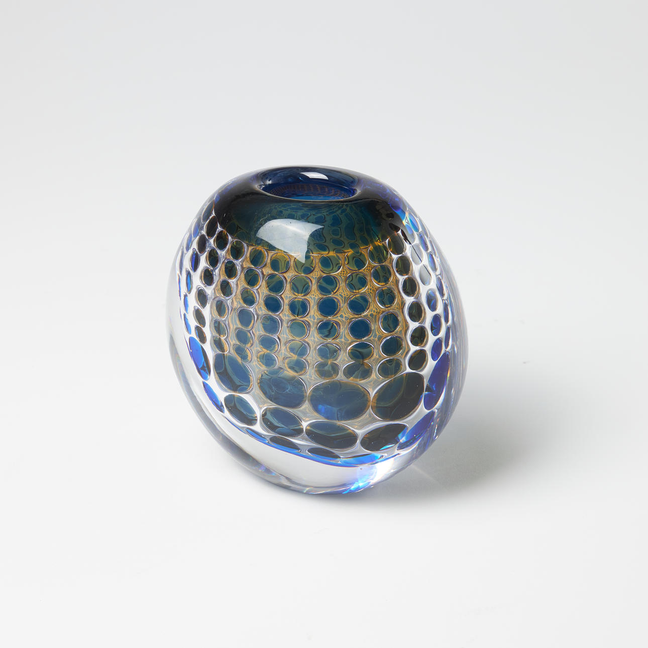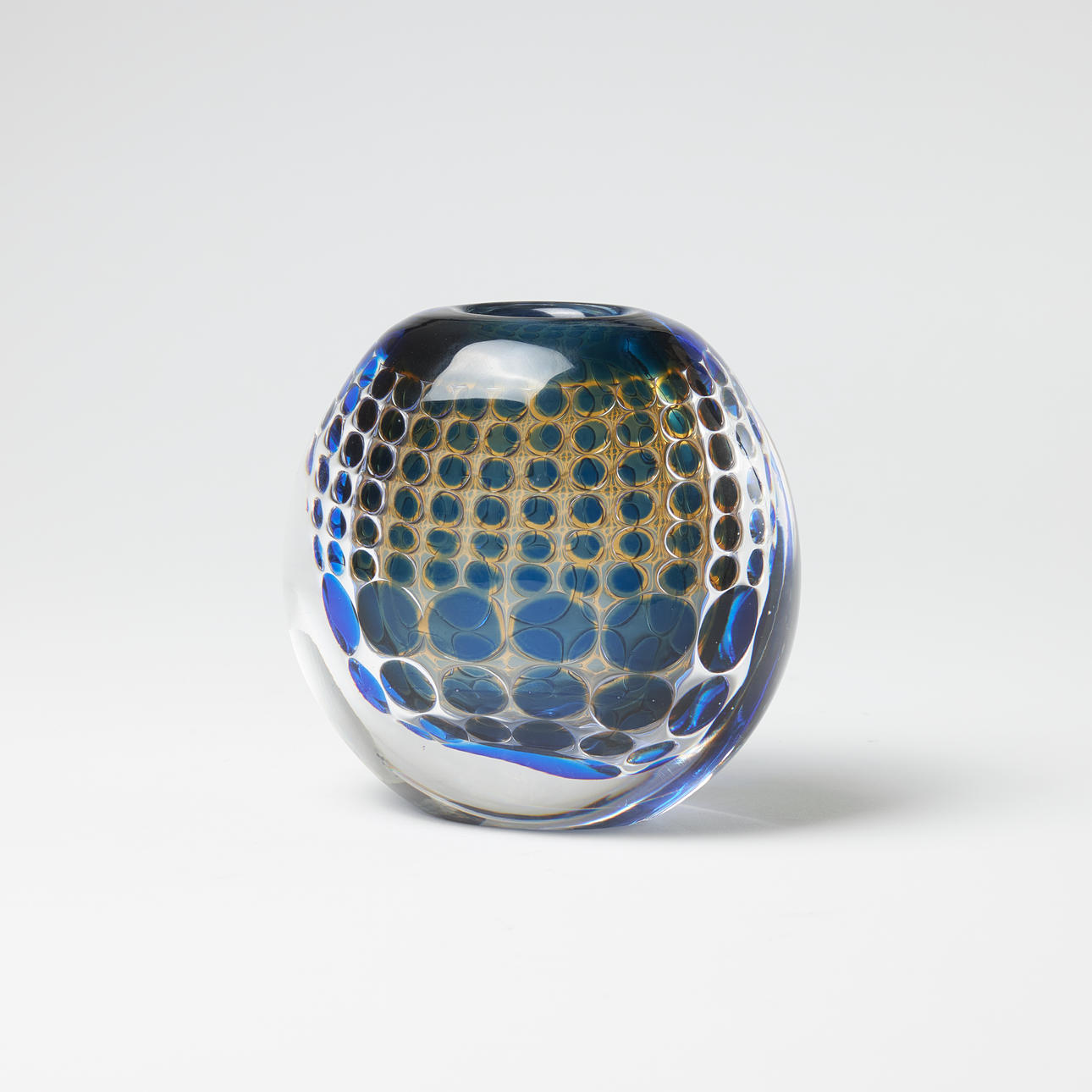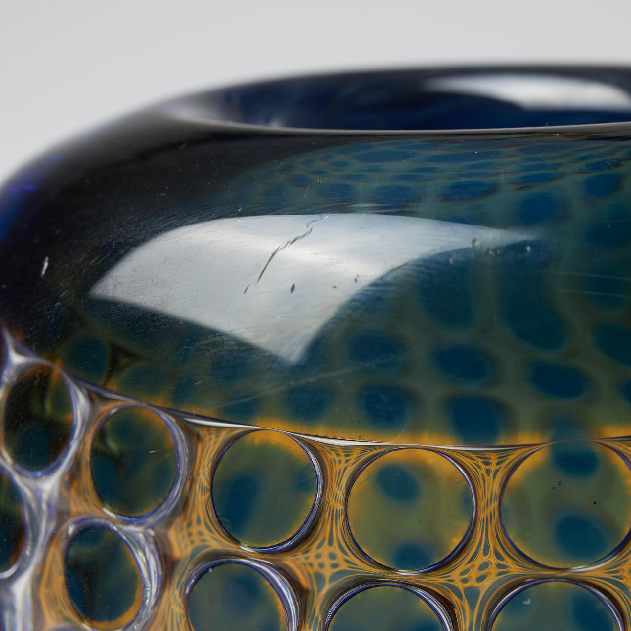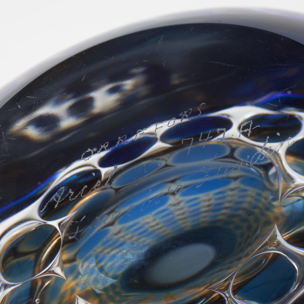 Blue underframe glass with decor in clear glass, signed Ingeborg Lundin, no 747 A, Ariel, Orrefors