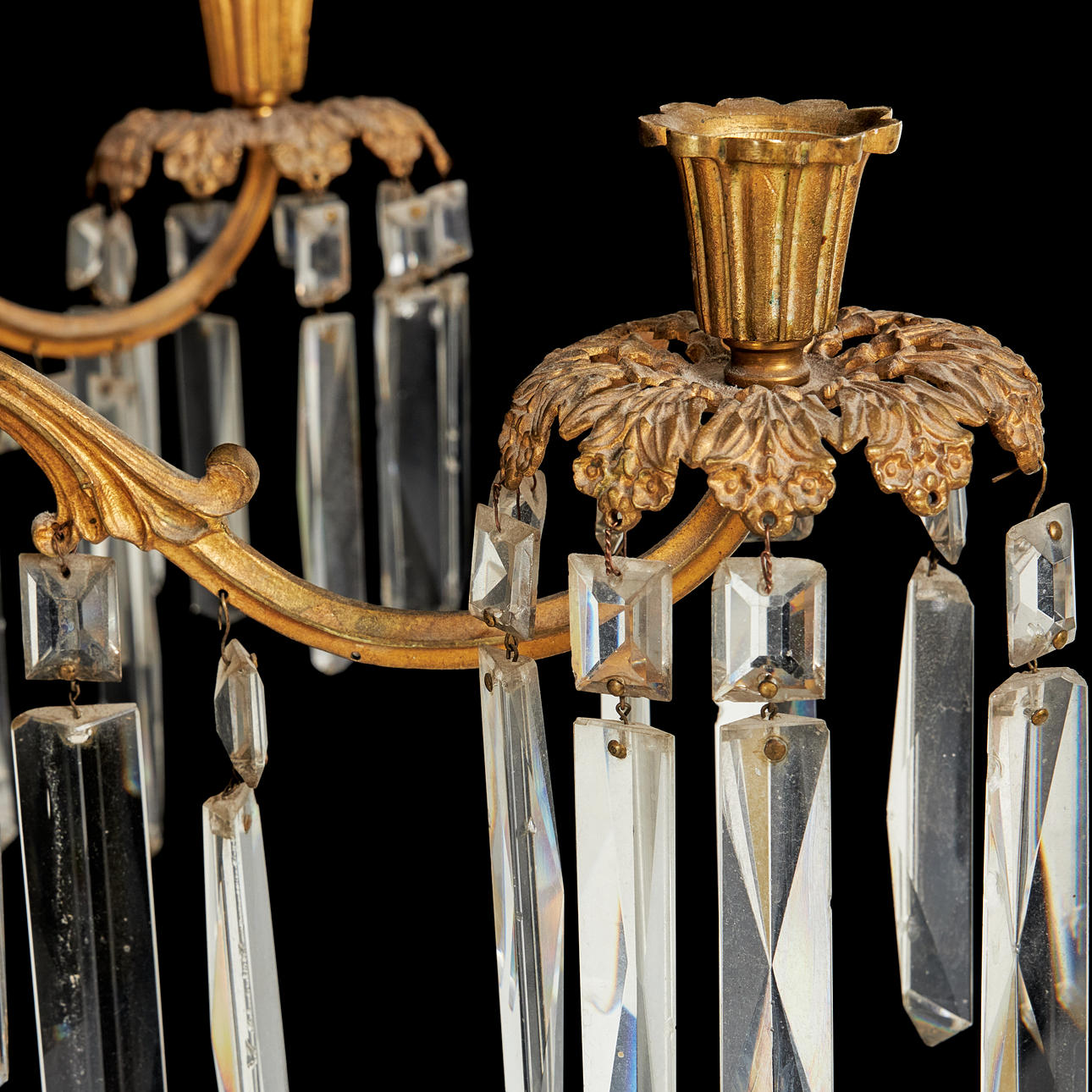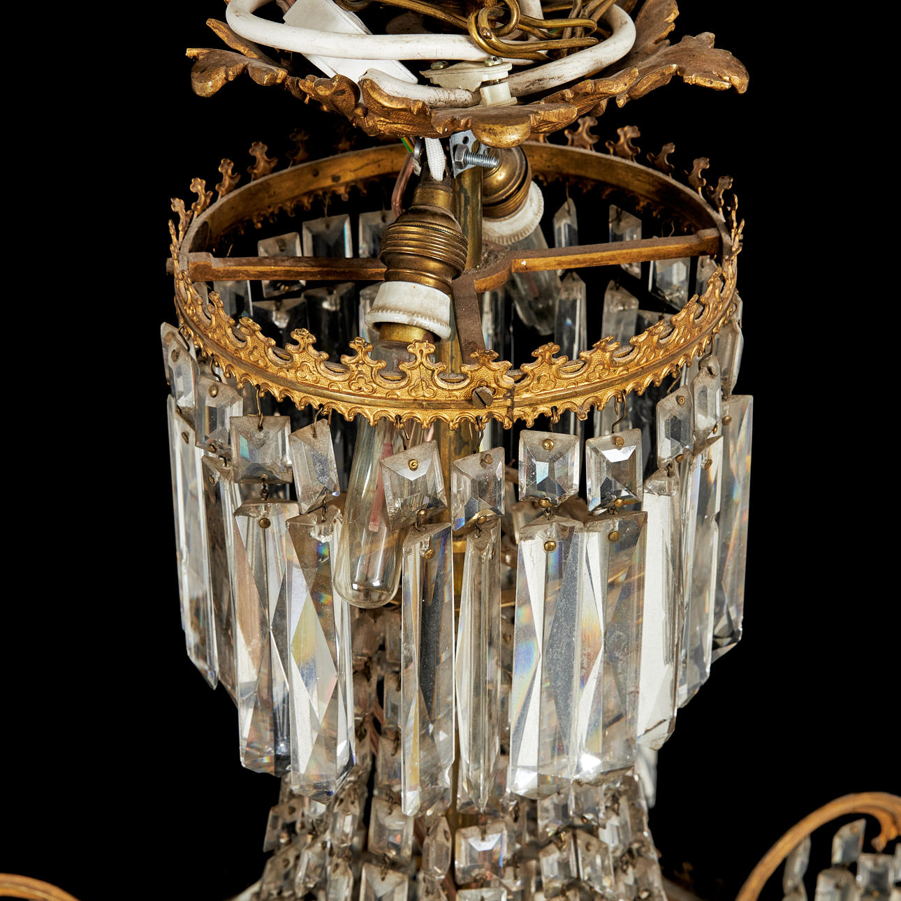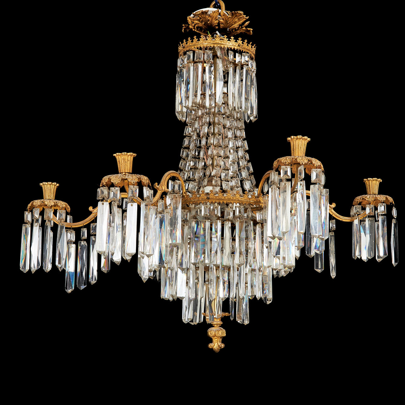 4498139. A CHANDELIER, Oscarian, 6 candlesticks, 6 light sources, surrounded by different cut prisms.