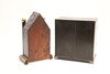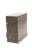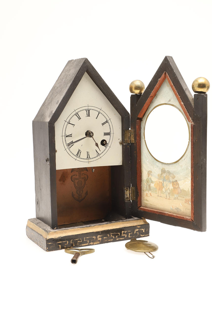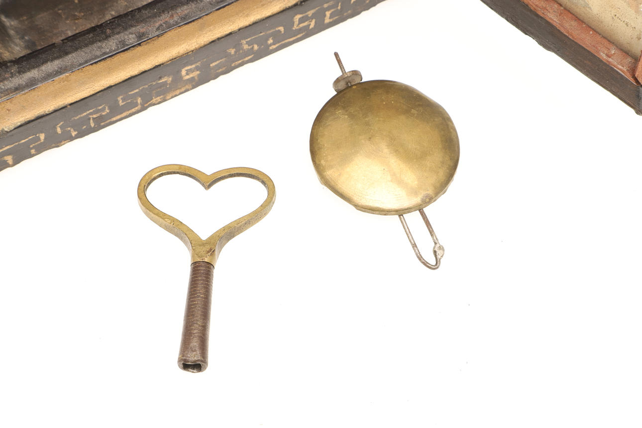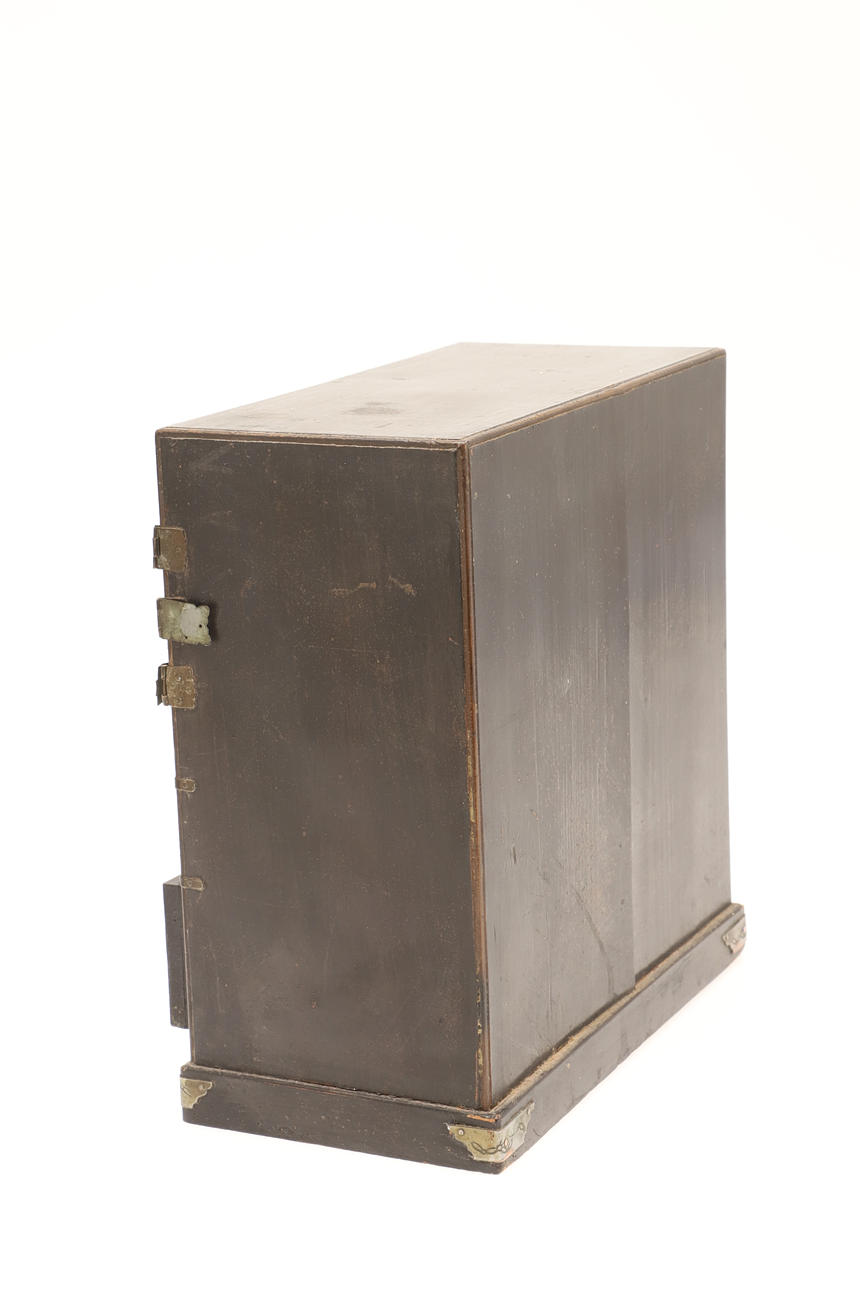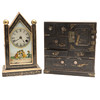 A small lacquered table cabinet, with an arrangement of drawers and containing various buttons (21.5cms high, 20cms across). Also with a small arch top mantle clock, the glass door decorated with children (25.5cms high). (2).