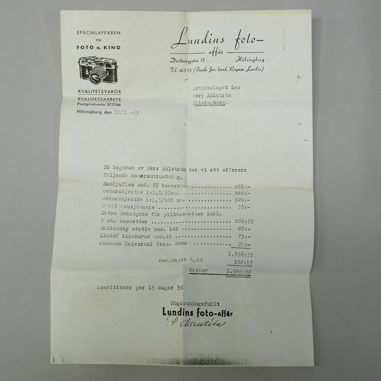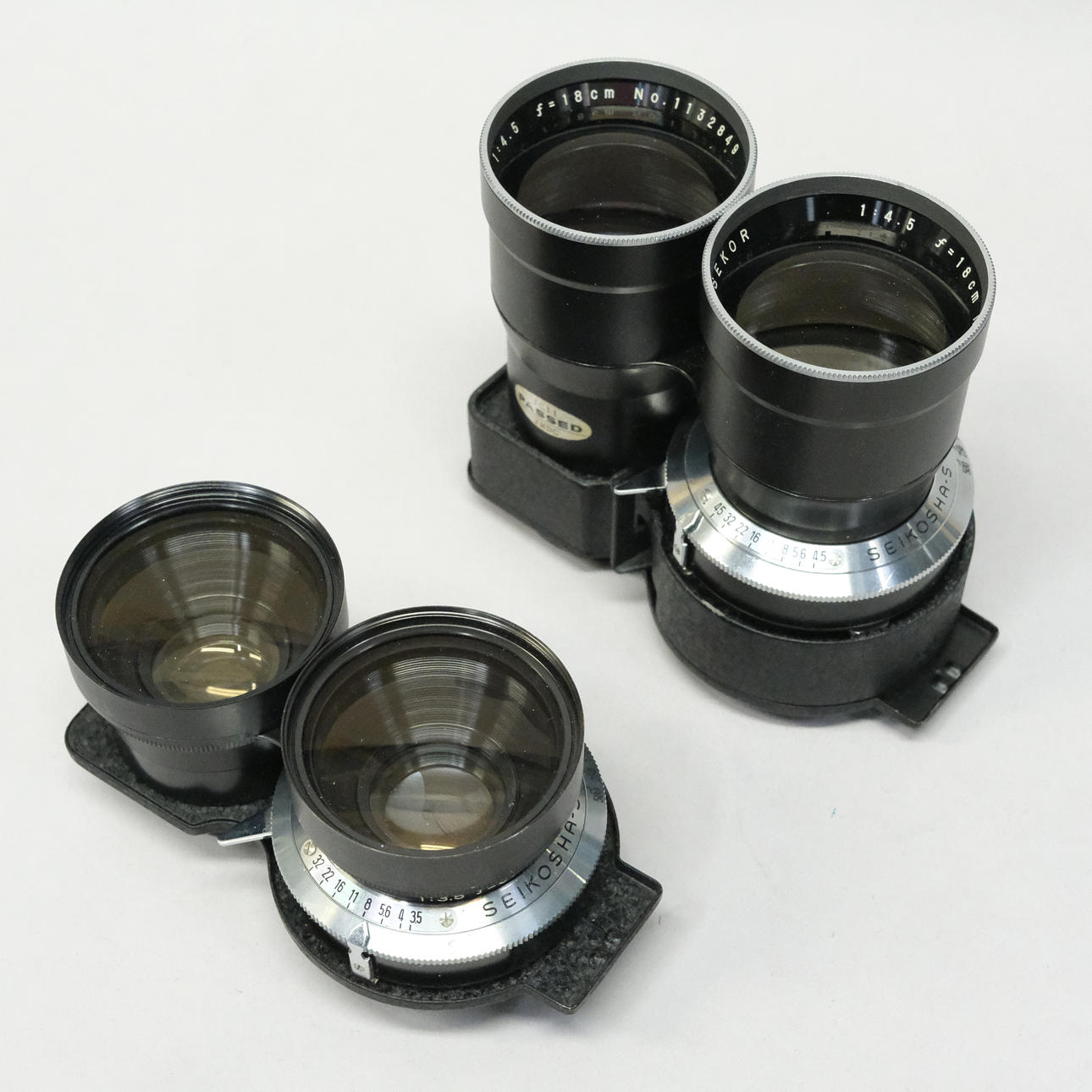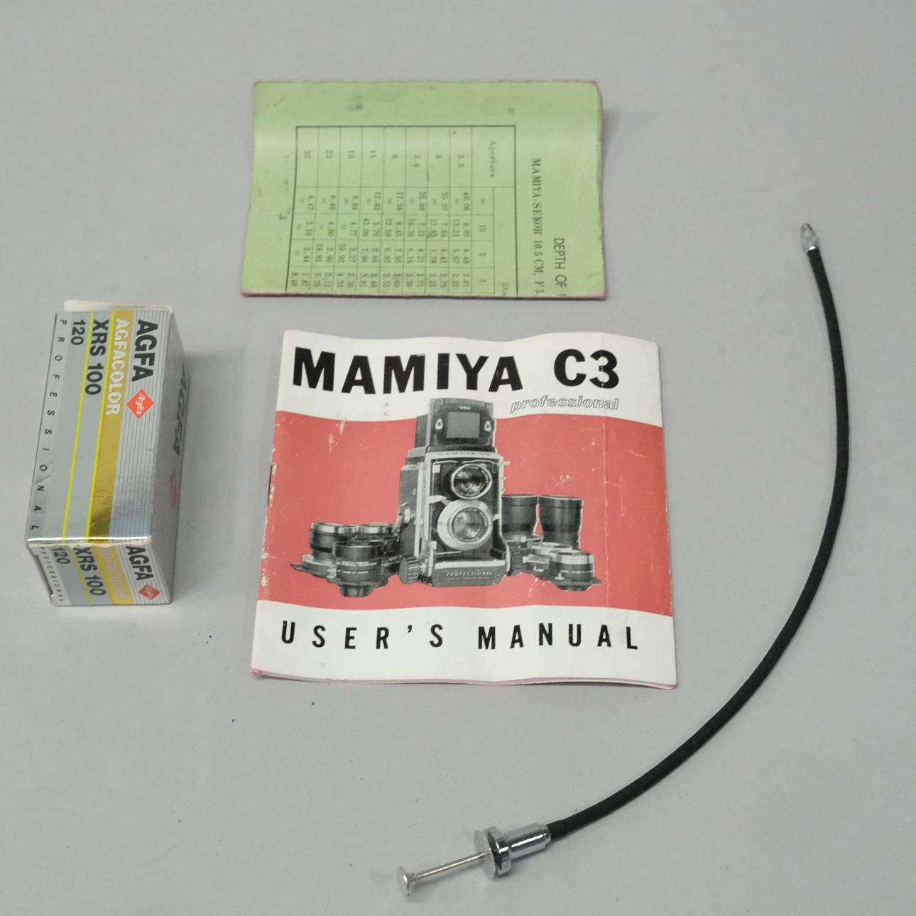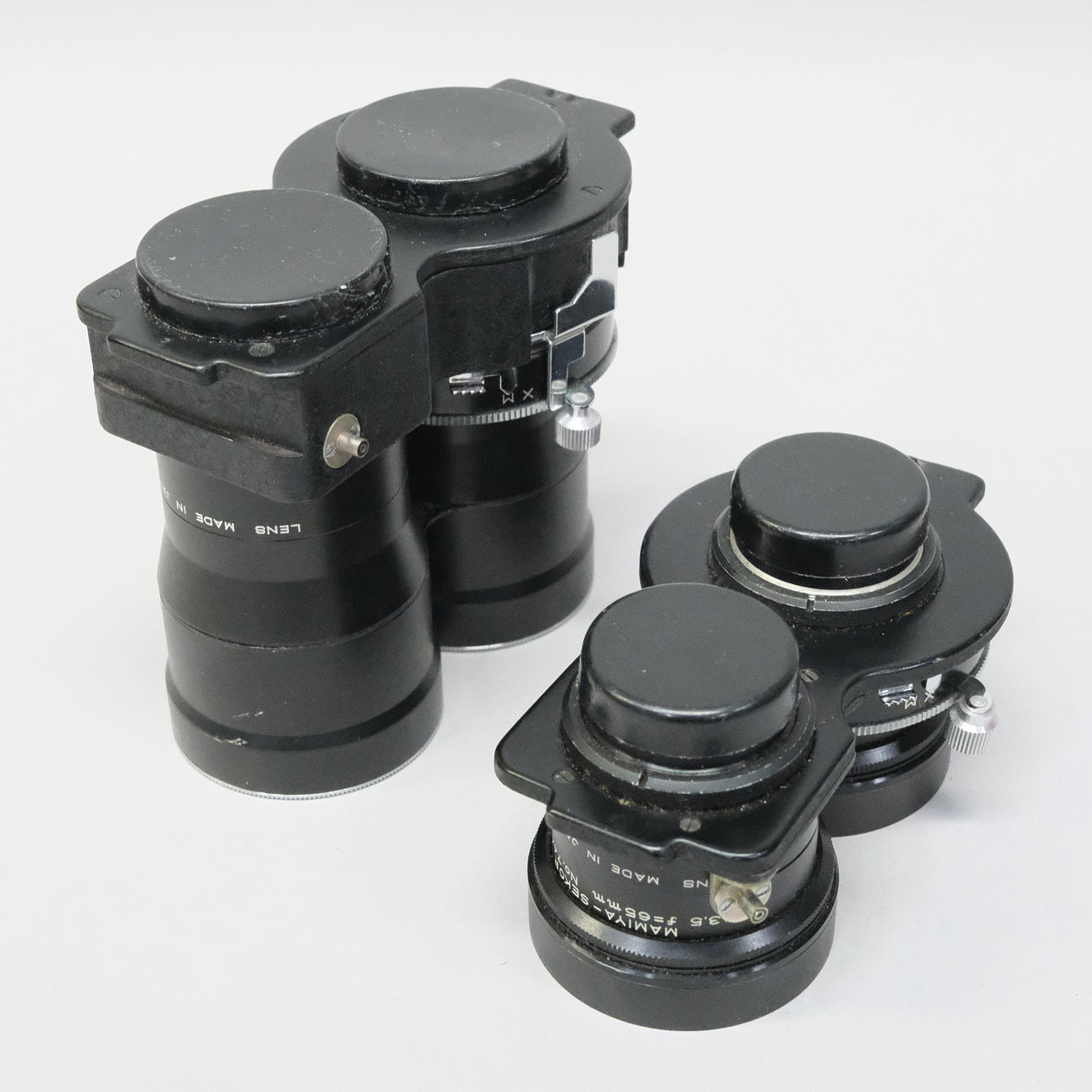With lenses Mamiya Sekor Seikosha S: 1:3,5, f=105 mm, no 699134 and no 699008; 1:3,5, f=65mm, no 744343 and no 744723 as well as 1:4,5 mm, f18 cm, no 1132978 and no 1132849 and bag.