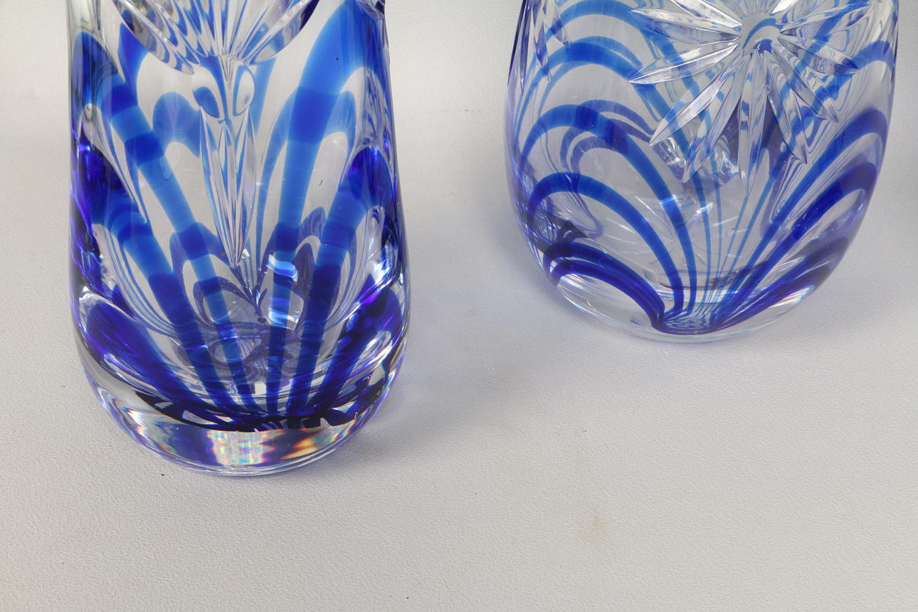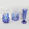 All with blue and clear glass bodies two with stylised foliate decoration, 25cm, 26.5cm and 28cm high (3).