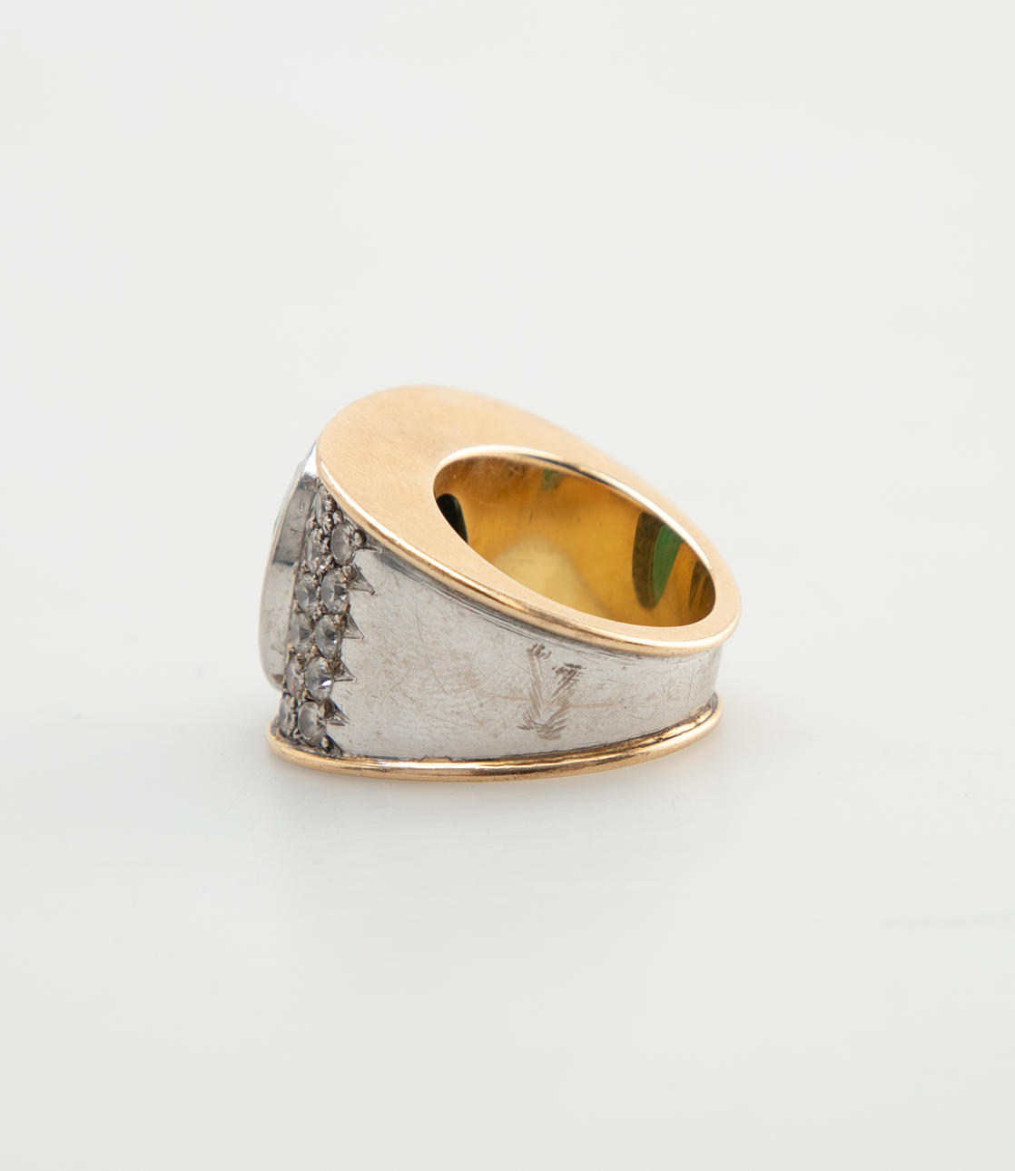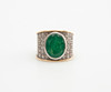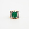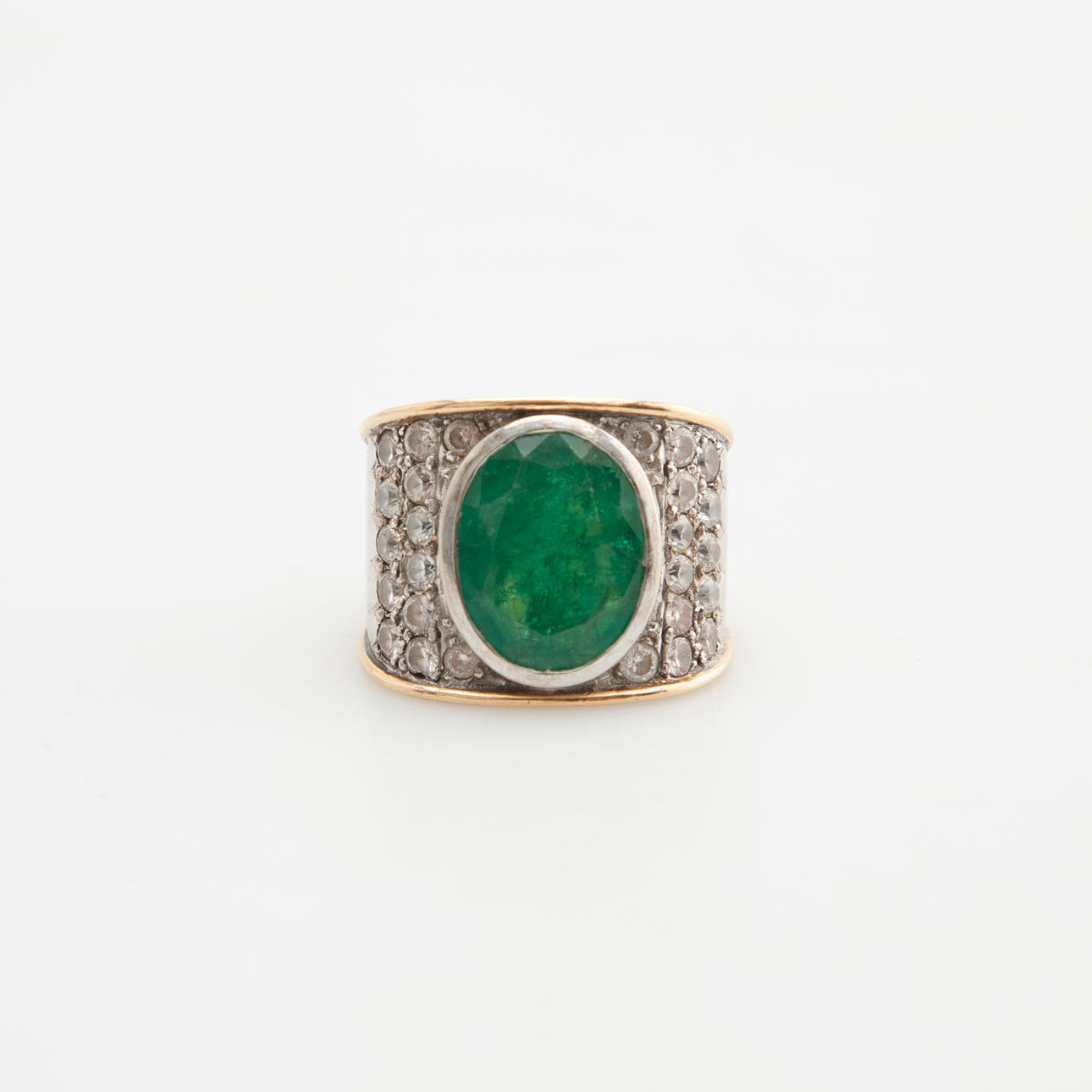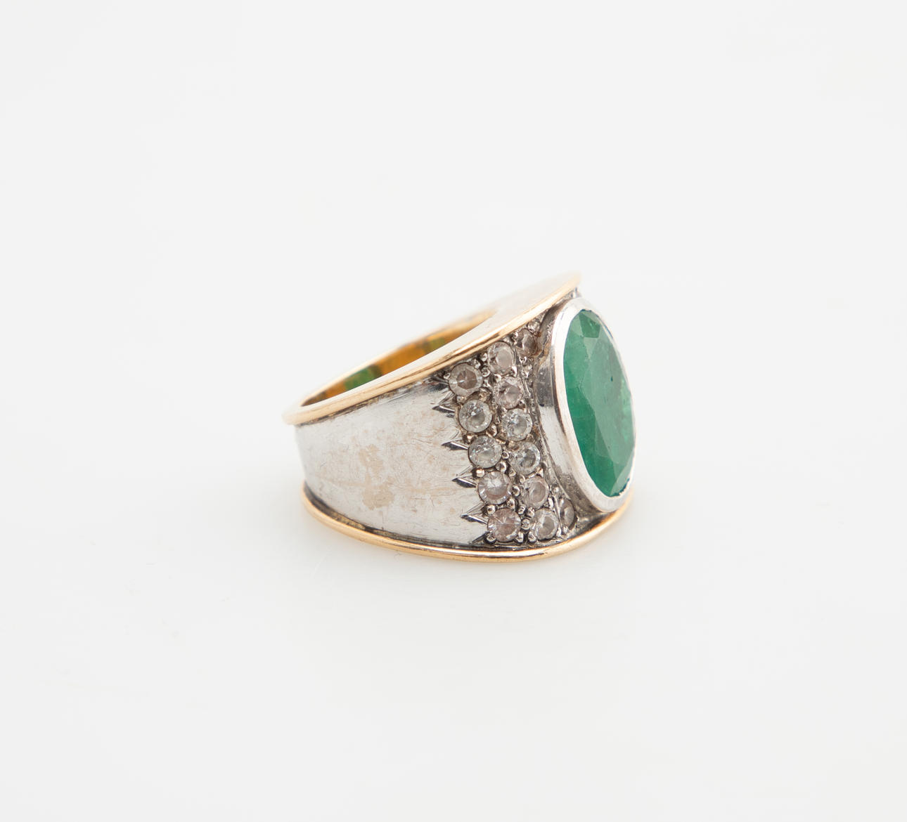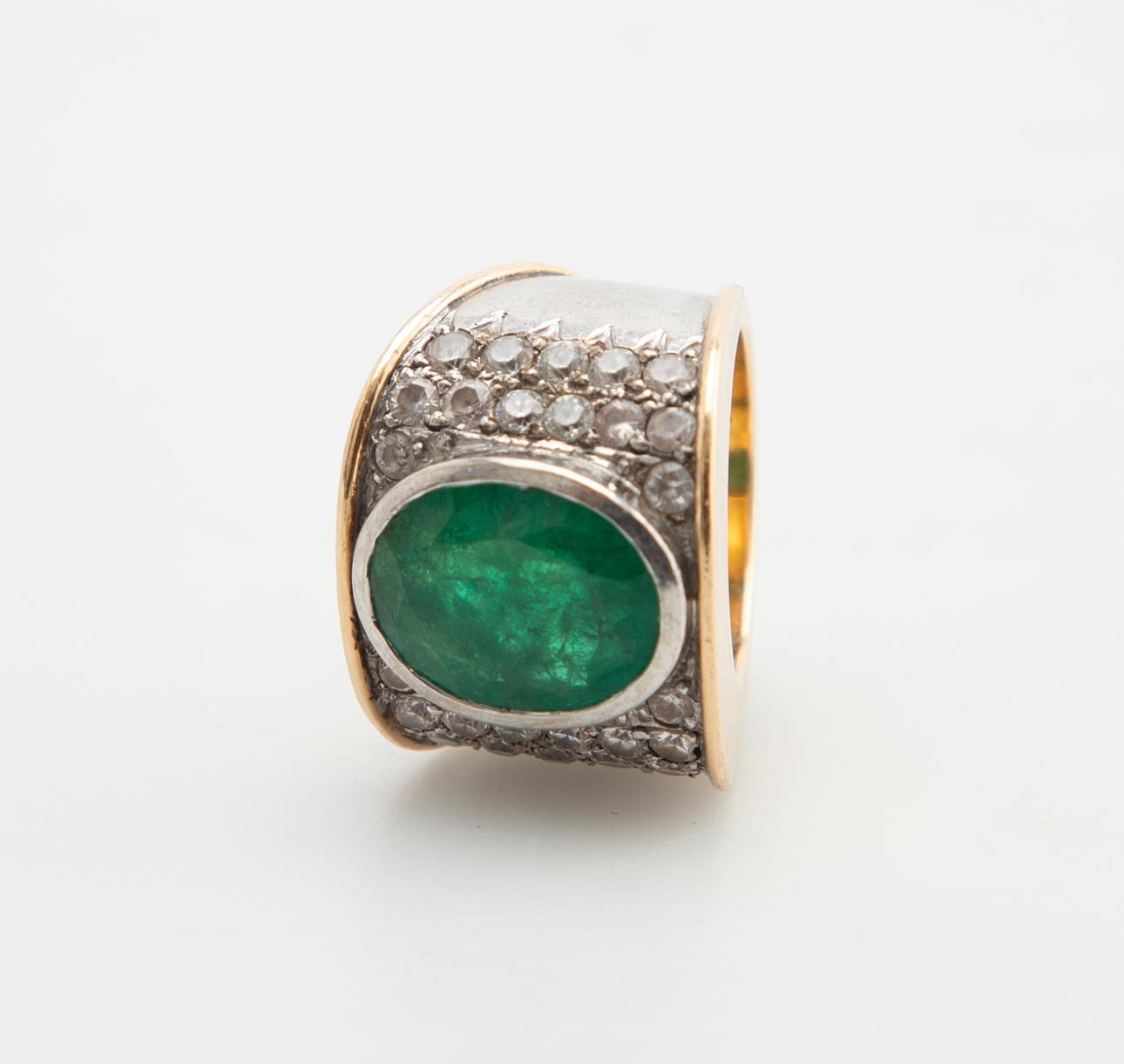 Ring made of 750 gold, set with an emerald in the middle and zircons. Emerald dimensions approx. 11.5mm x 15mm Ring size approx. 51. Weight ca. 22.3 grams.