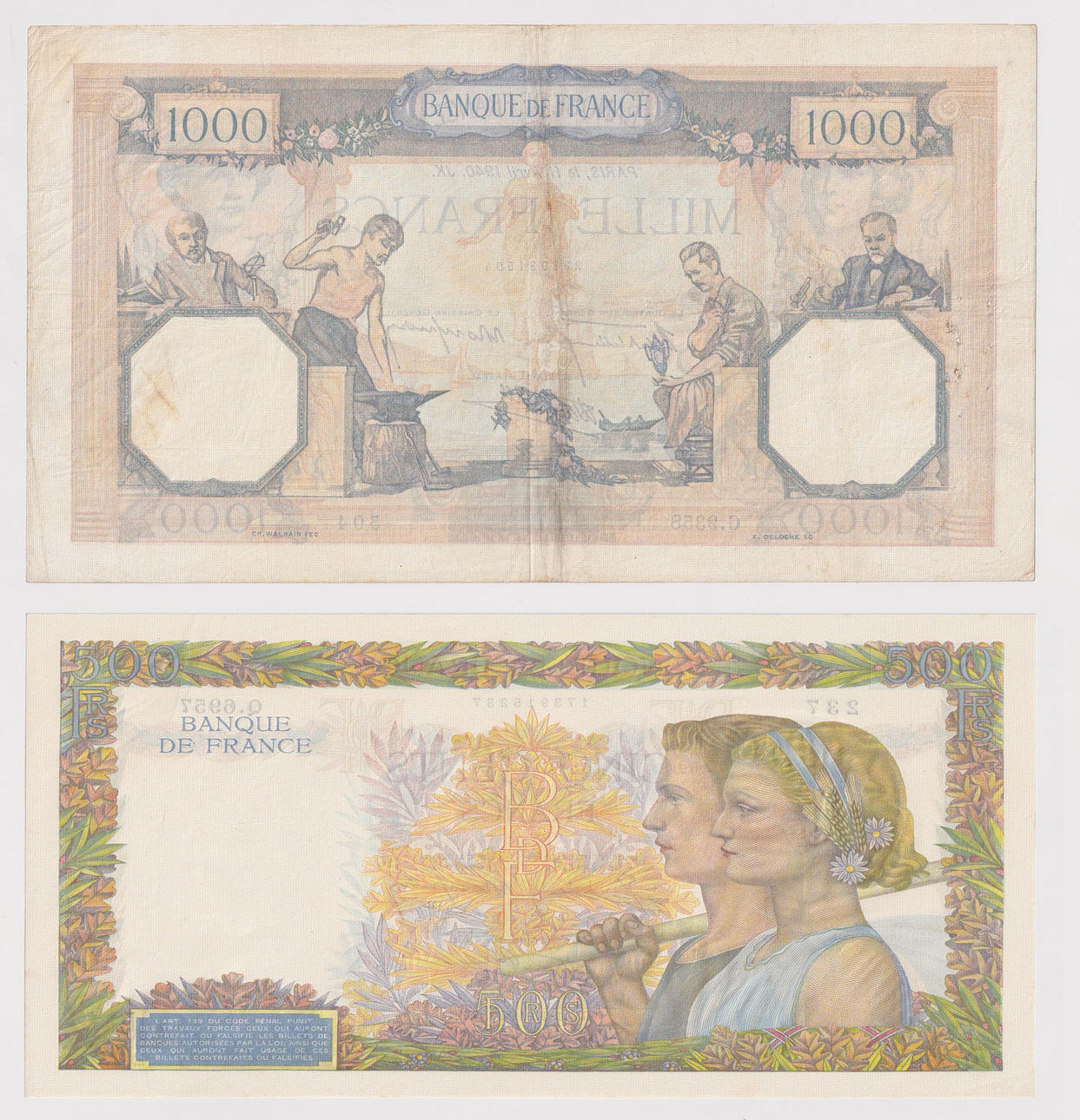 to include a 500 Francs note dated 1942, GV.1-10-1942.GV. serial number Q.6957 237 together with a 1000 Francs bank note dated 1940, 11th April 1940.JK. serial number G.9358 504 (2).