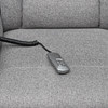 Electrically adjustable seat position with fold-out footstool. Length ca 75, width 74, height 106 cm.