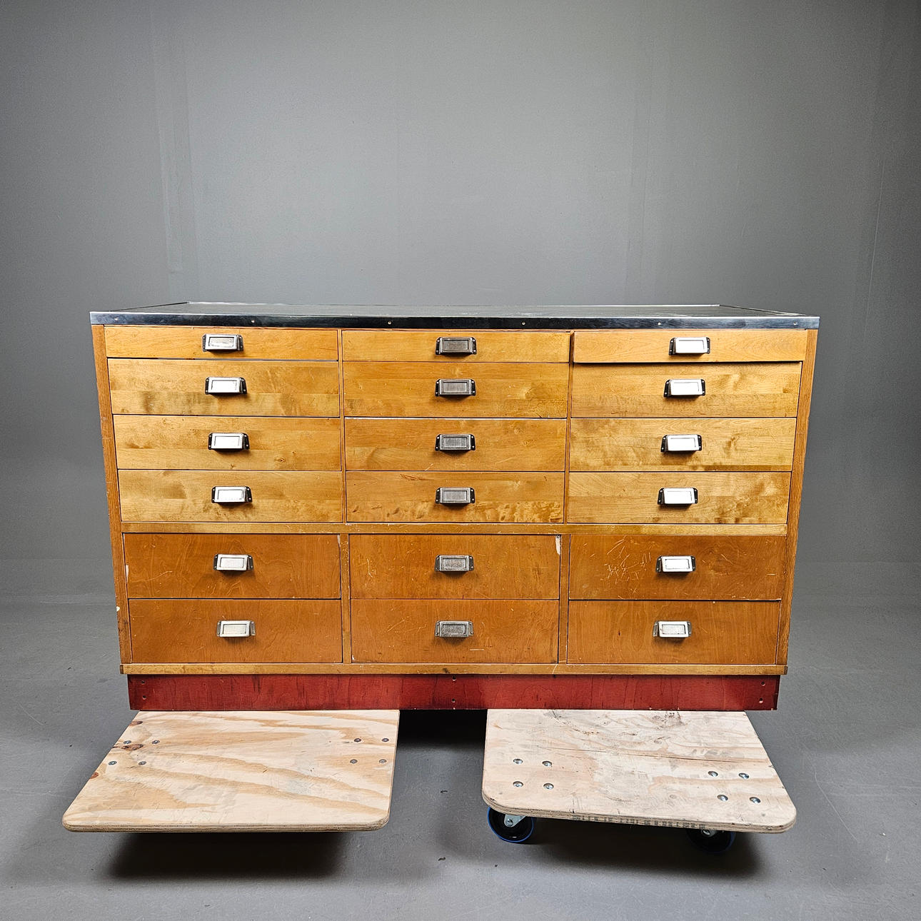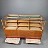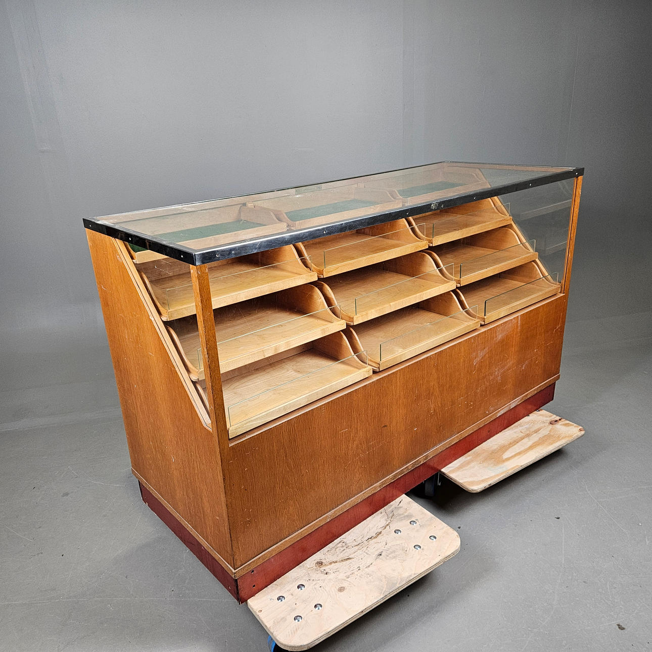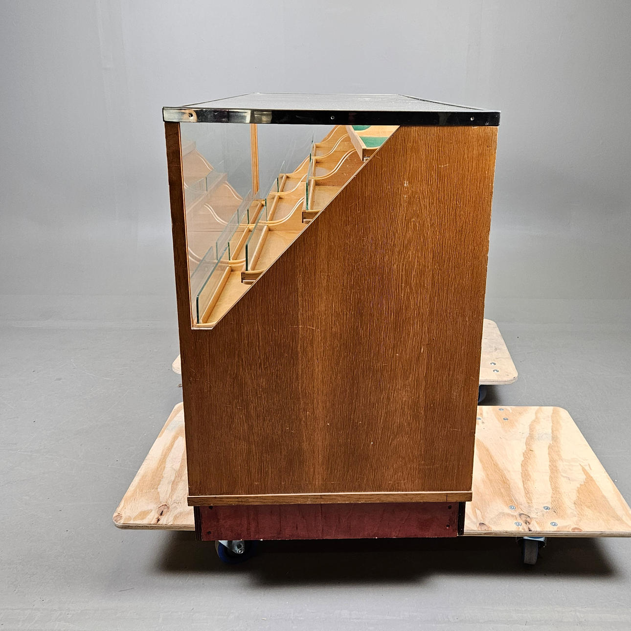 Birch, oak and glass. On wheels. Metal fittings. Length approx. 151, width 60, height 91 cm.