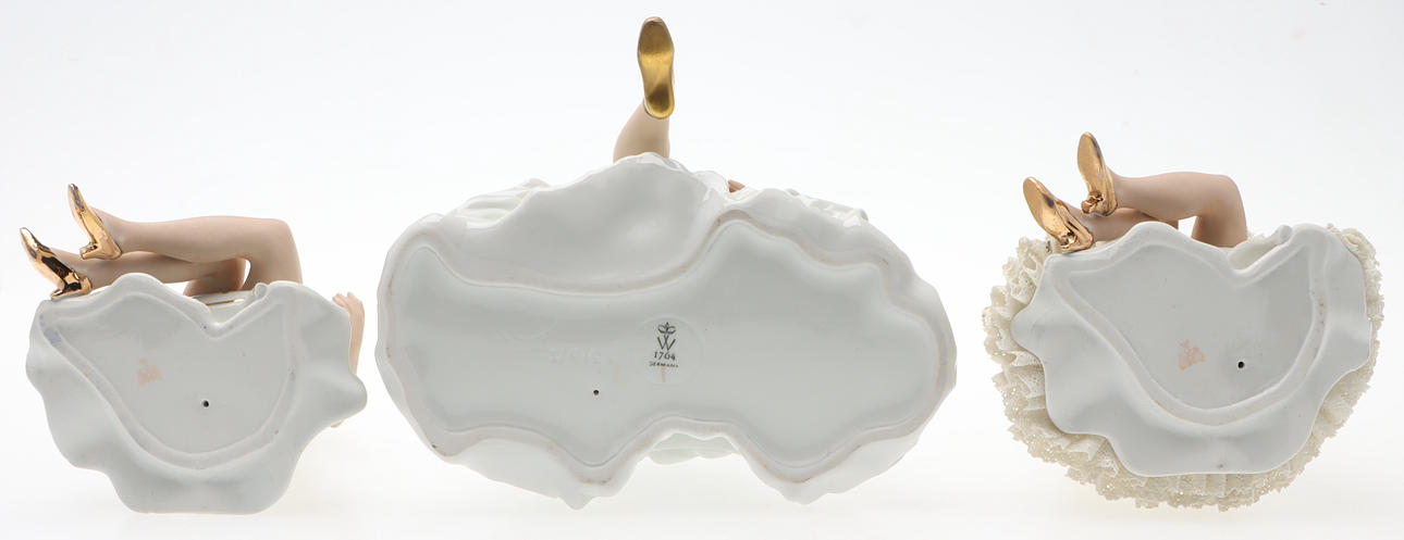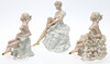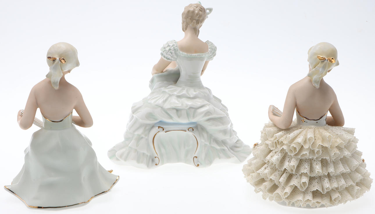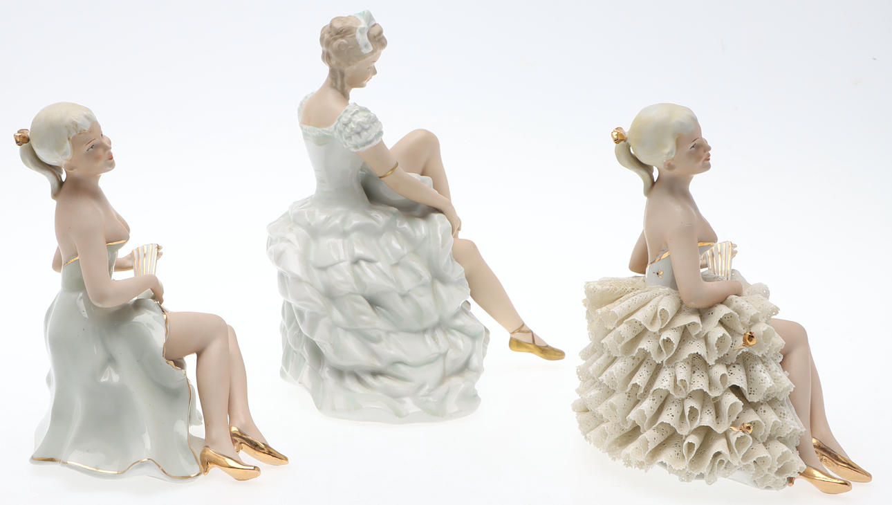 Three seated dancer figurines, Carl Scheidig & Wallendorf, Germany.