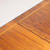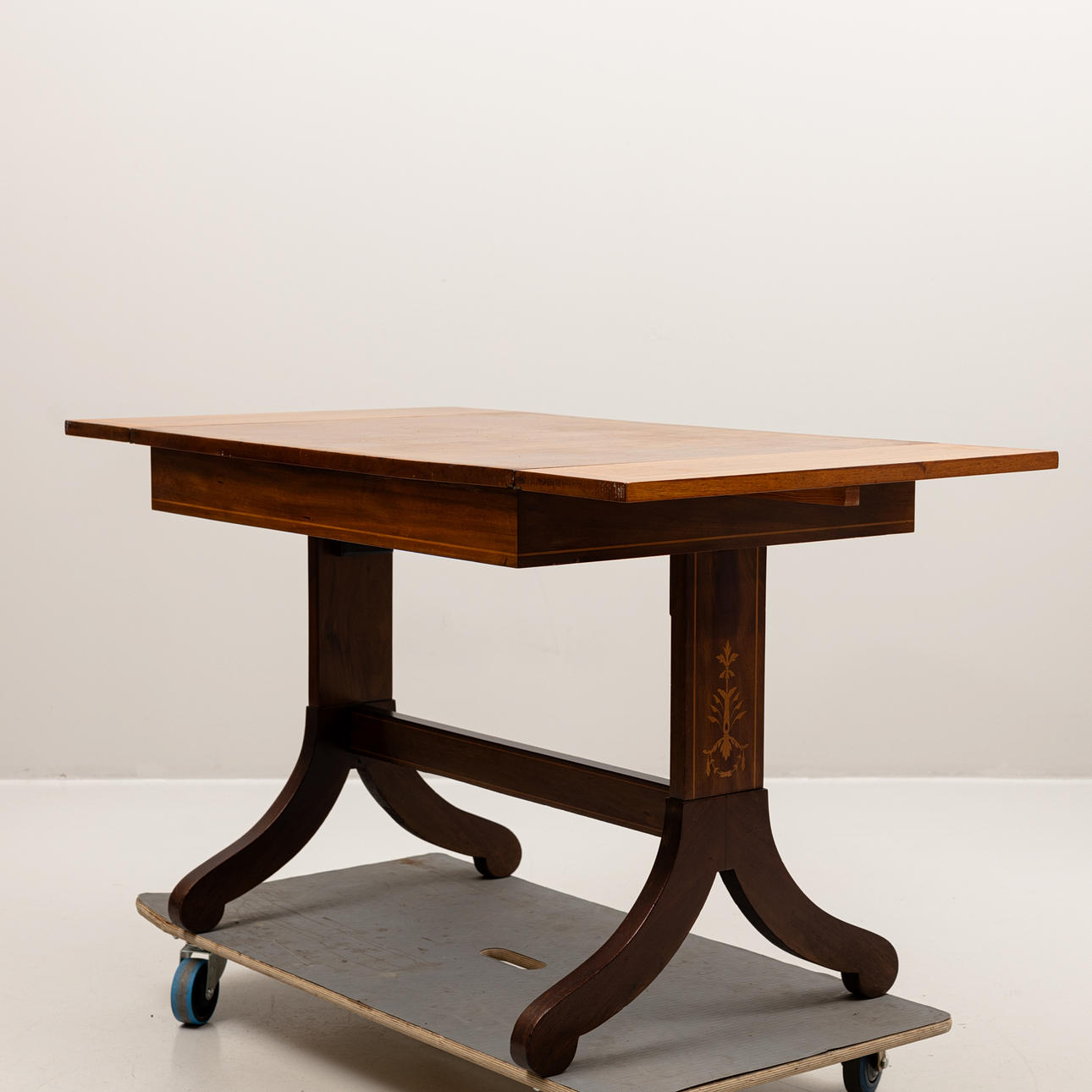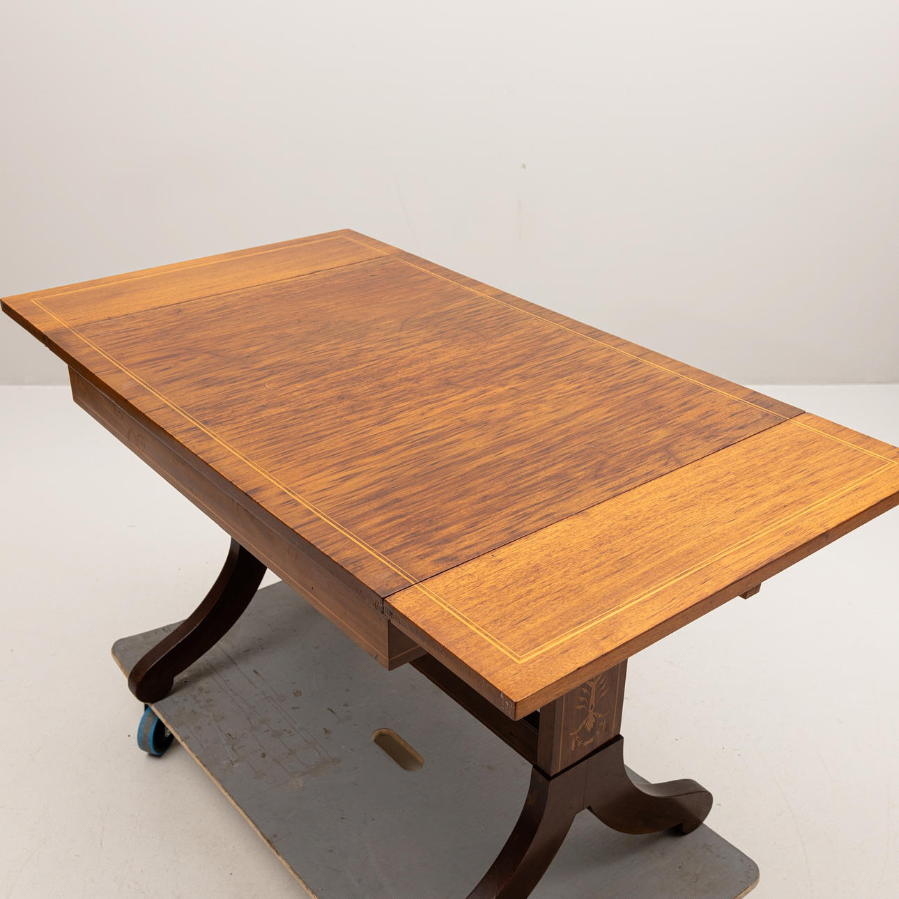 Rectangular shape with floral intarsia decor, two flaps on the short sides, length unfolded about 133.5 and folded down 92.5 cm, width 73 and height 76.5 cm.