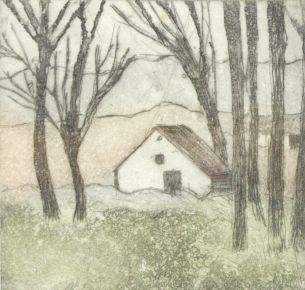 INGER KIHLMAN. Etching, small house among trees, signed, -84.