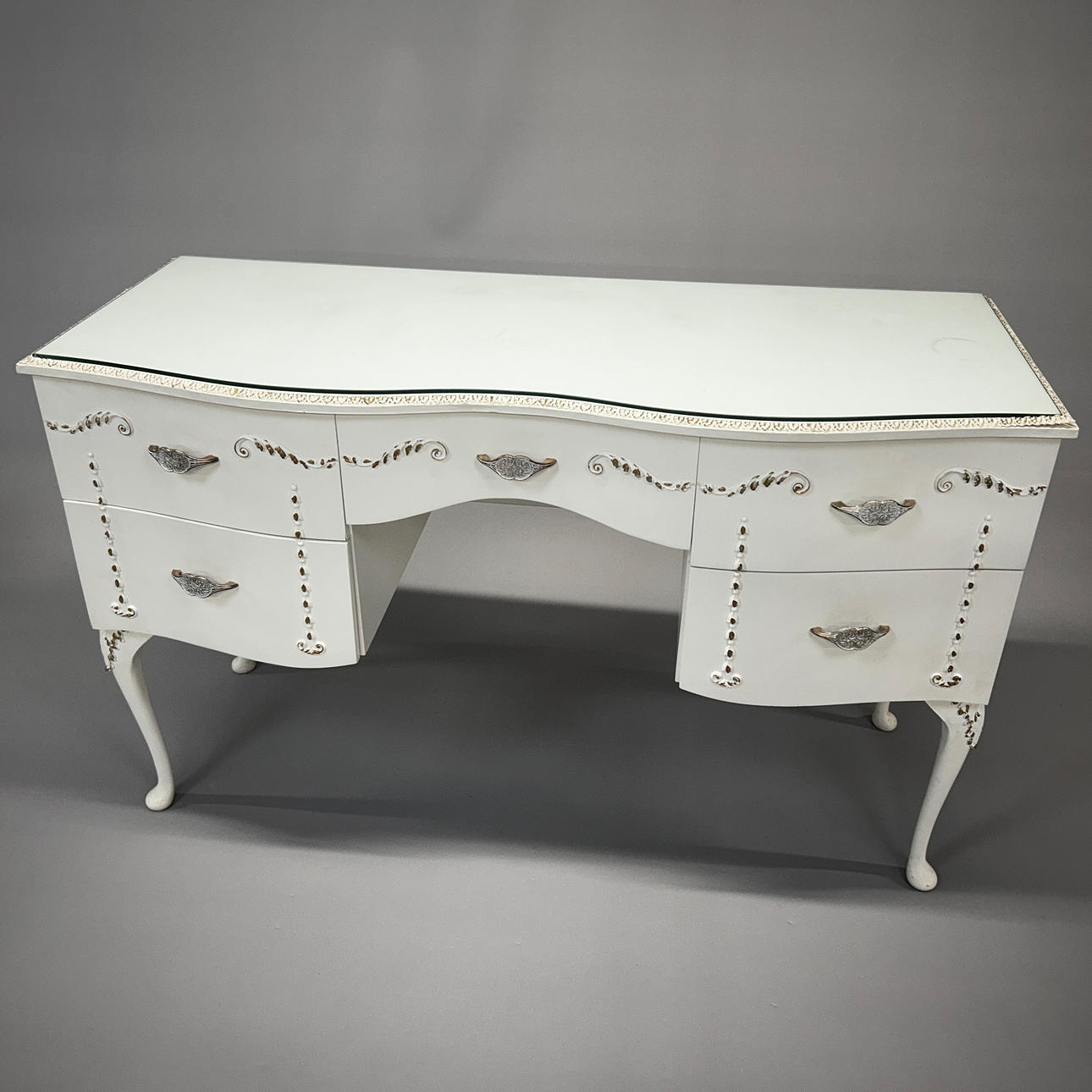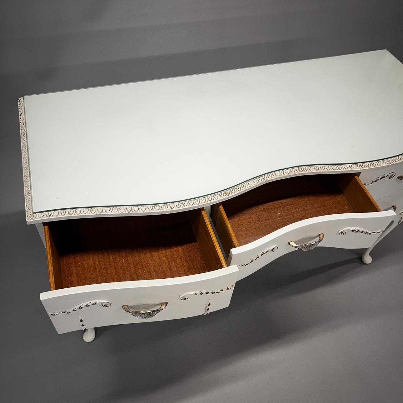 A cream finished serpentine fronted sideboard with protective plate glass top, 124 x 77 x 50cm.