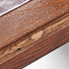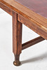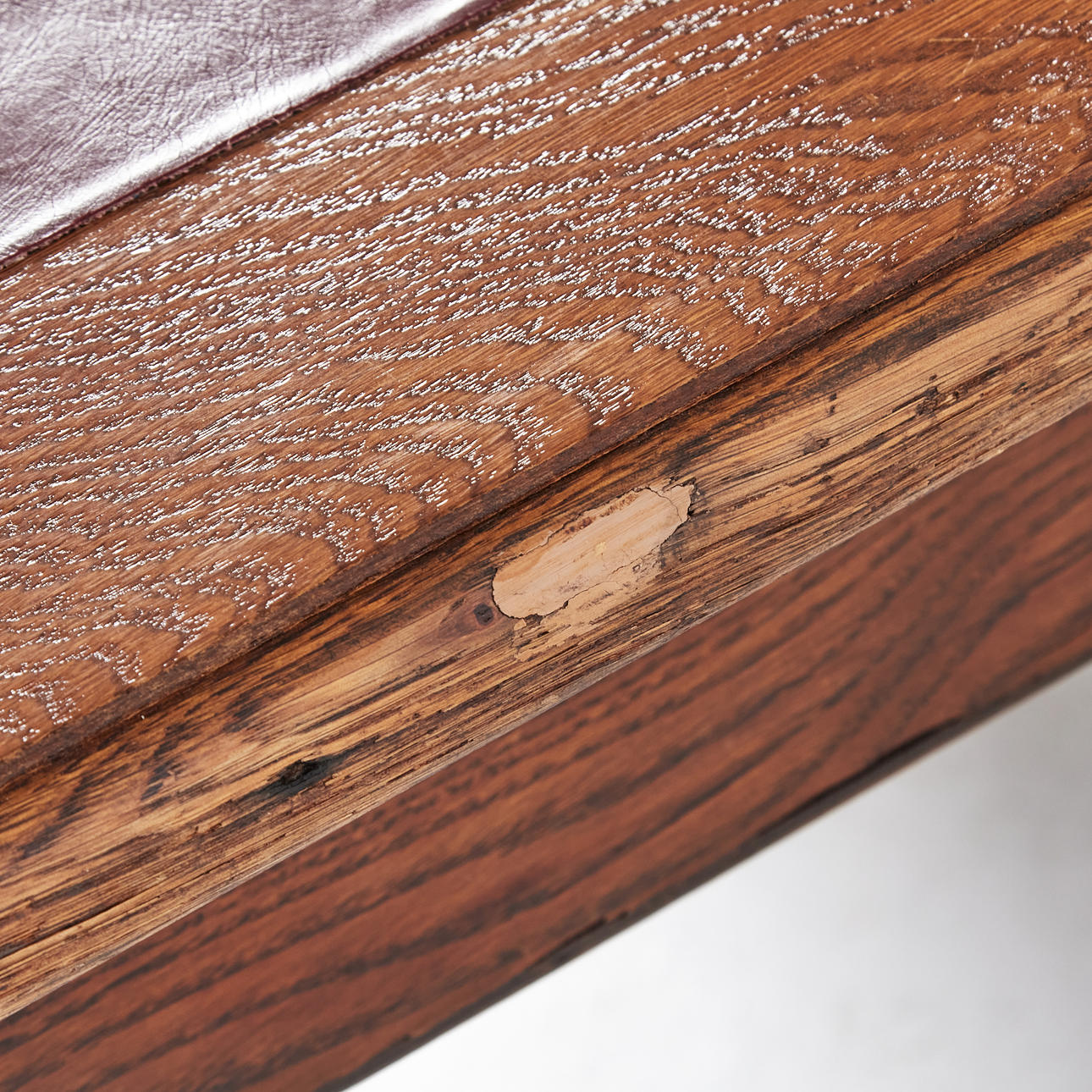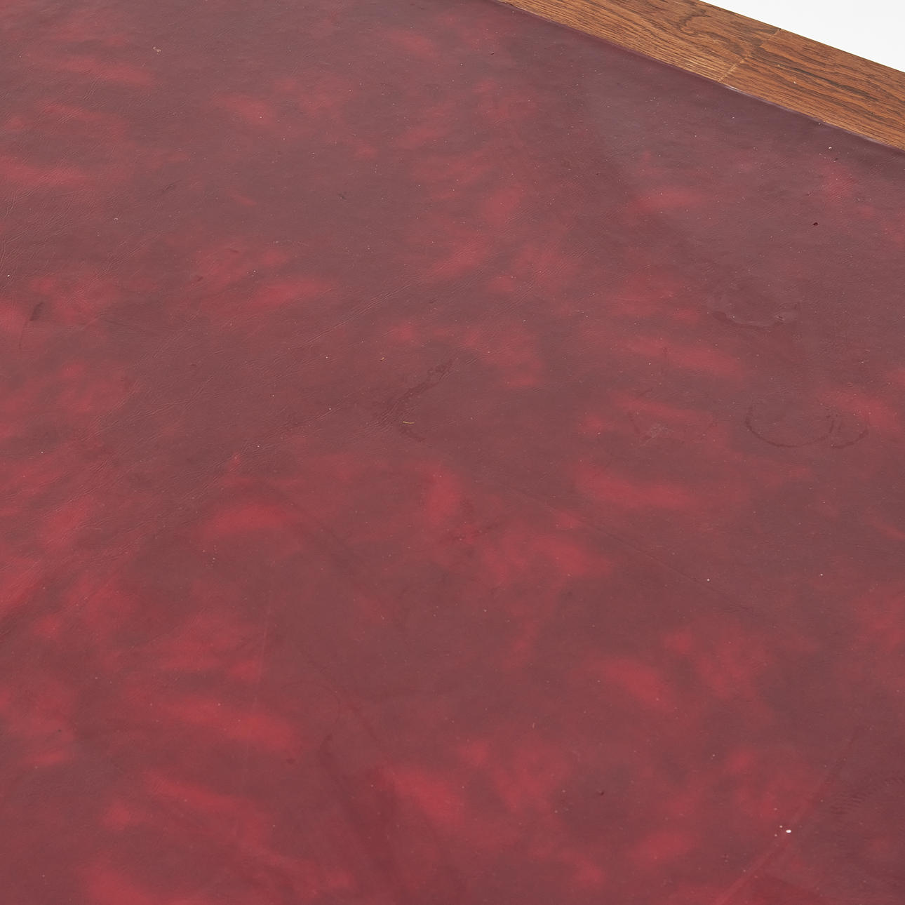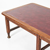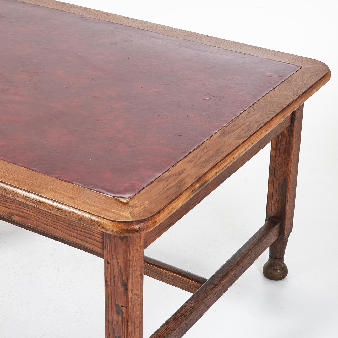 Table top with artificial leather, foot sleeves partly in brass, two feet with bronzed wood Height 80, 260x120 cm.