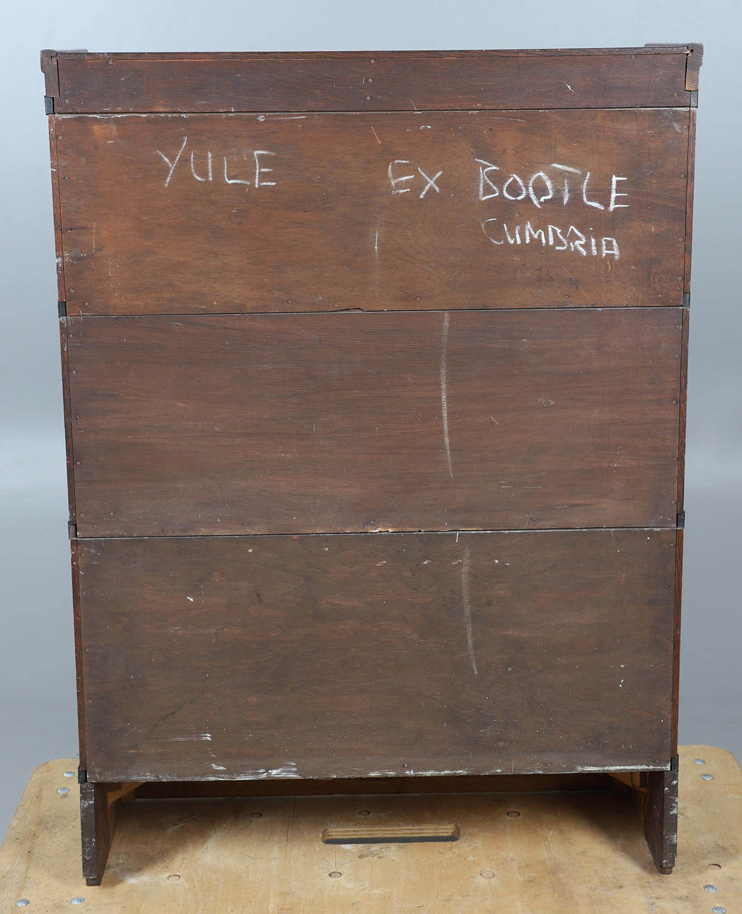 A large three tier oak glazed sectional bookcase, with manufacturers label to each section, 86cm x 32cm x 120cm high.