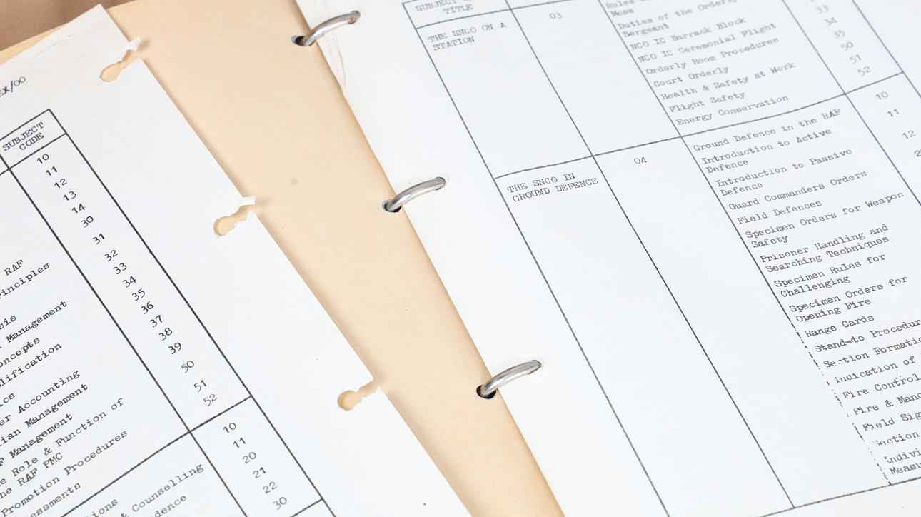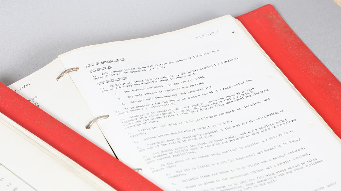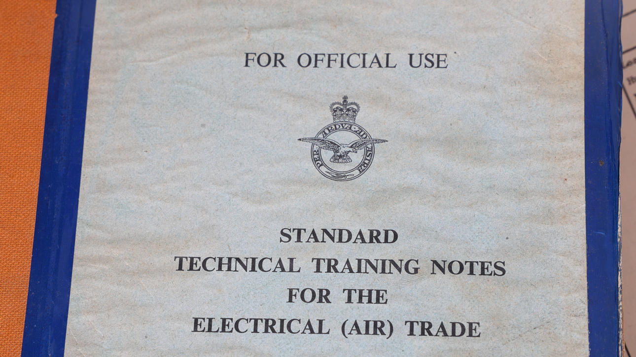 Cold War period Royal Air Force training manuals including two Airmans Command School General Training 2 Course Notes, Standard Technical Training Notes for the Electrical (Air) Trade, and Survive to Fight, held in a haversack marked 'Sgt. Sullivan'.