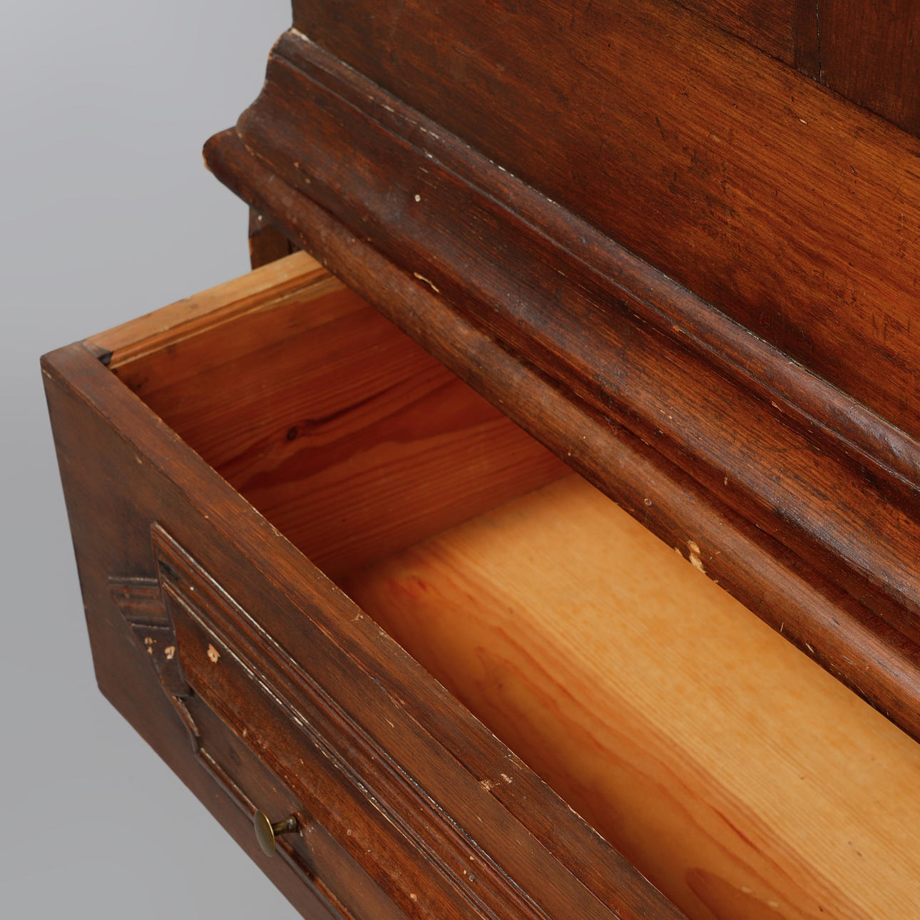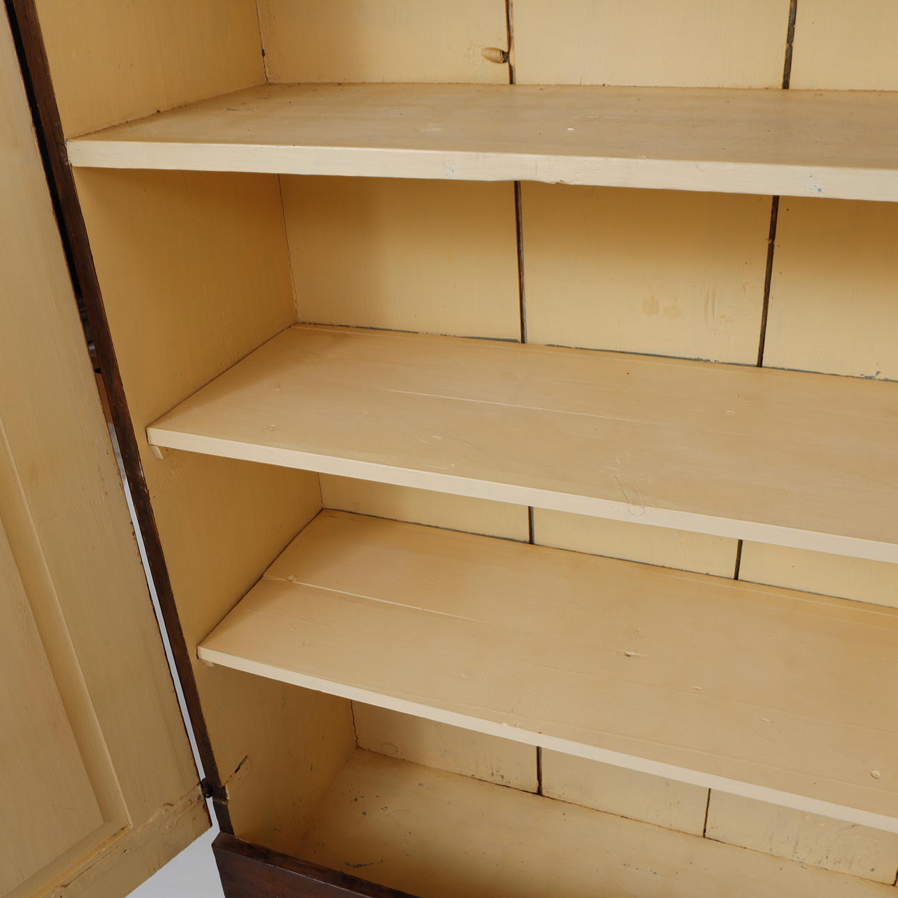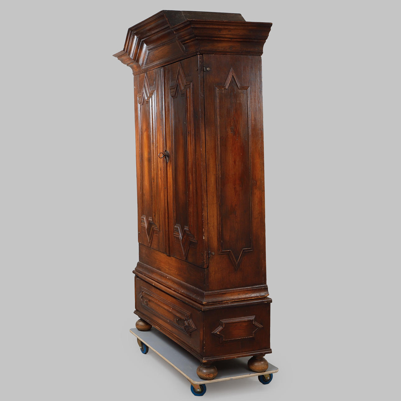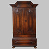 Ek. Straight shape. Protruding molded crown that is slightly raised. Paired doors. It's a box. Turned feet. Length 150, width 55, height 230 cm.