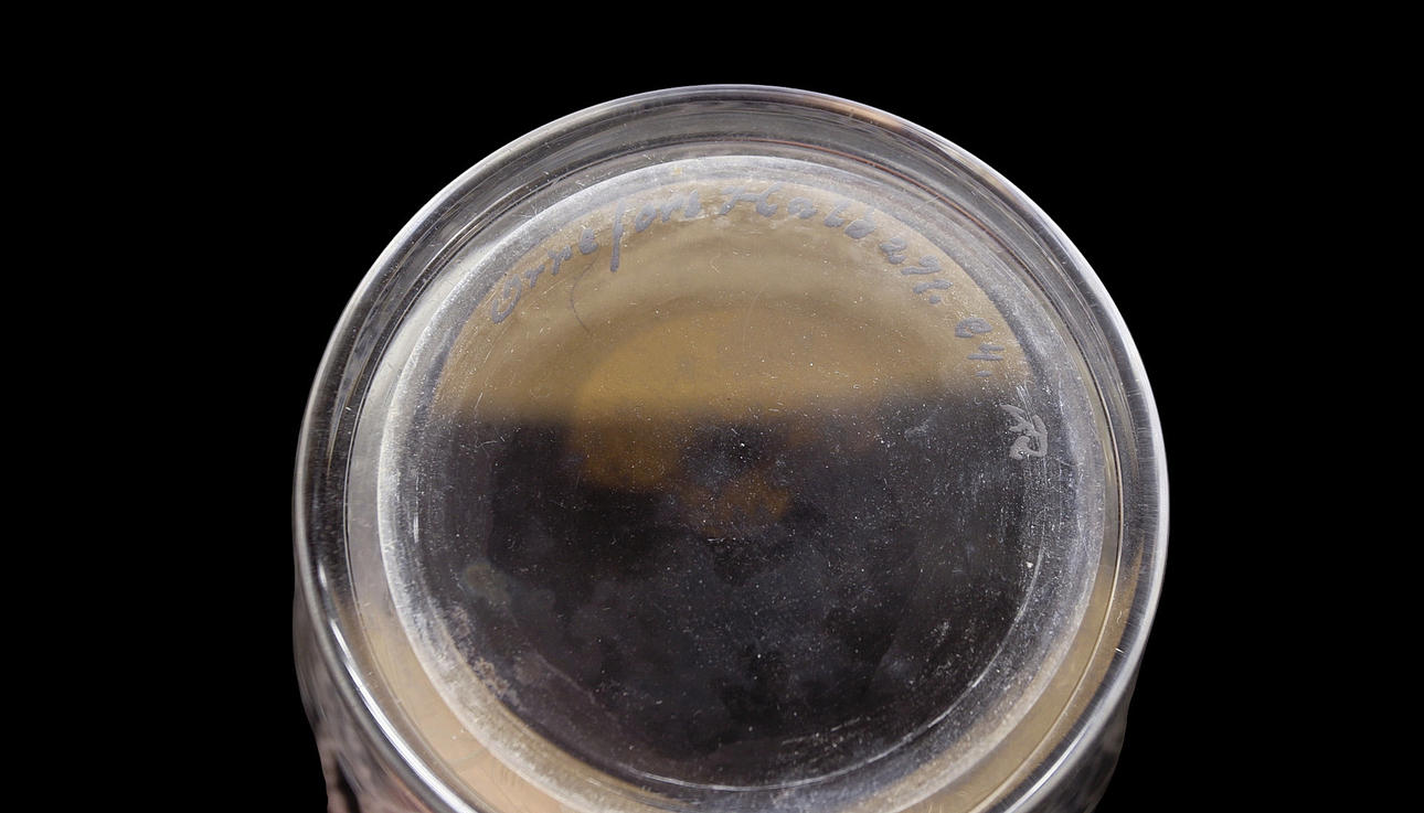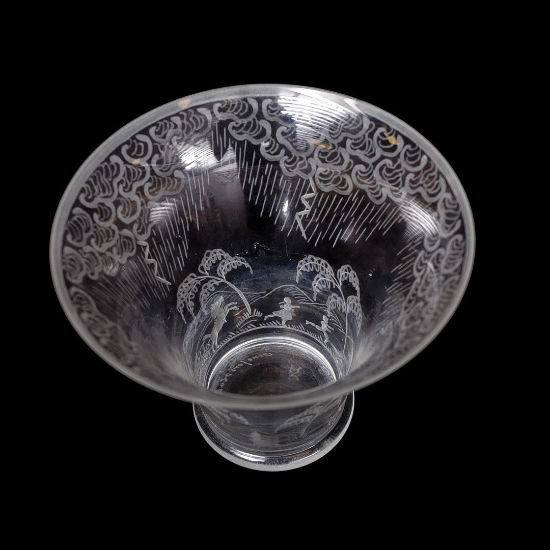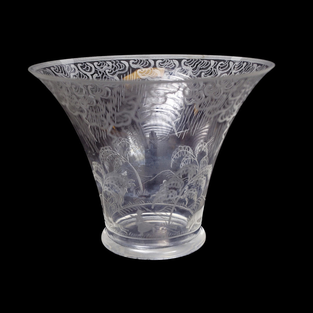 clear glass with engraved decoration of rain clouds, lightning, frightened animals and human figures.