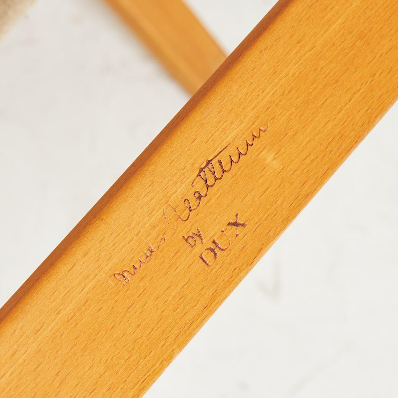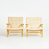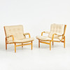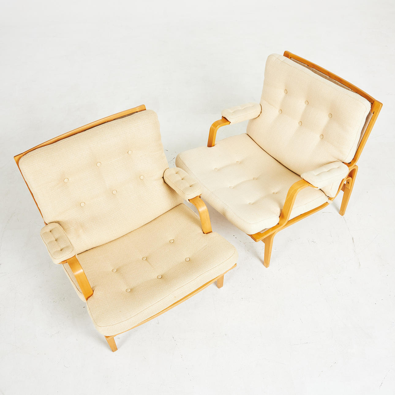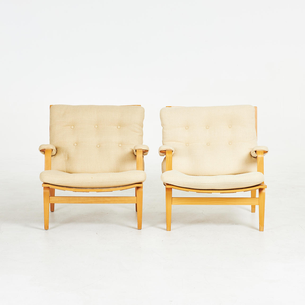 4524960. BRUNO MATHSSON. Armchairs, 1 pair, “Ingrid”, Dux, laminated frame in beech, canvas, loose plush lining, upholstered buttons.