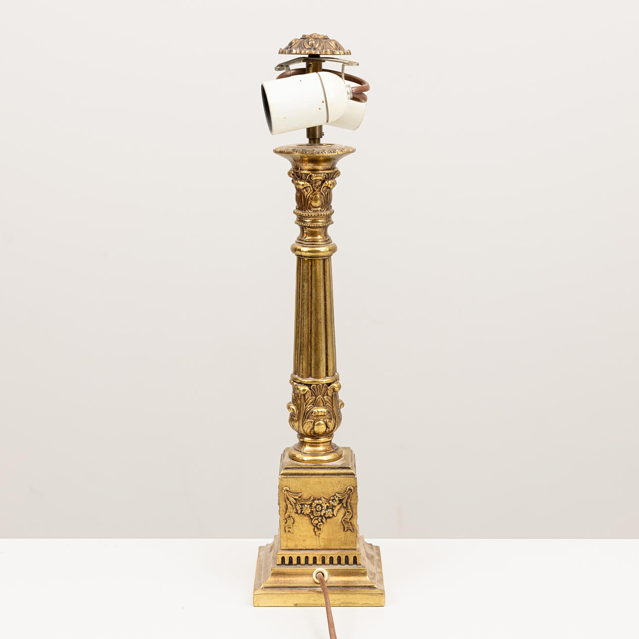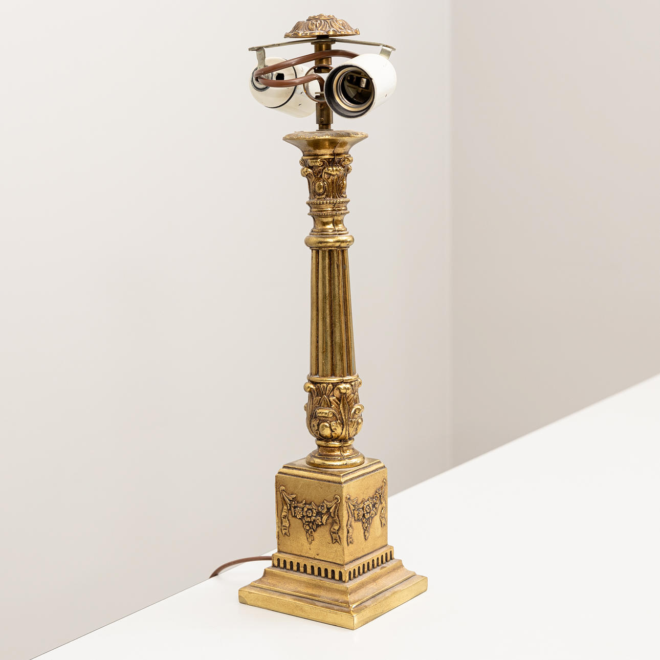 Square foot, garland-shaped relief decor, column-shaped shaft with cannelyr and Corinthian capital, two light points, base dimensions approx. 11x11 and height 44,5 cm.