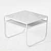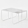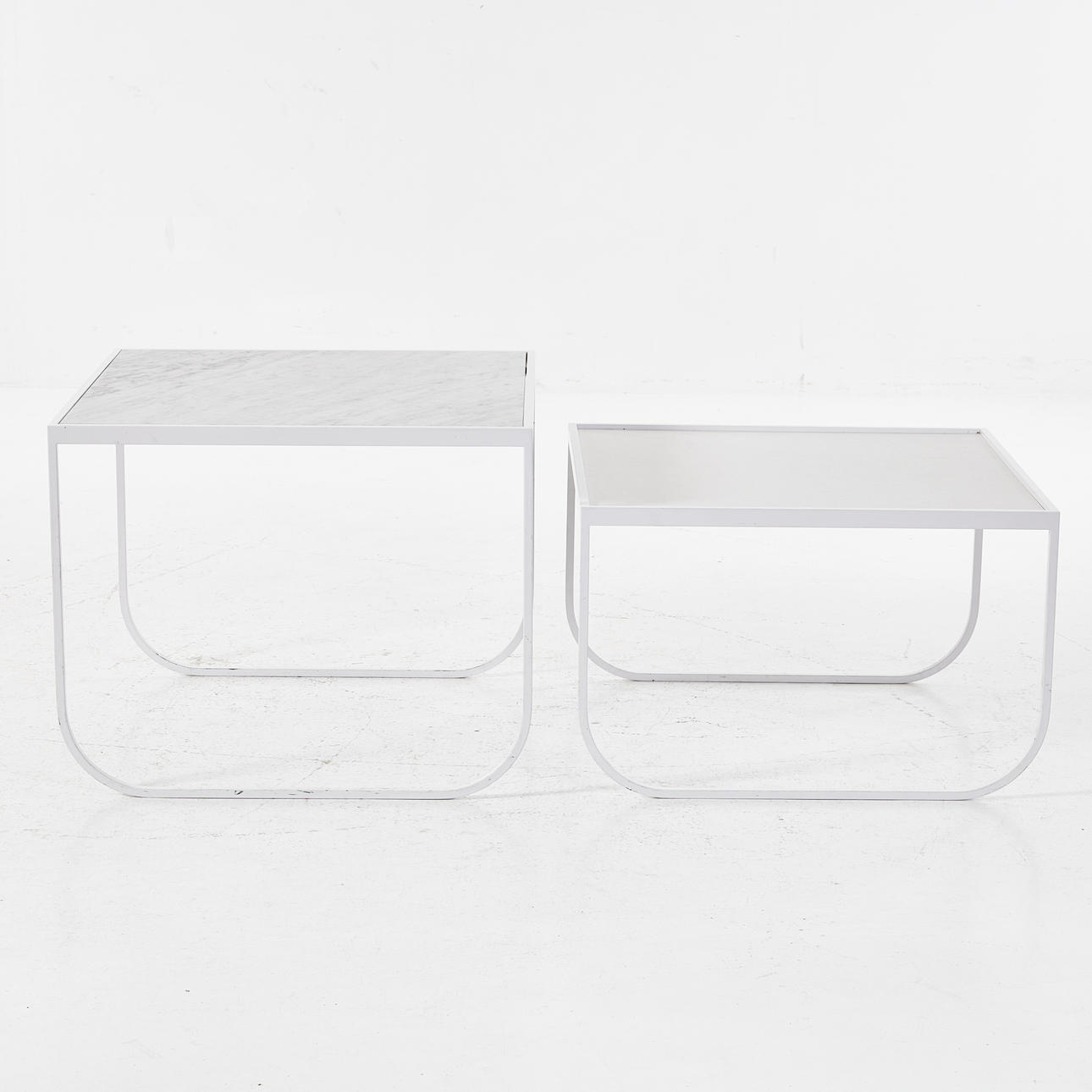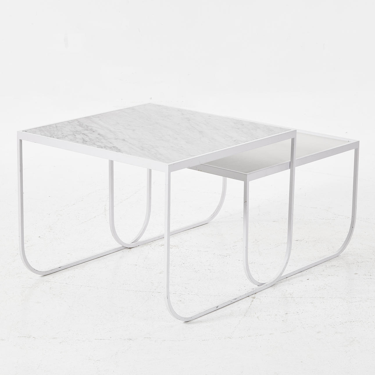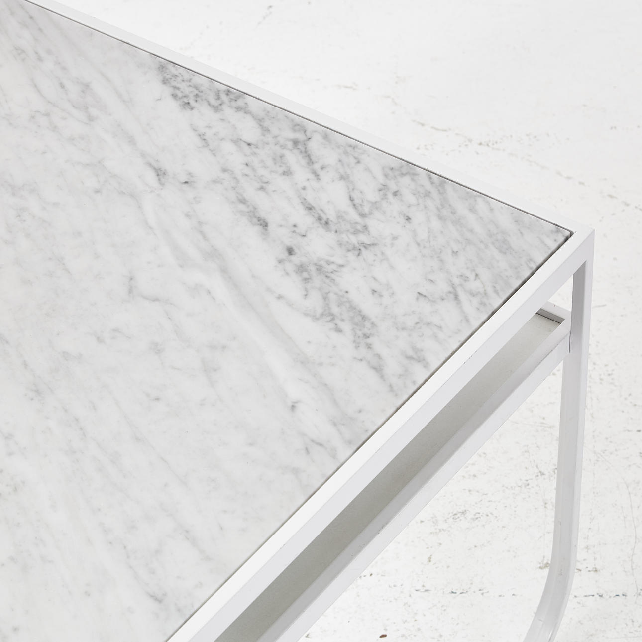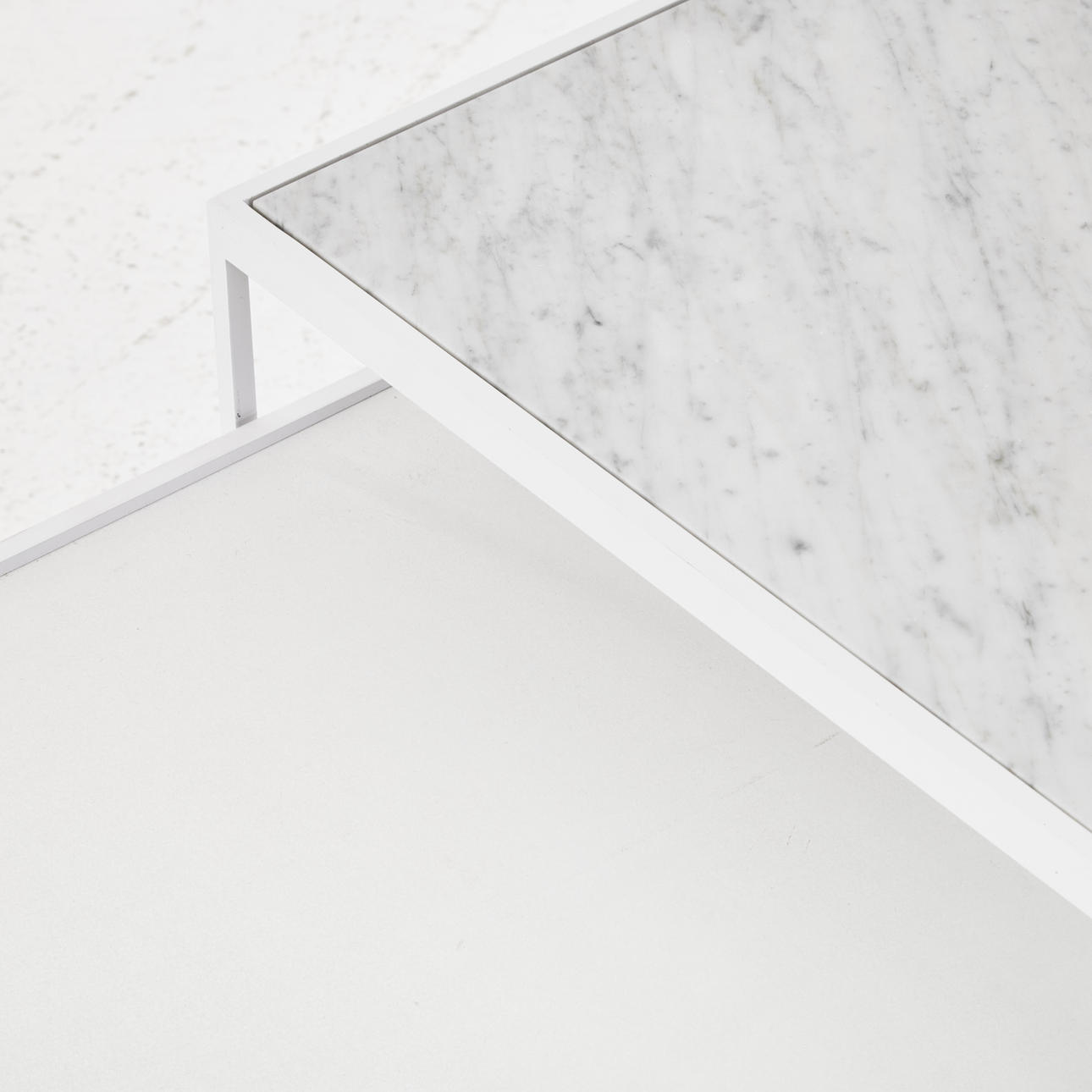 Two-piece lacquered steel frame with carrara marble and white laminate boards, height 61 and 40 cm respectively, boards 64x64 and 61x64 cm respectively.
