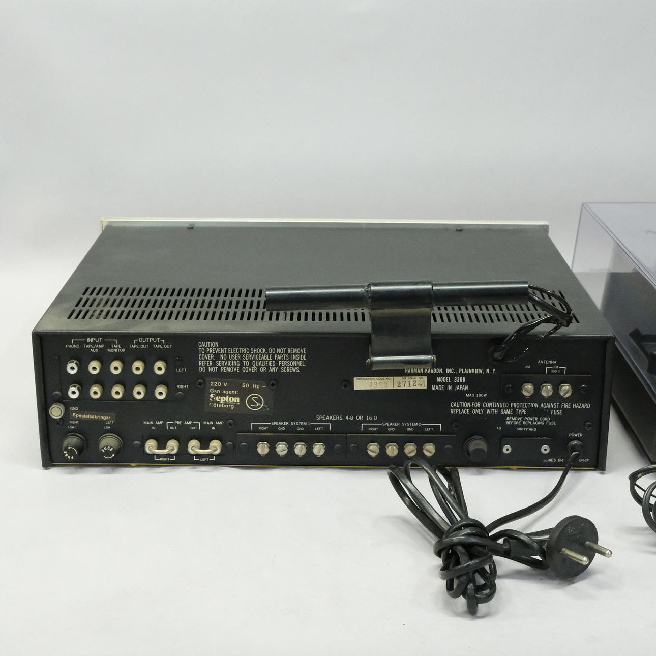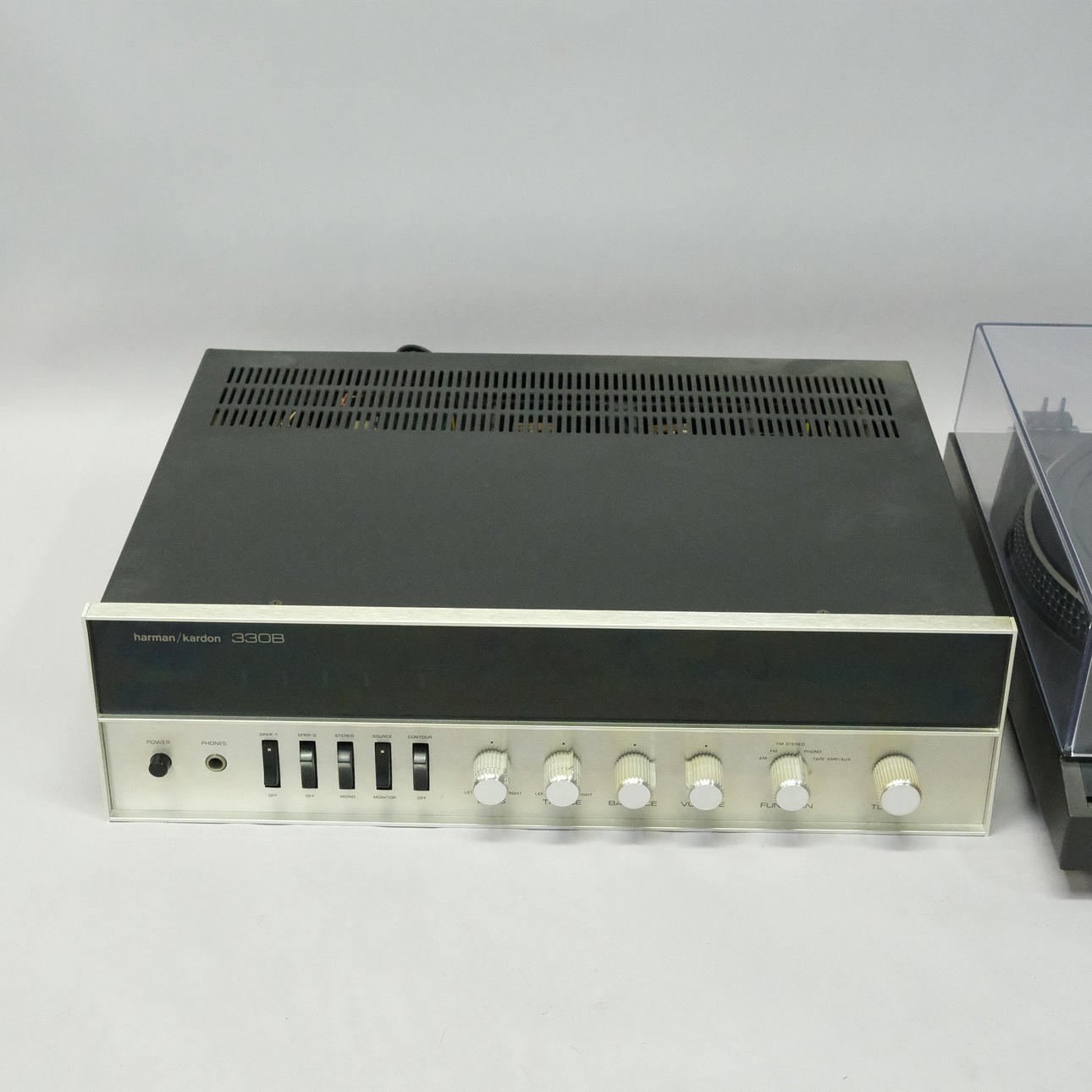 Harman Kardon amplifier, 330 B, dimensions 41 x 30 cm, height 11 cm.