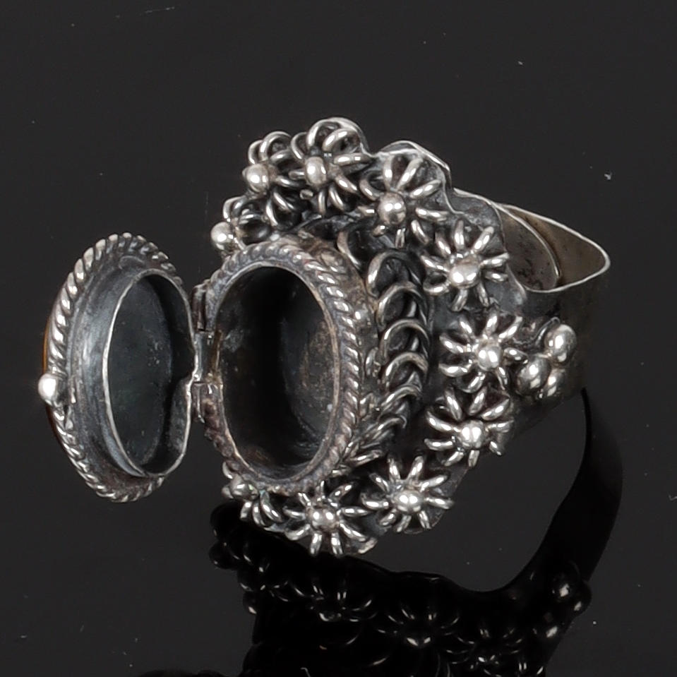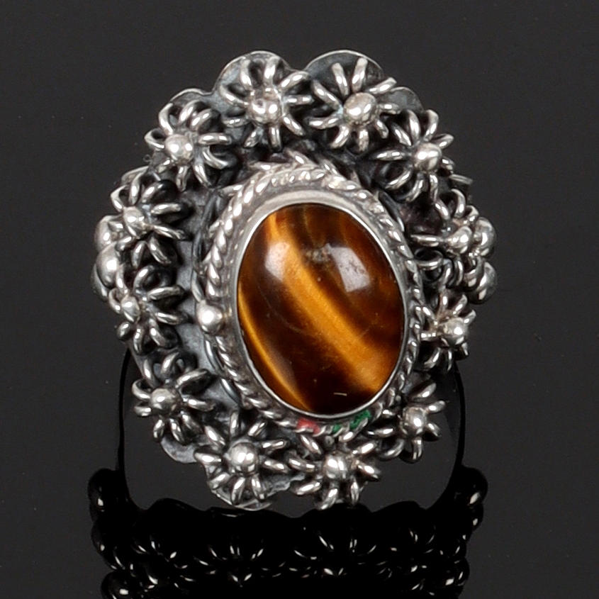 4535194. SILVER RING, tiger's eye, openable hide.