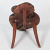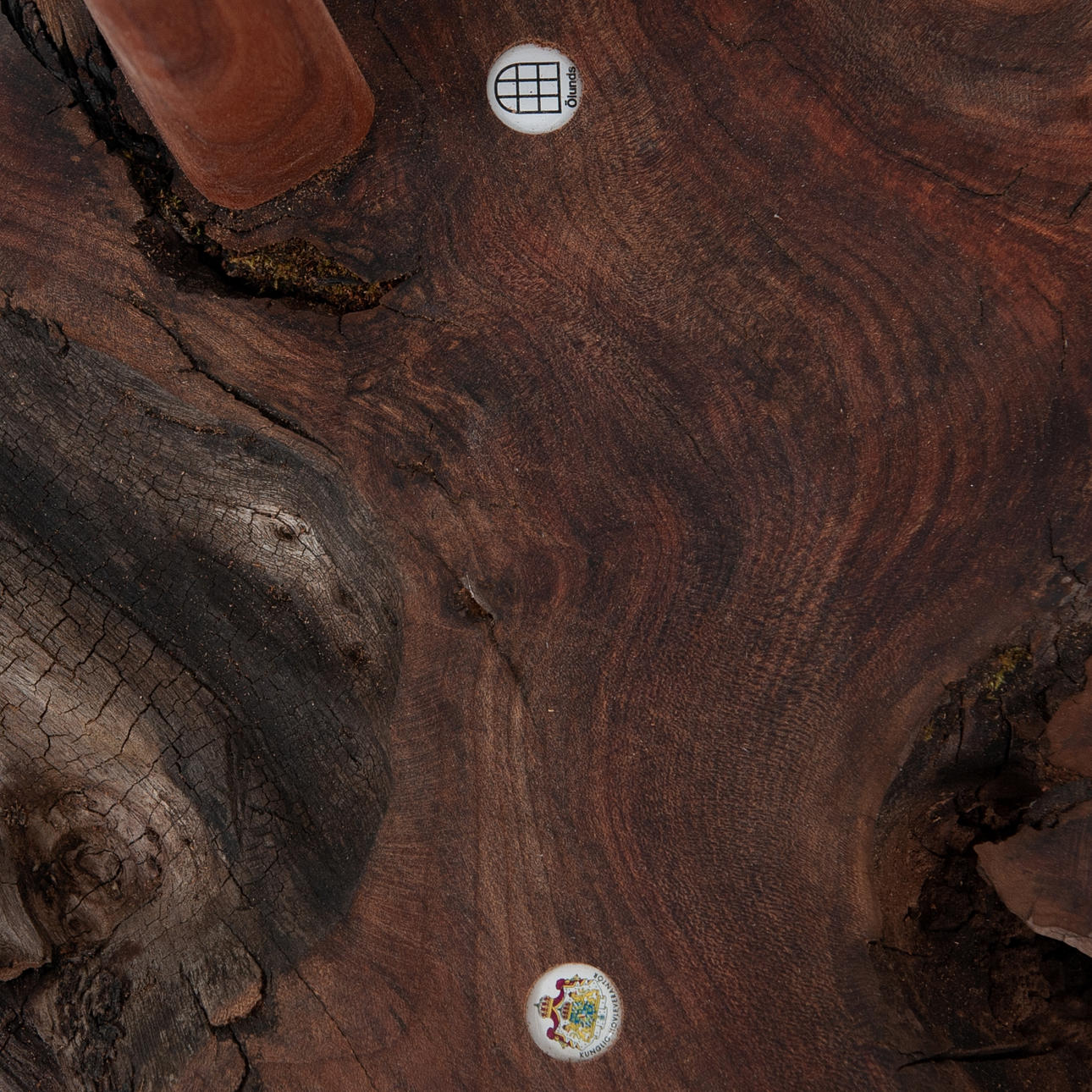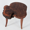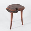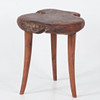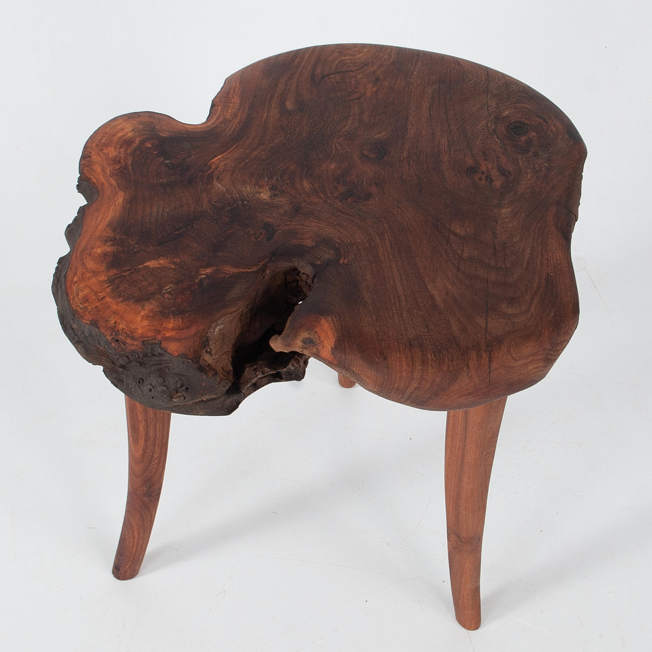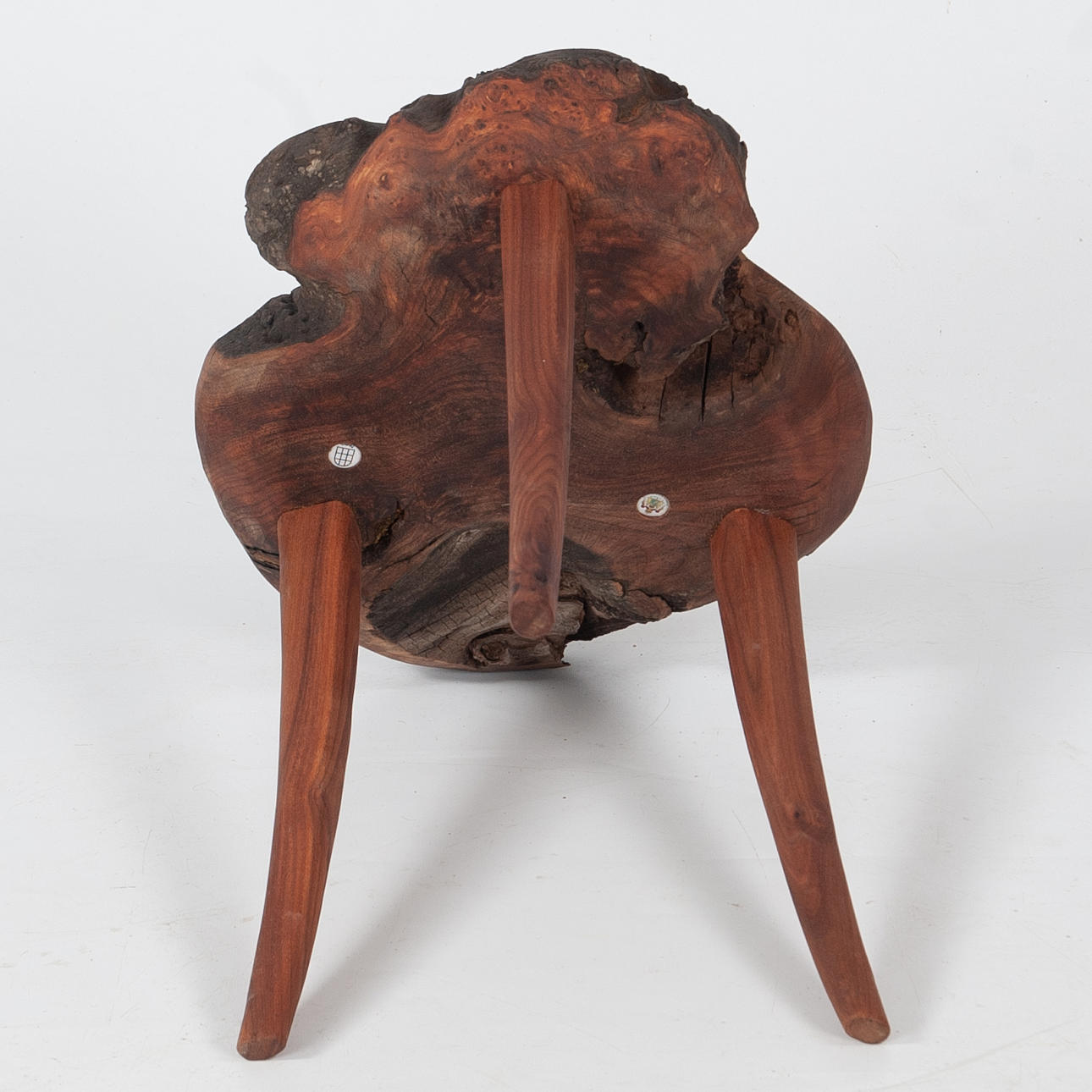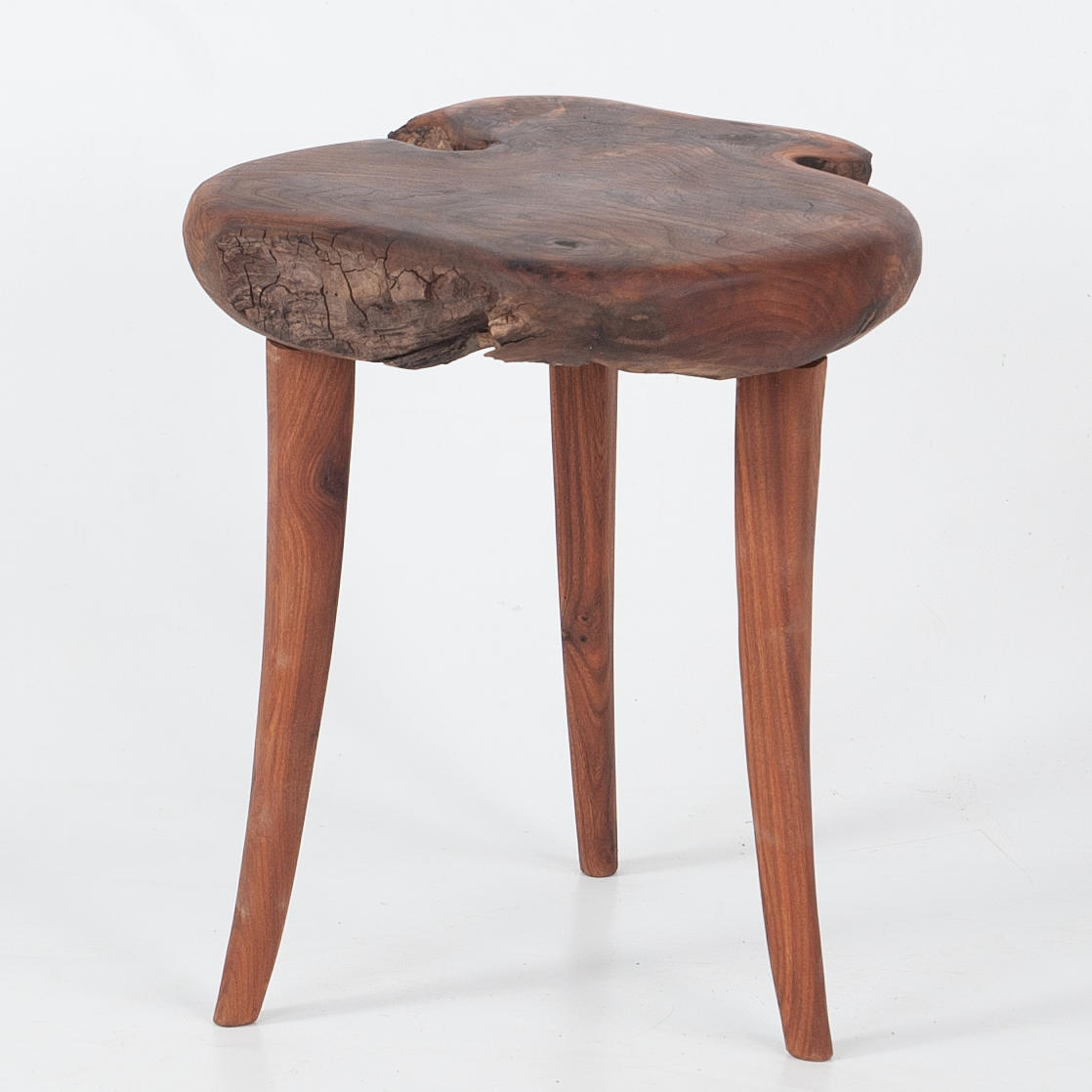 Stool in elm with organically shaped seat made of elm. Three turned legs. Drawing inspiration from George Nakashima and Josef Frank, Anders Ölund creates unique works where each object is based on the natural shape and texture of wood. Each work is unique. Height approx. 48 cm, diameter (organic form) approx. 46 cm. Marked Ölunds and royal court supplier.