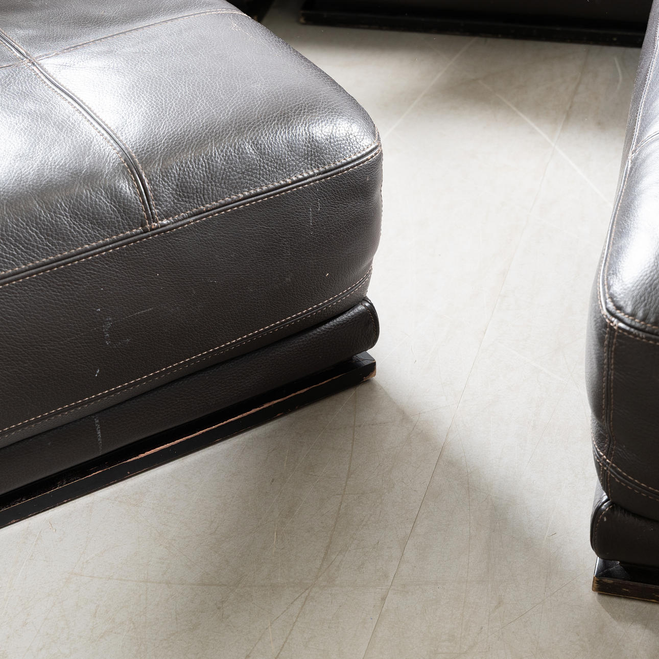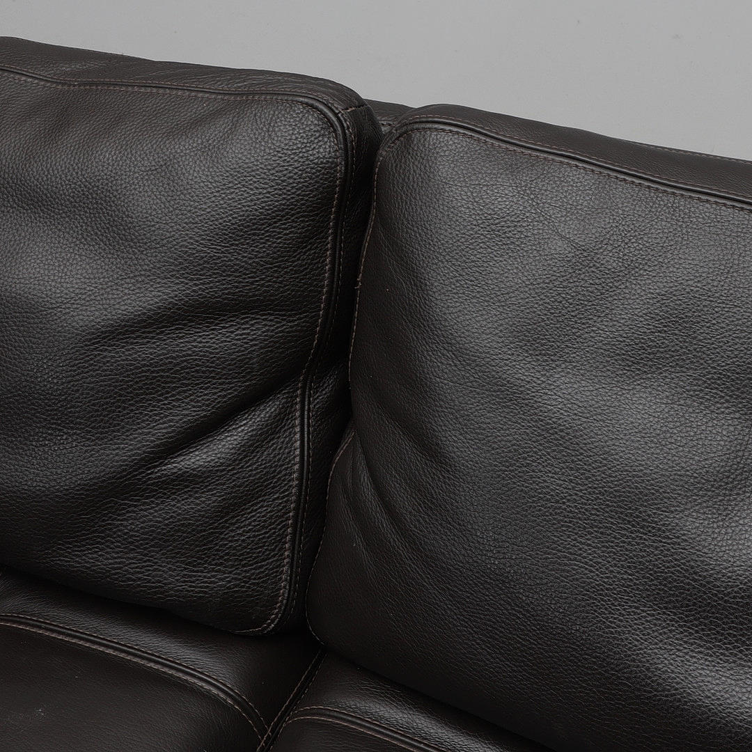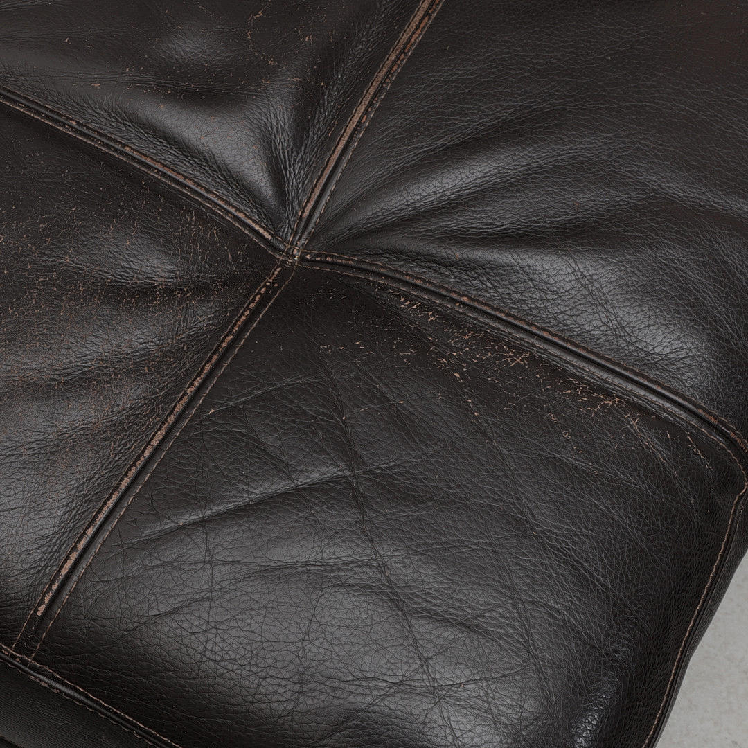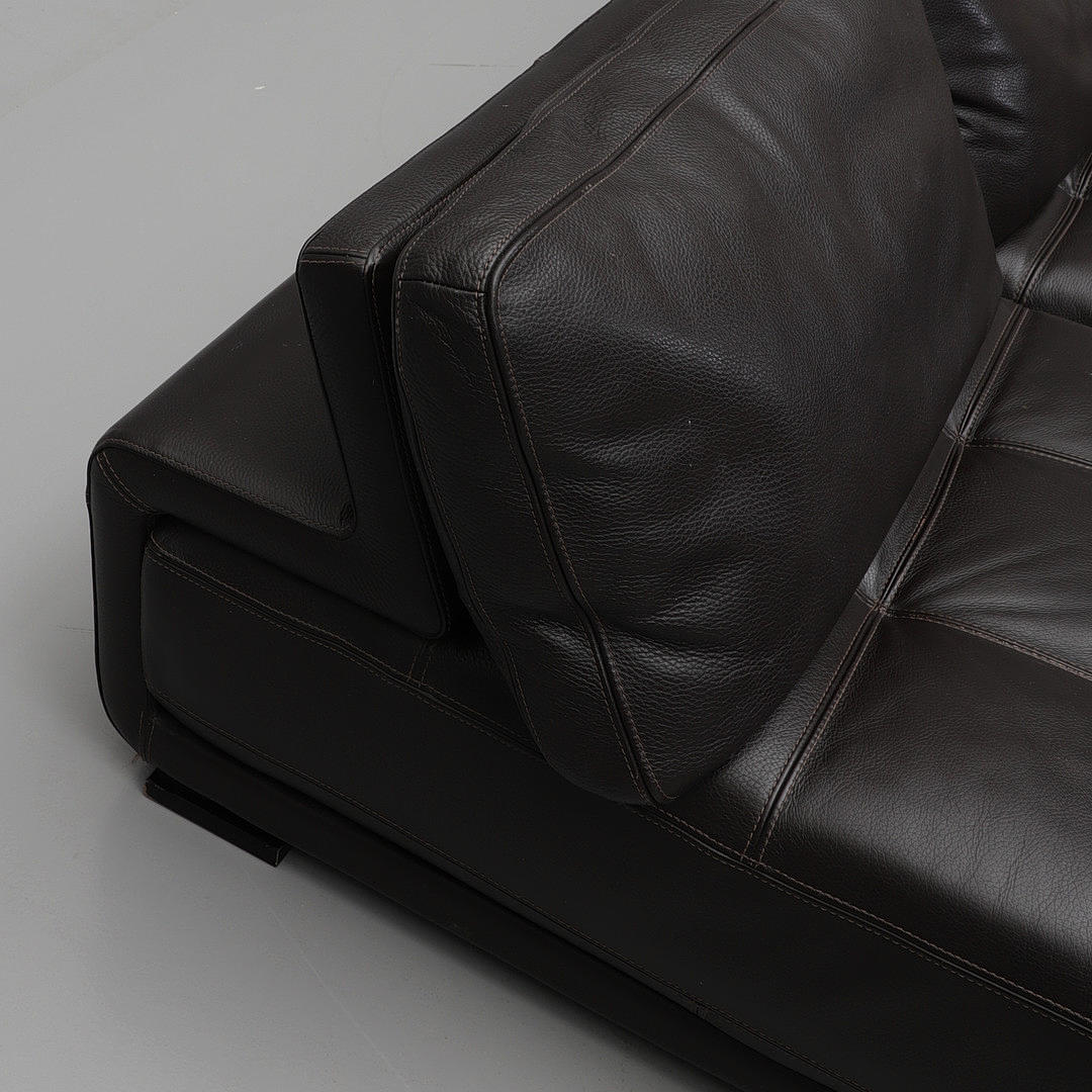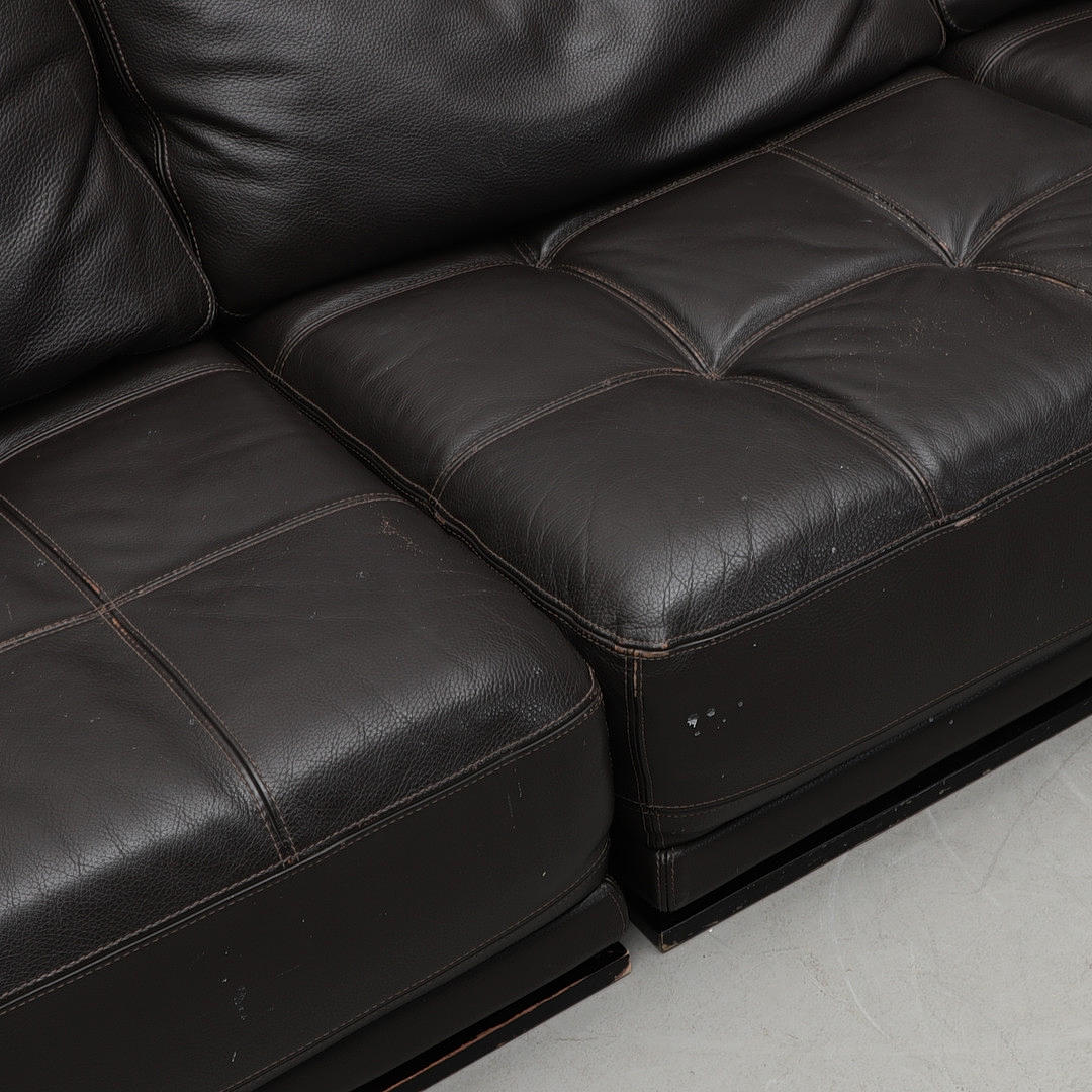 Upholstery in leather, frame in black lacquered wood.