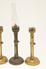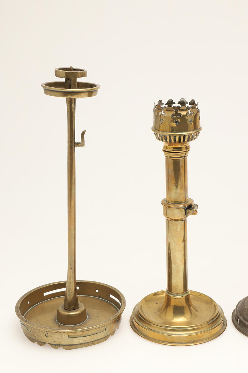 A pair of late Victorian brass hinged and adjustable candle holders (height 28cm), together with another with a glass flute (total height 44.5cm). Brass pricket candlestick (height 32cm). (4).
